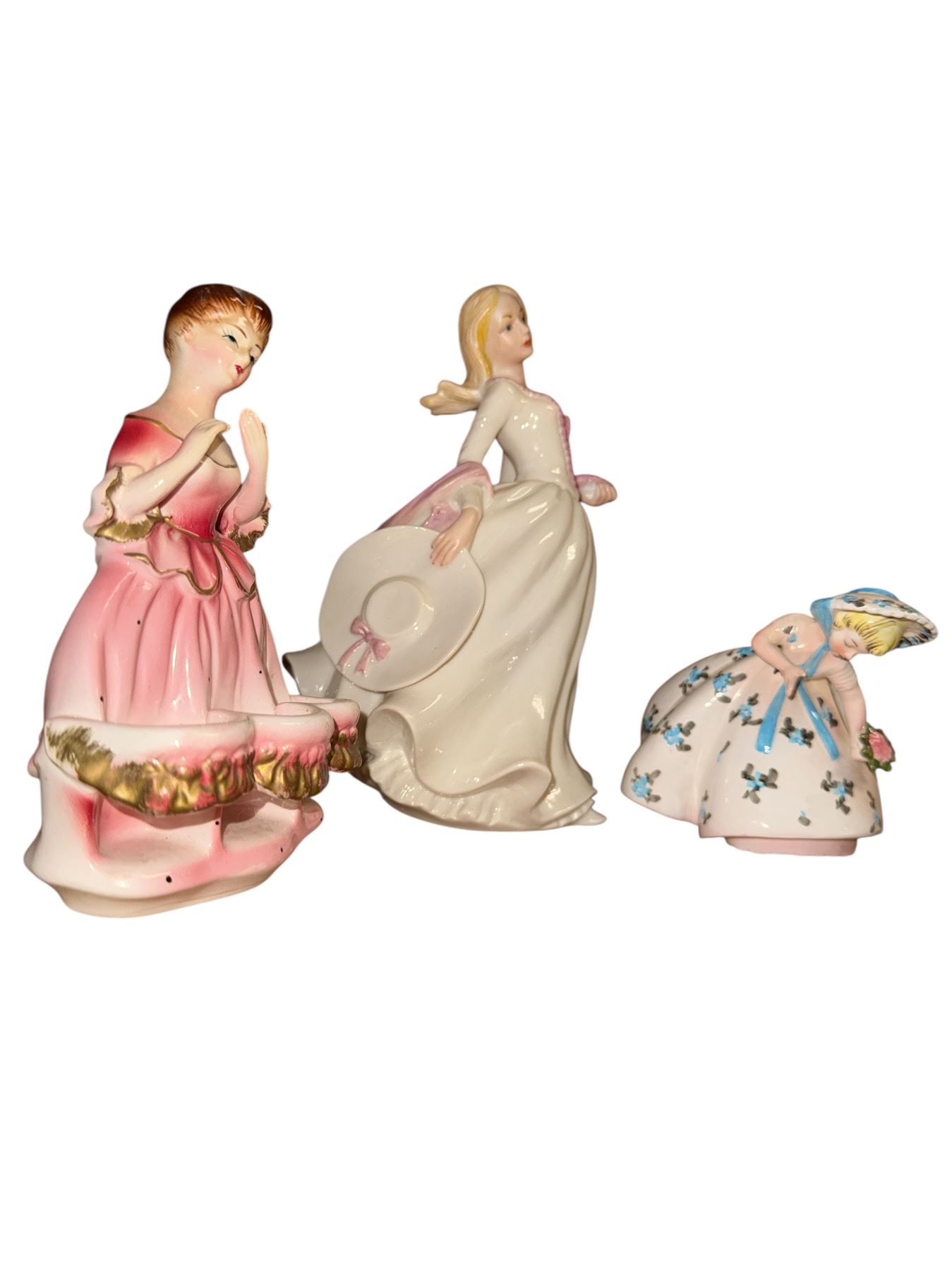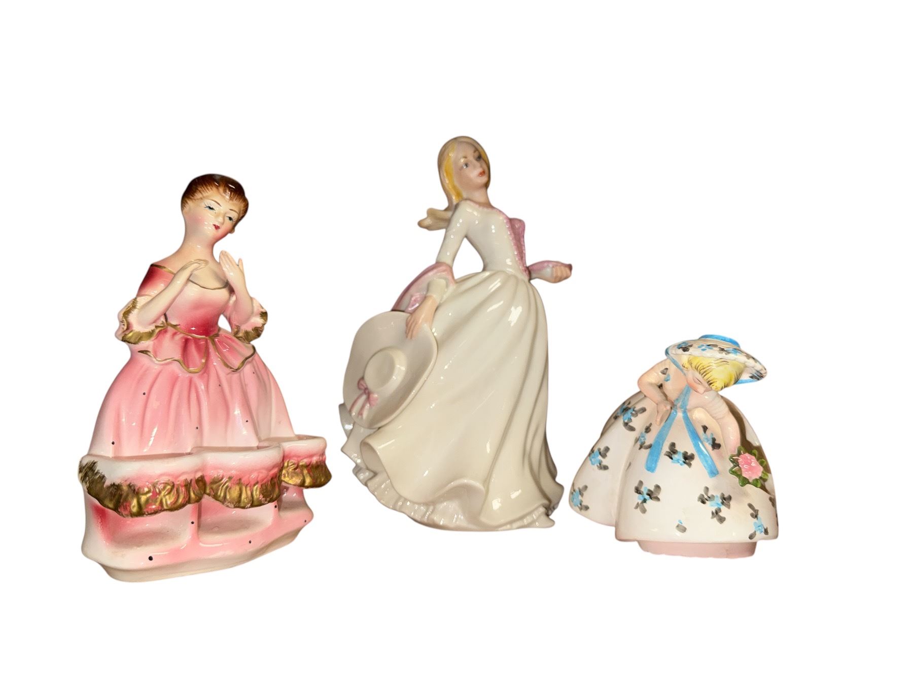 Lot of 3 Vintage Porcelain Victorian Lady Figurines - Pink Ballerina Planter, Elegant Standing Lady & Floral Crinoline Girl