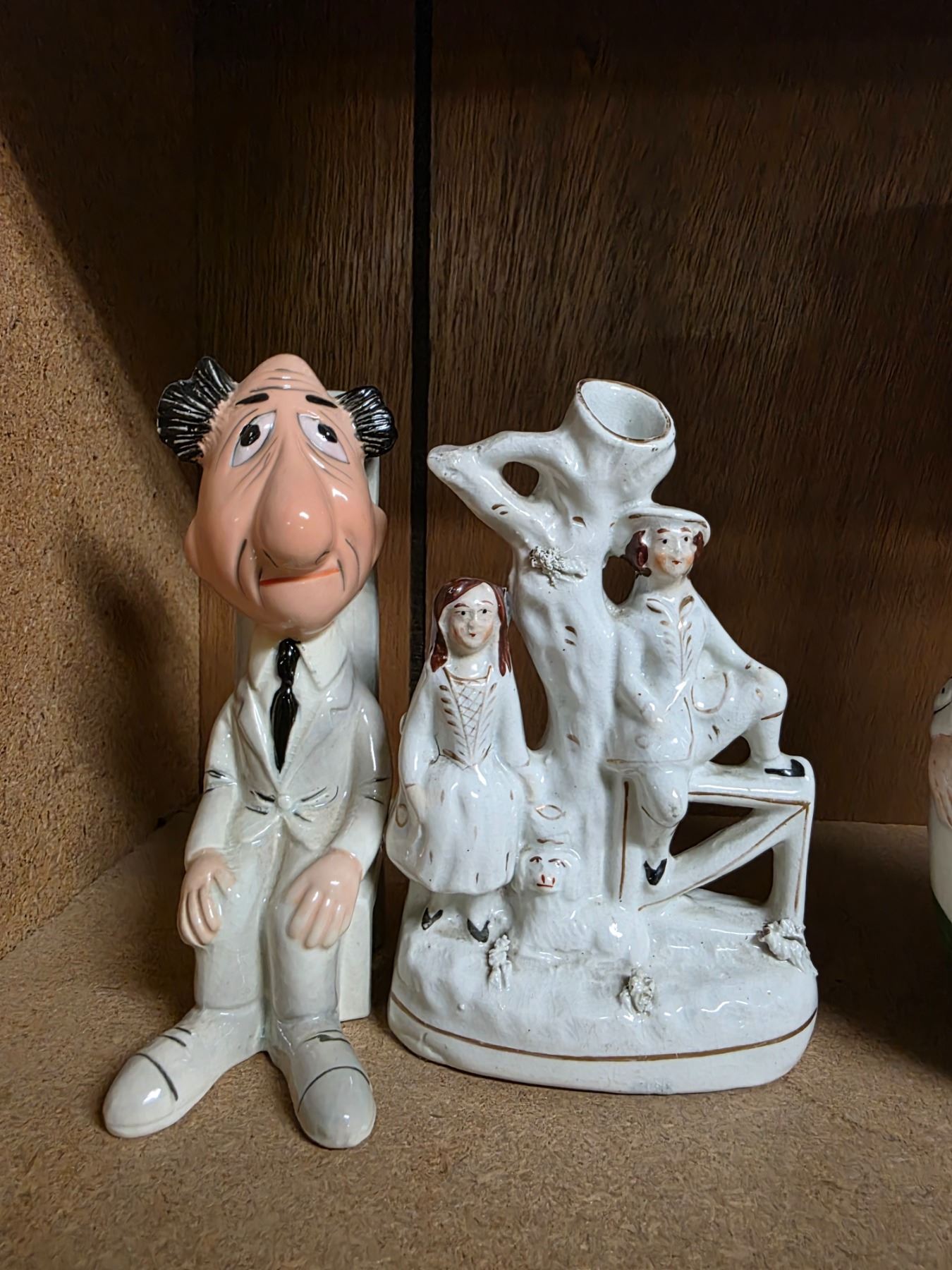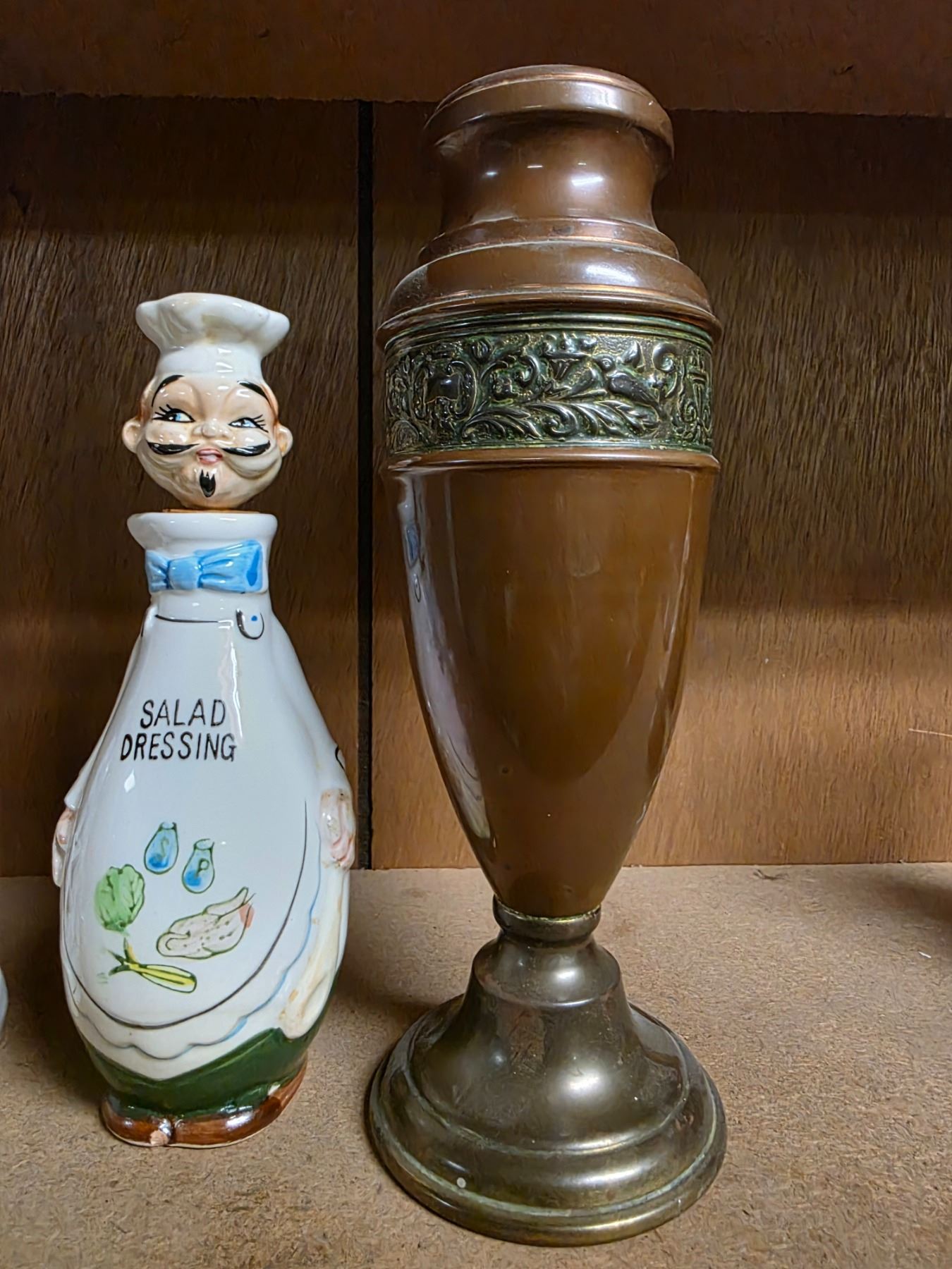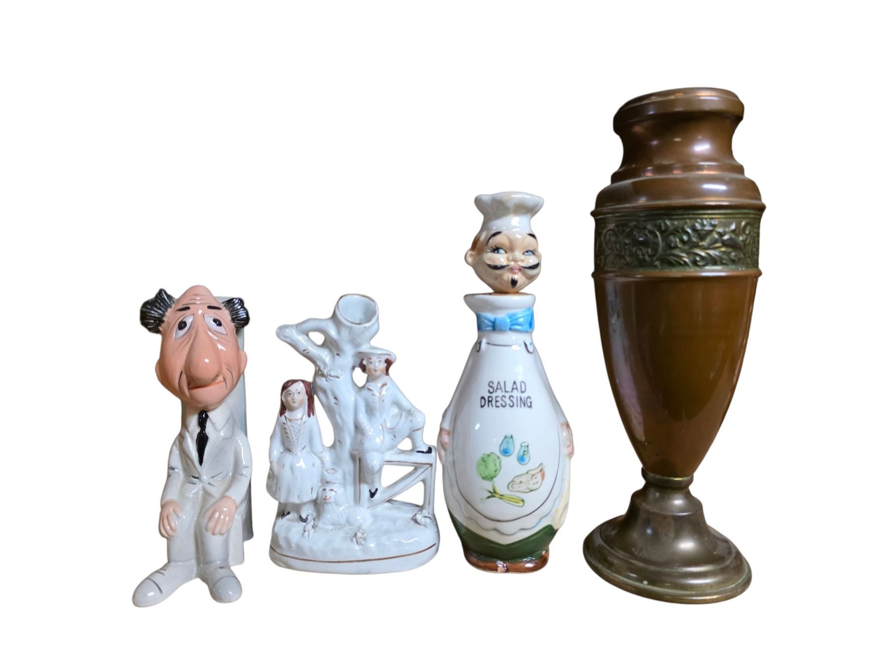 Lot of 4 Vintage Items - Comic Caricature Figurine, Staffordshire-Style Group, Chef Salad Dressing Bottle & Brass Urn Vase
