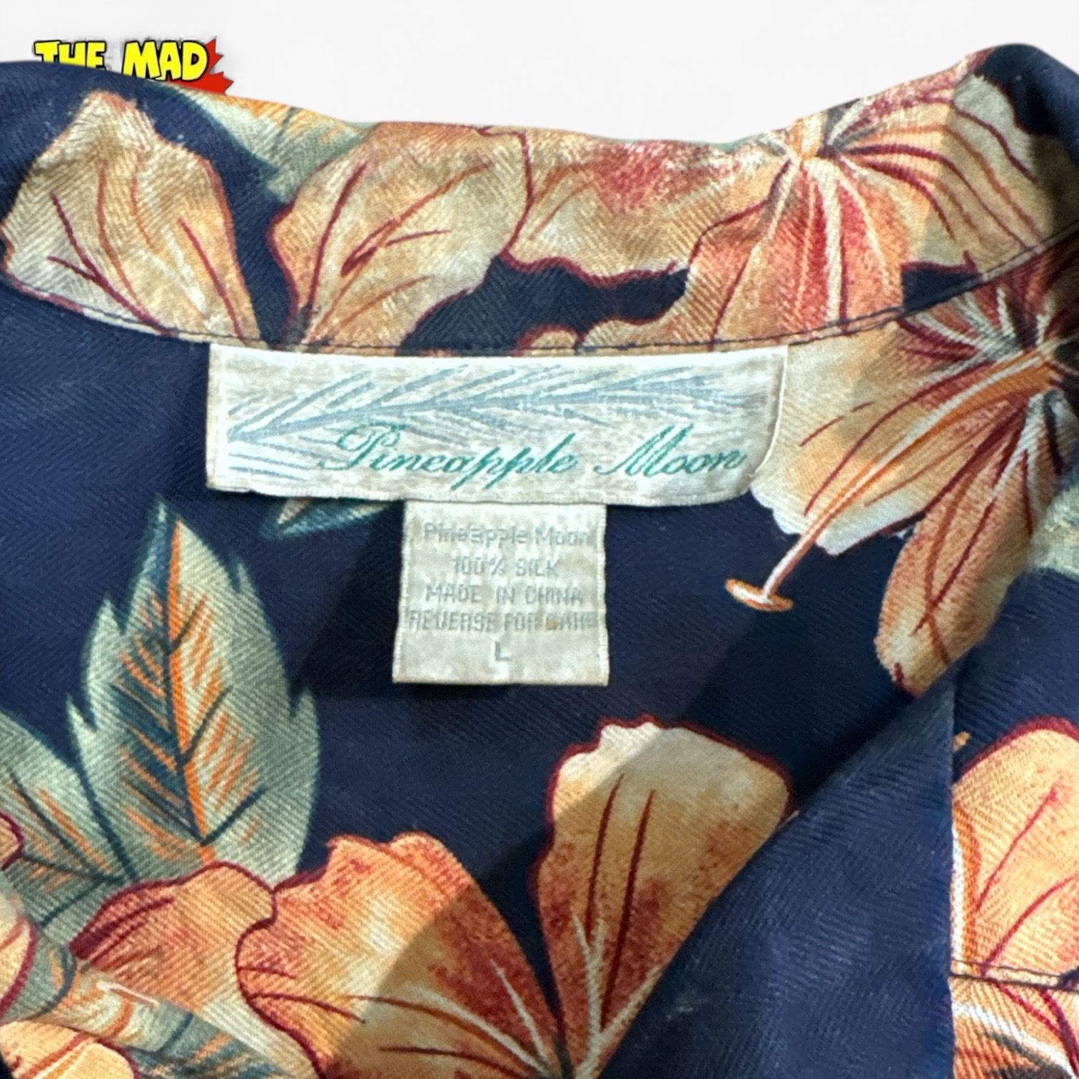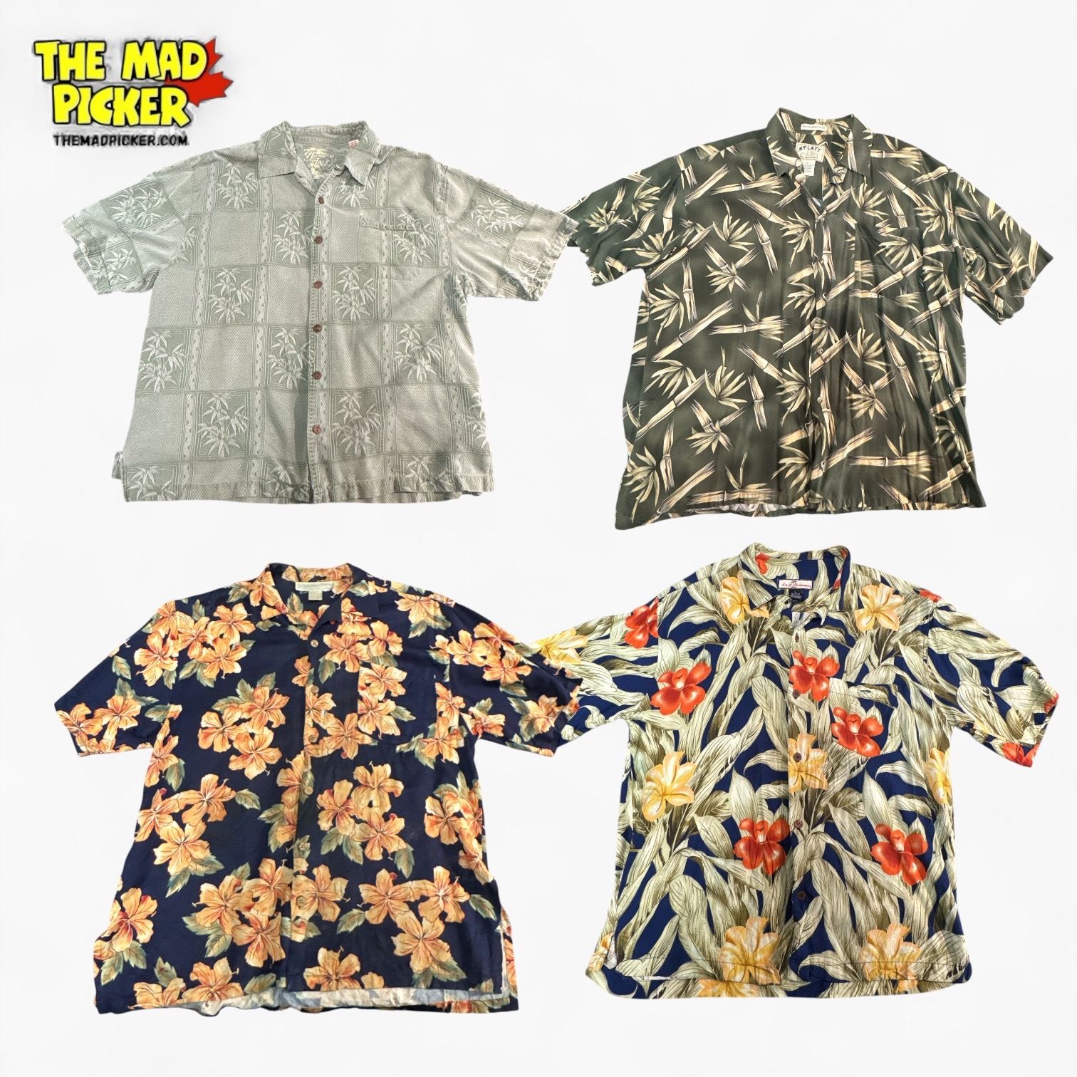 Lot includes 4 vintage men's Hawaiian shirts in sizes L and XL. Brands/designers are Jamaica Jaxx, S&D Bahamas, Pineapple Moon, and Splatt. Features vibrant tropical patterns. A mix of button-up short-sleeve designs suitable for casual or vacation wear.