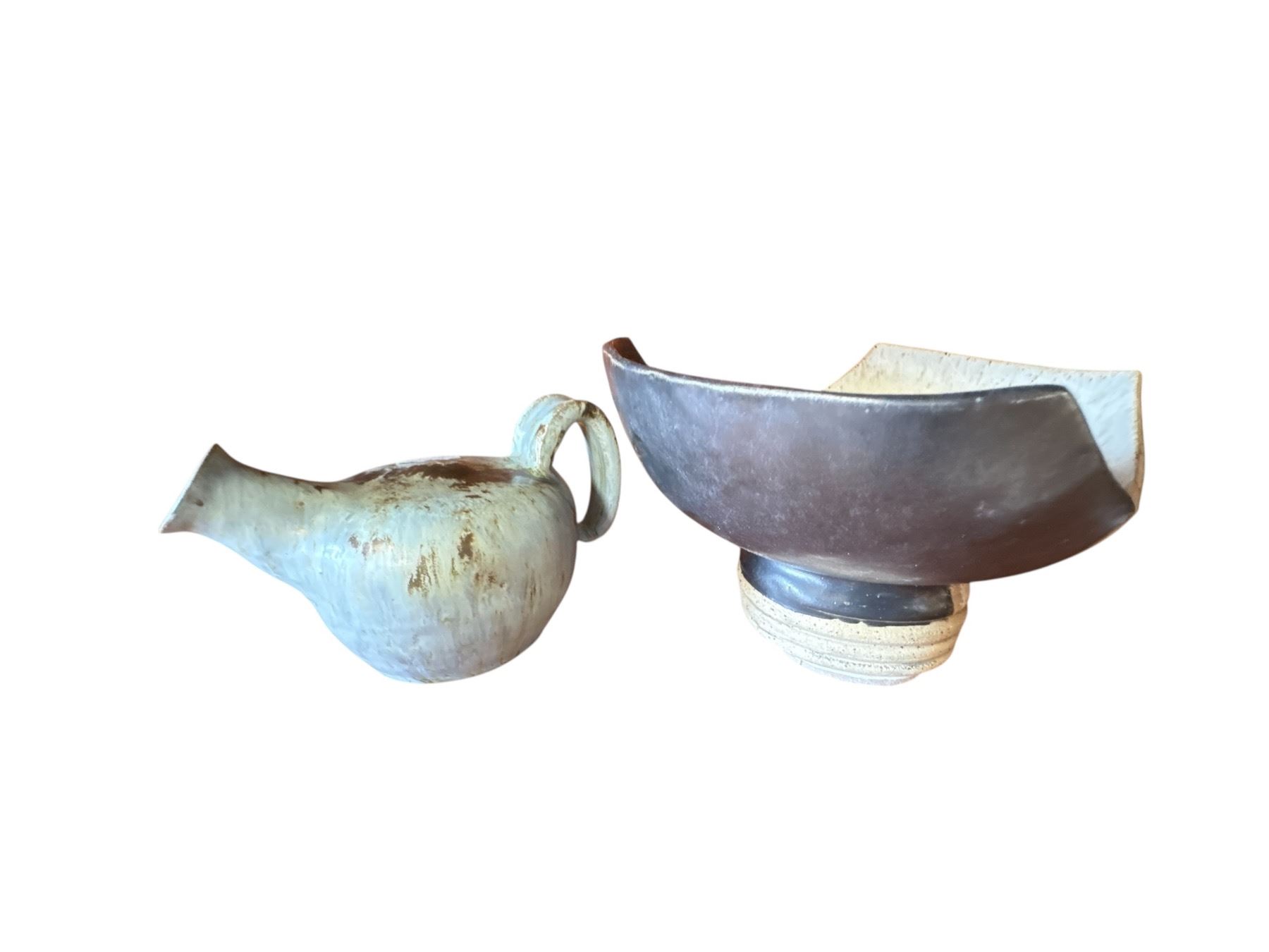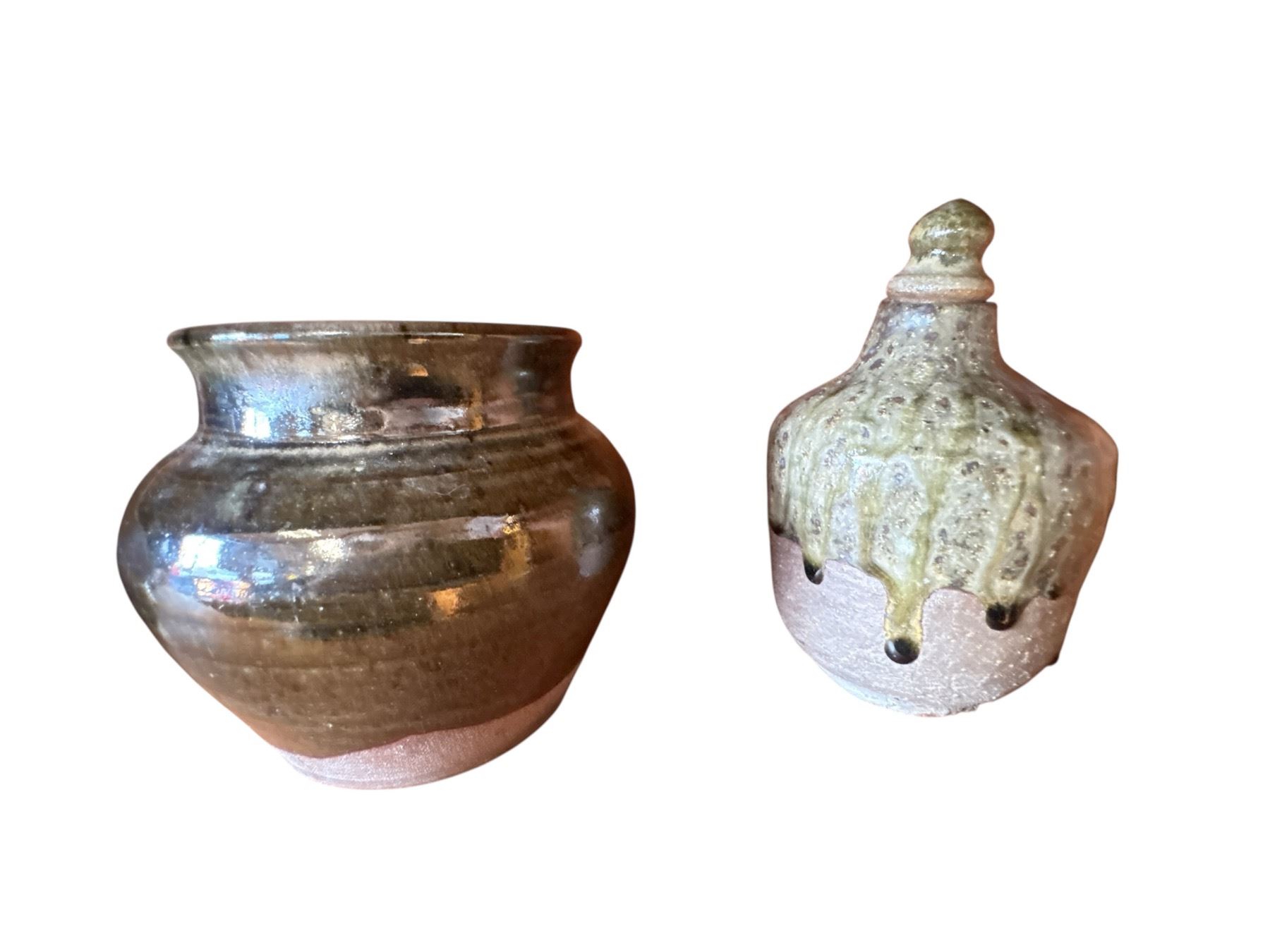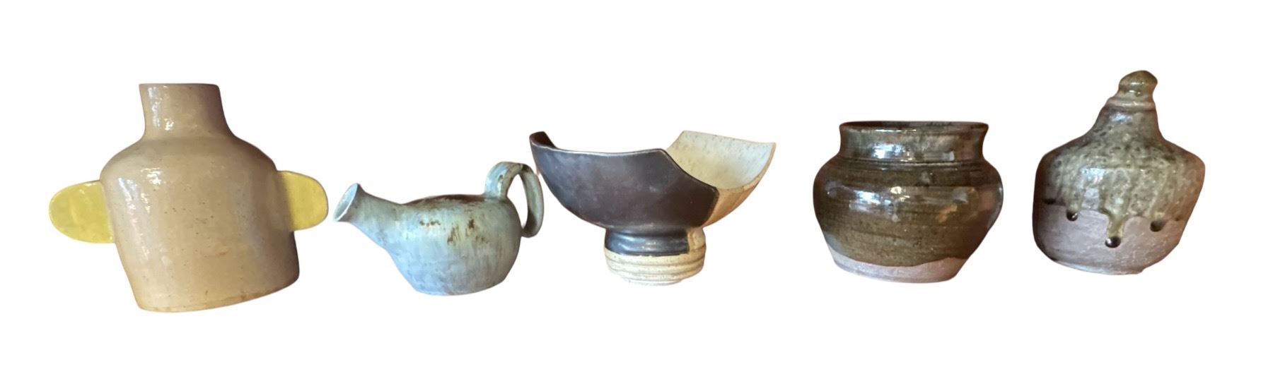 Lot of 5 studio pottery pieces including a jug, vases, and a bowl, featuring various glazes and styles. The tallest piece measures 6.5 inches. Pieces are a mix of Canadian and Japanese origins. Item is as pictured.