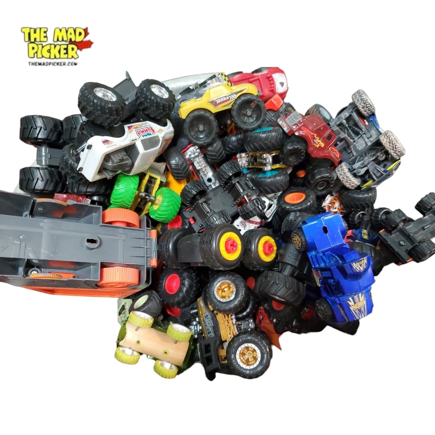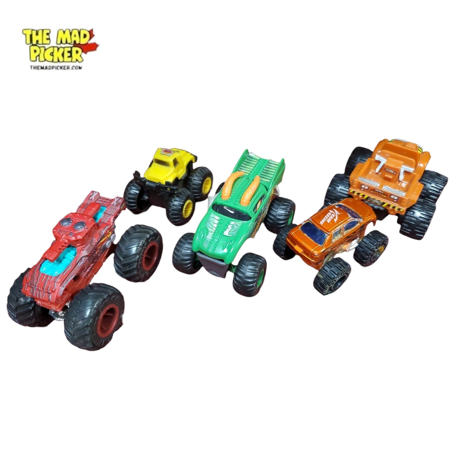 Collection of assorted monster truck toys including diecast and plastic models with varying designs and sizes. Includes a range of colors and details, suitable for play or display. The colander shown is for presentation purposes only and not included in the sale.