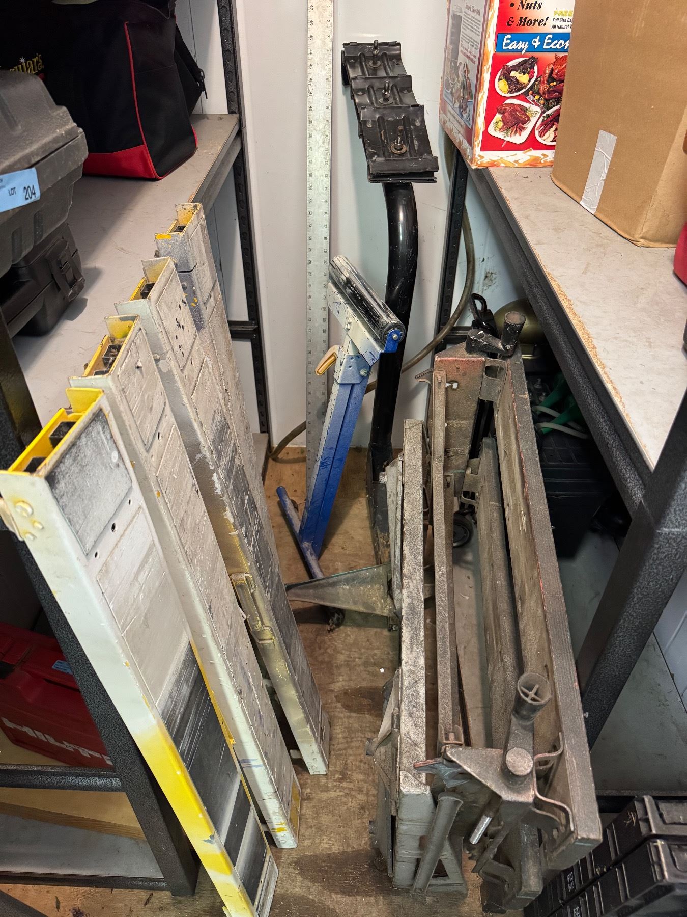 Lot of Metal Saw Horses, Bike Rack Steel Ruler, Folding Work Table and Fold Out Ramp