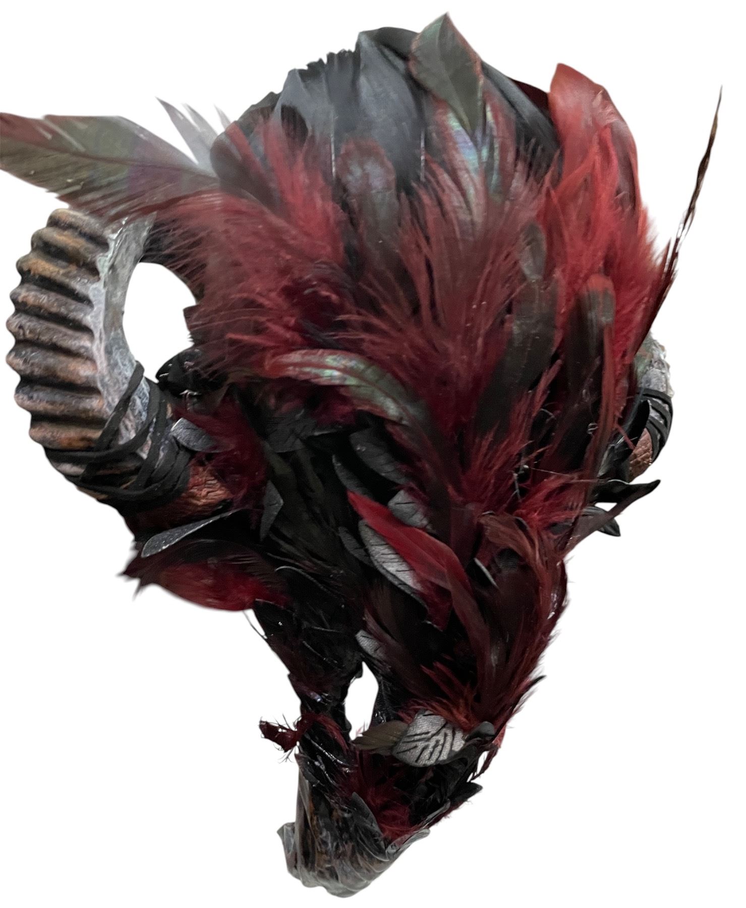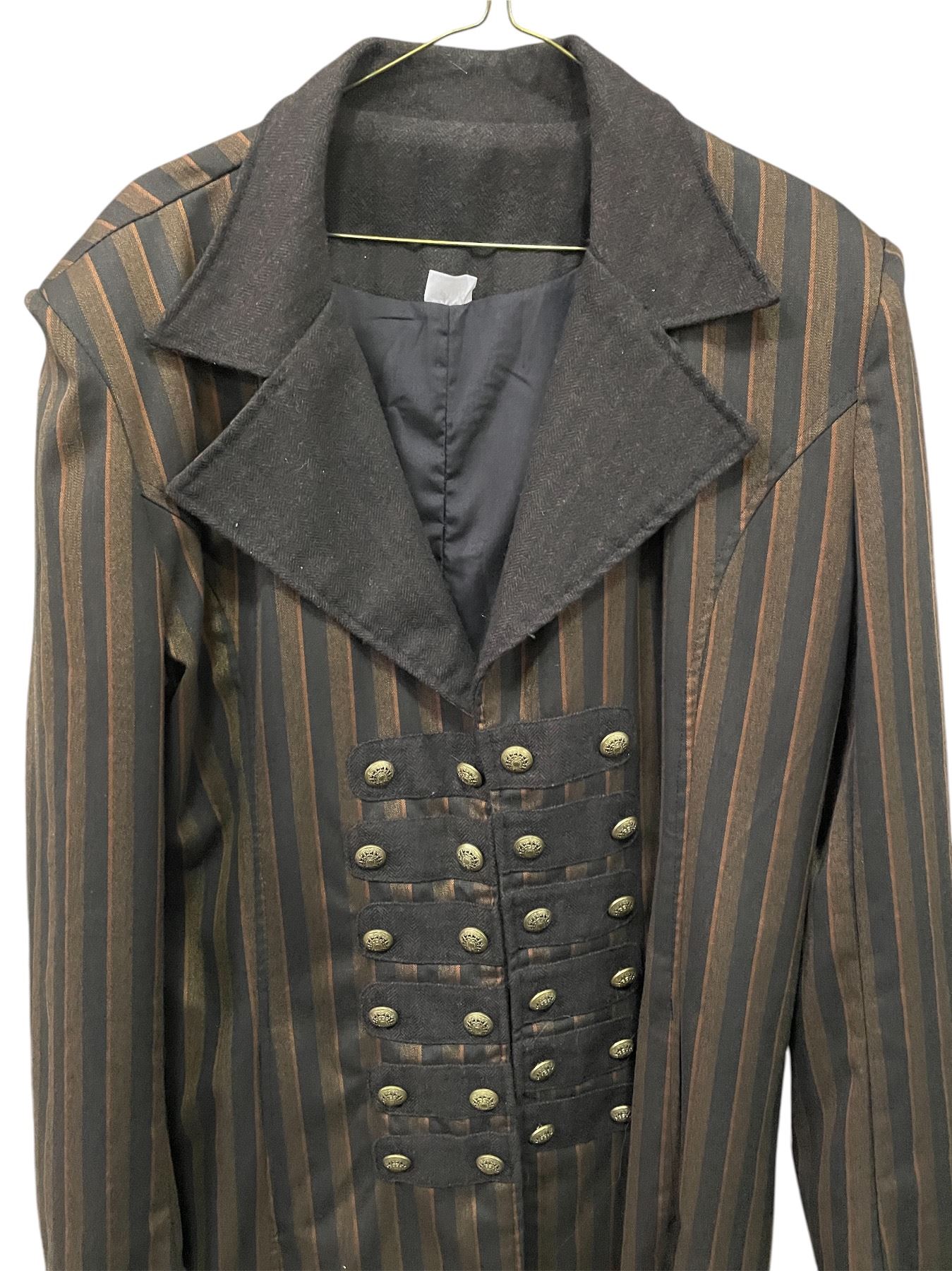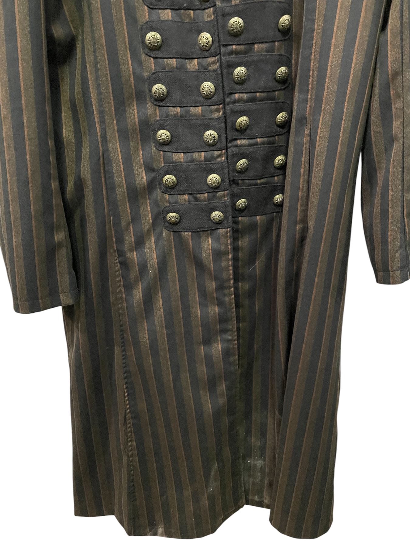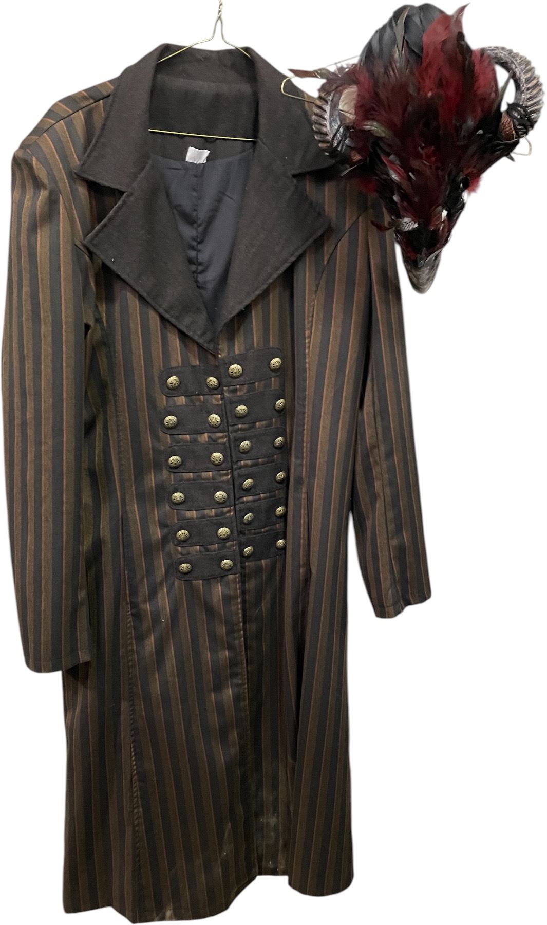 Lot of Theatrical Costume Pieces - Striped Military-Style Coat with Decorative Buttons & Feathered Horn Mask