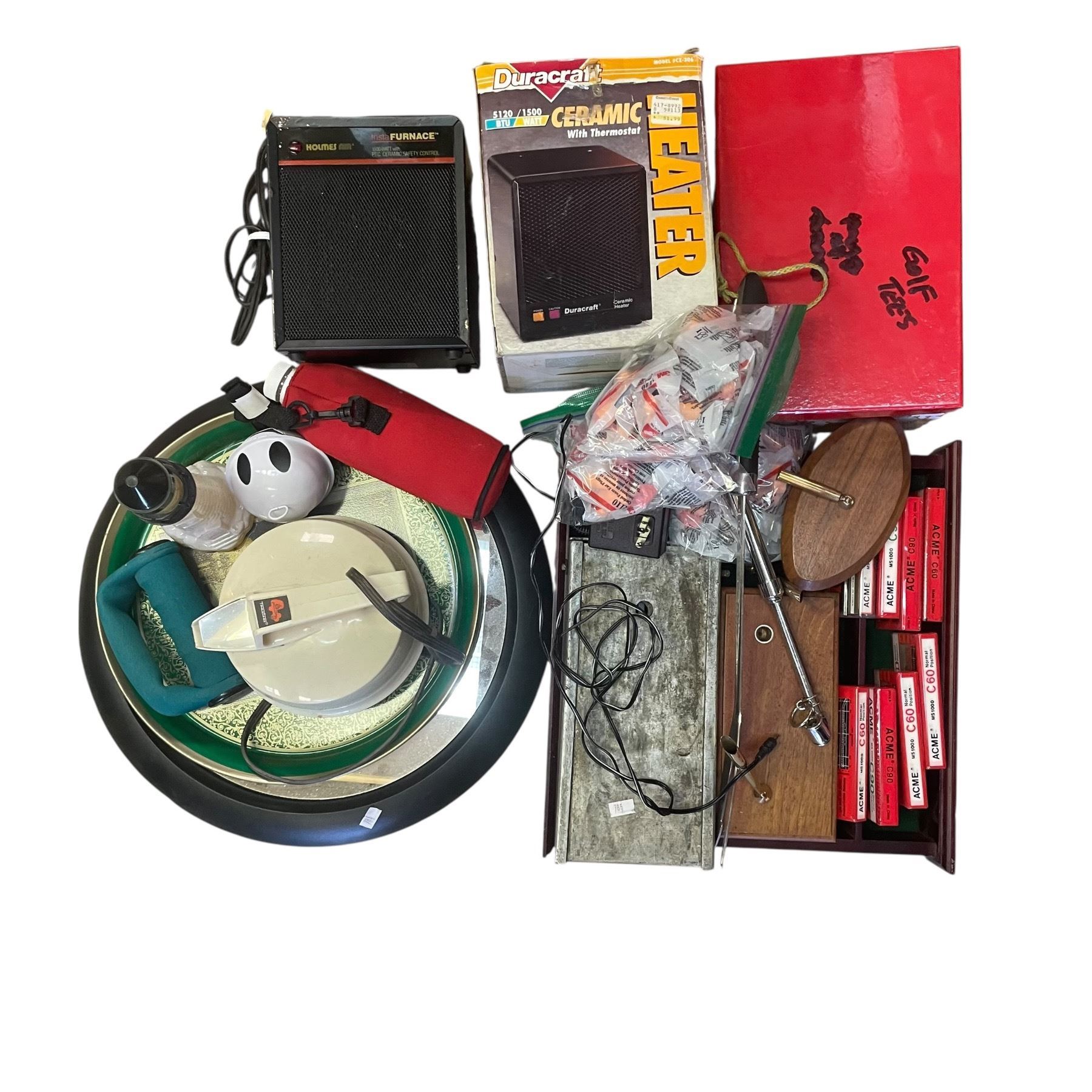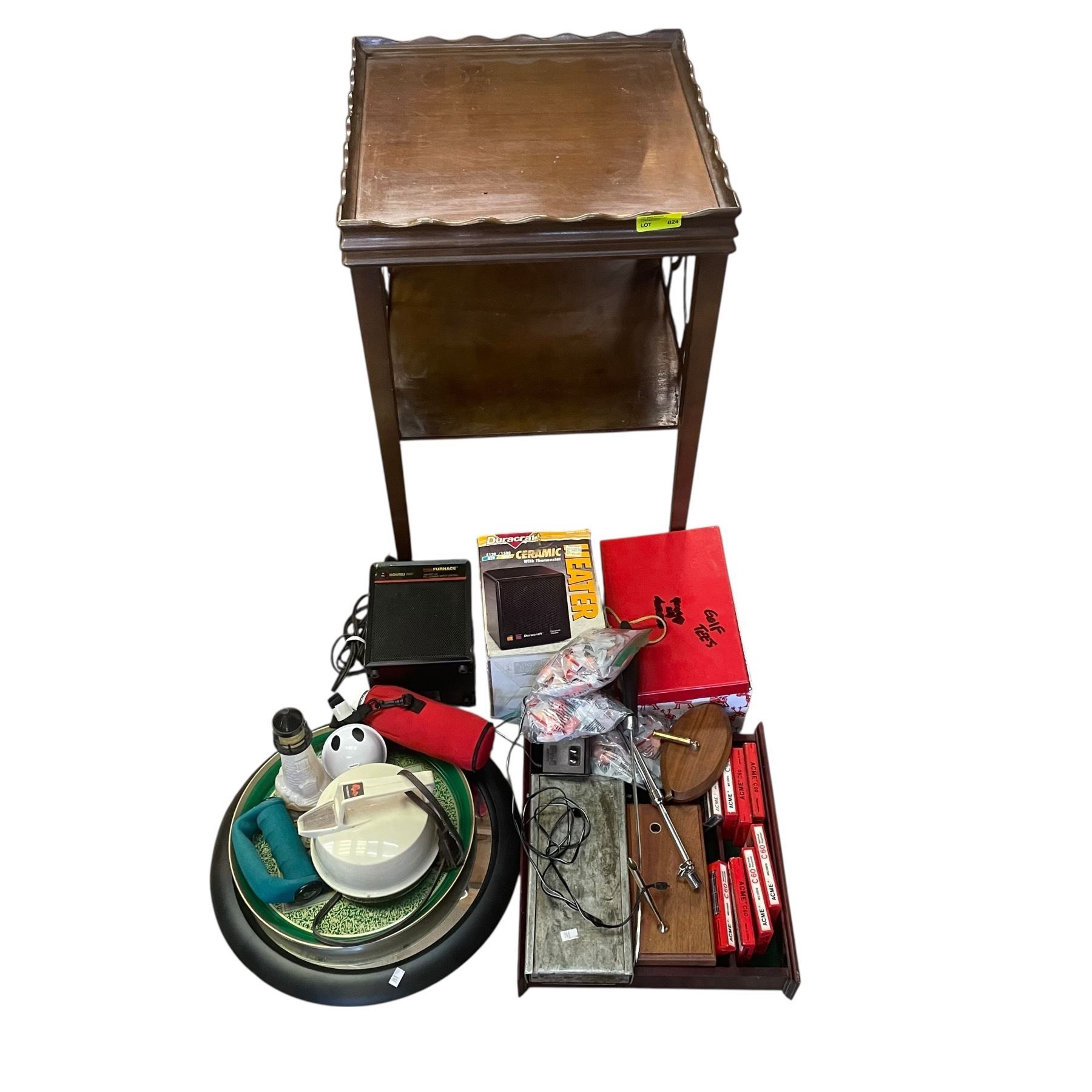 Lovely Wood Tapered Leg End Table with Assorted Home Goods (Mirror, kettle, heater, golf tees and more)
