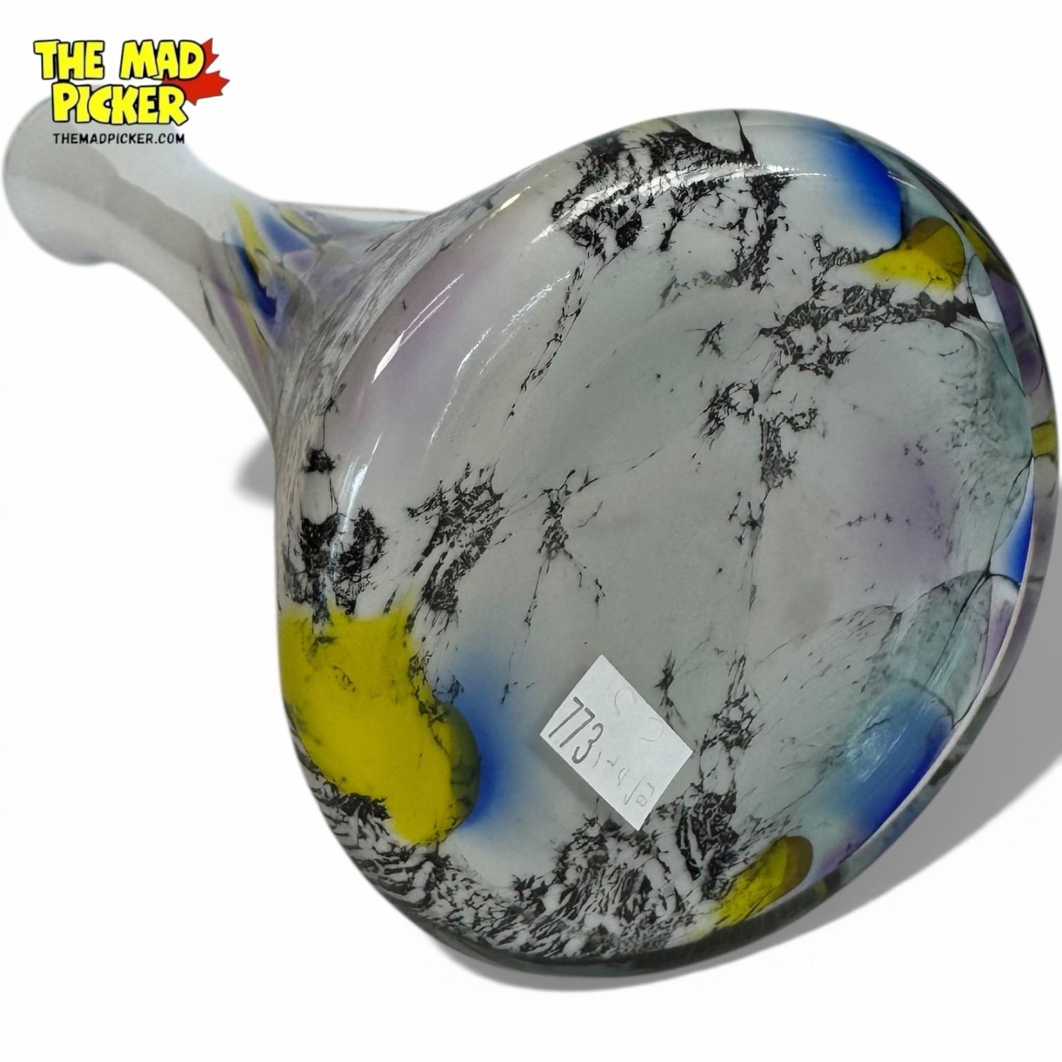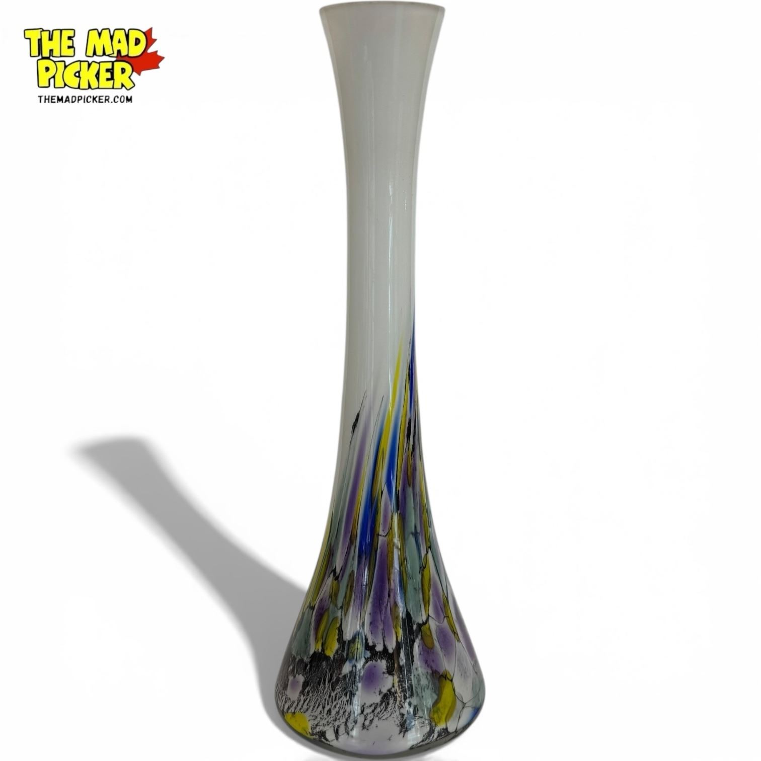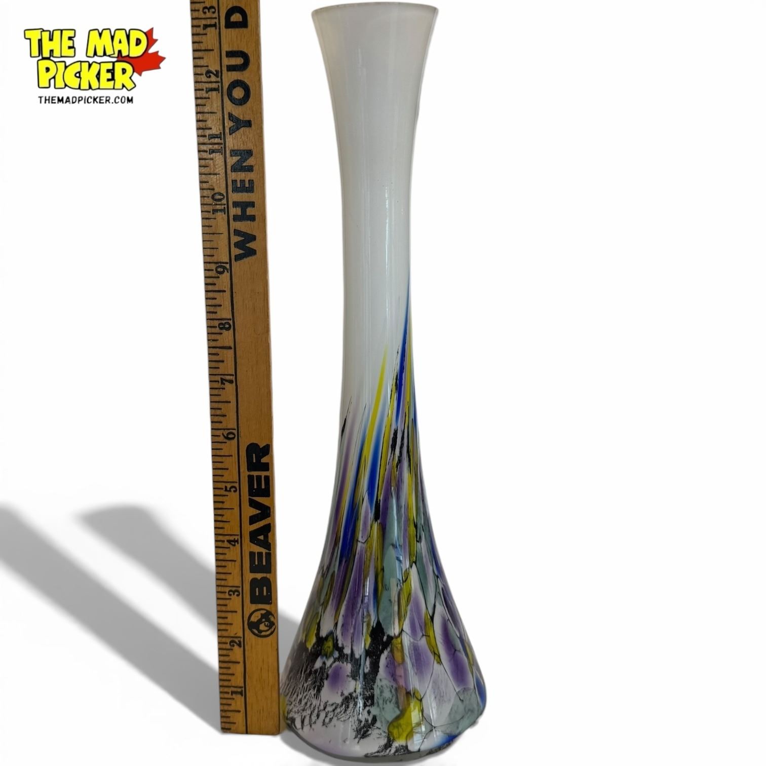 Lucyna Huta Szkla art glass flute vase in cobalt blue, purple, and white tones. Made in Poland, standing approximately 13 inches tall with an elegant elongated form. Known for its hand-blown artistry, showcasing fluid color transitions and distinctive craftsmanship.