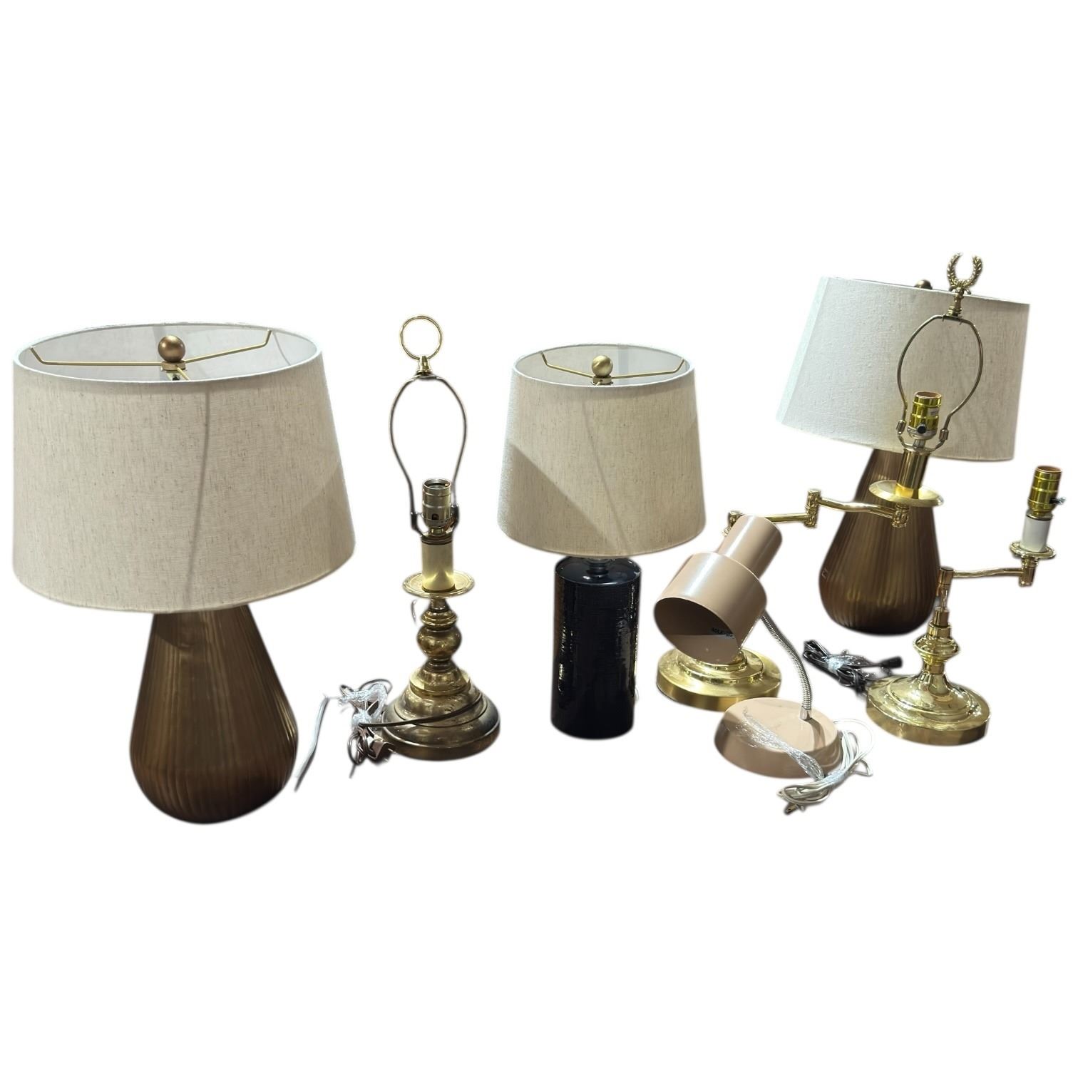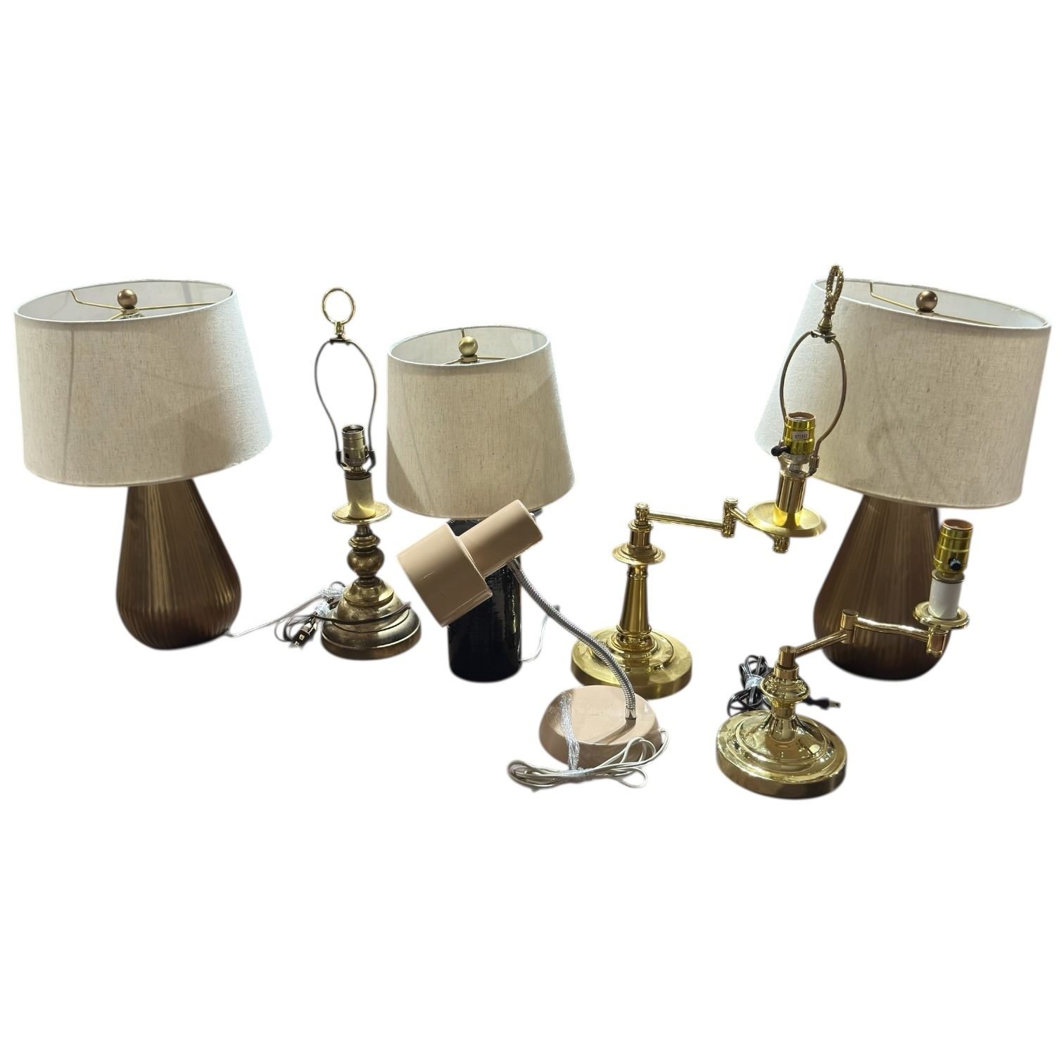 Lumen lot of 7 assorted lamps featuring swivel arm, brass, gooseneck, and modern styles. The tallest lamp measures 21-Inch. Includes various designs and finishes. Items are as pictured.