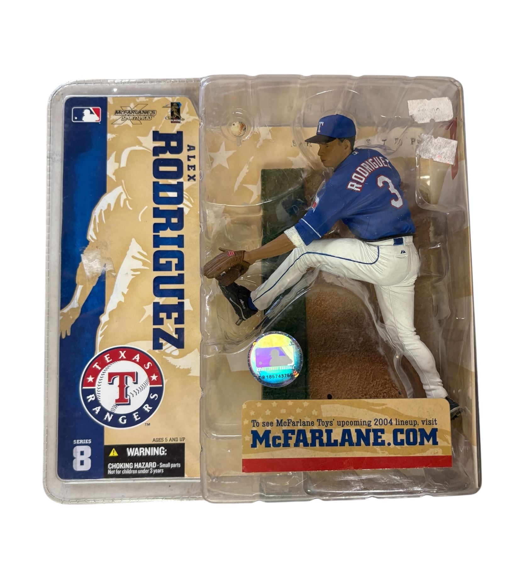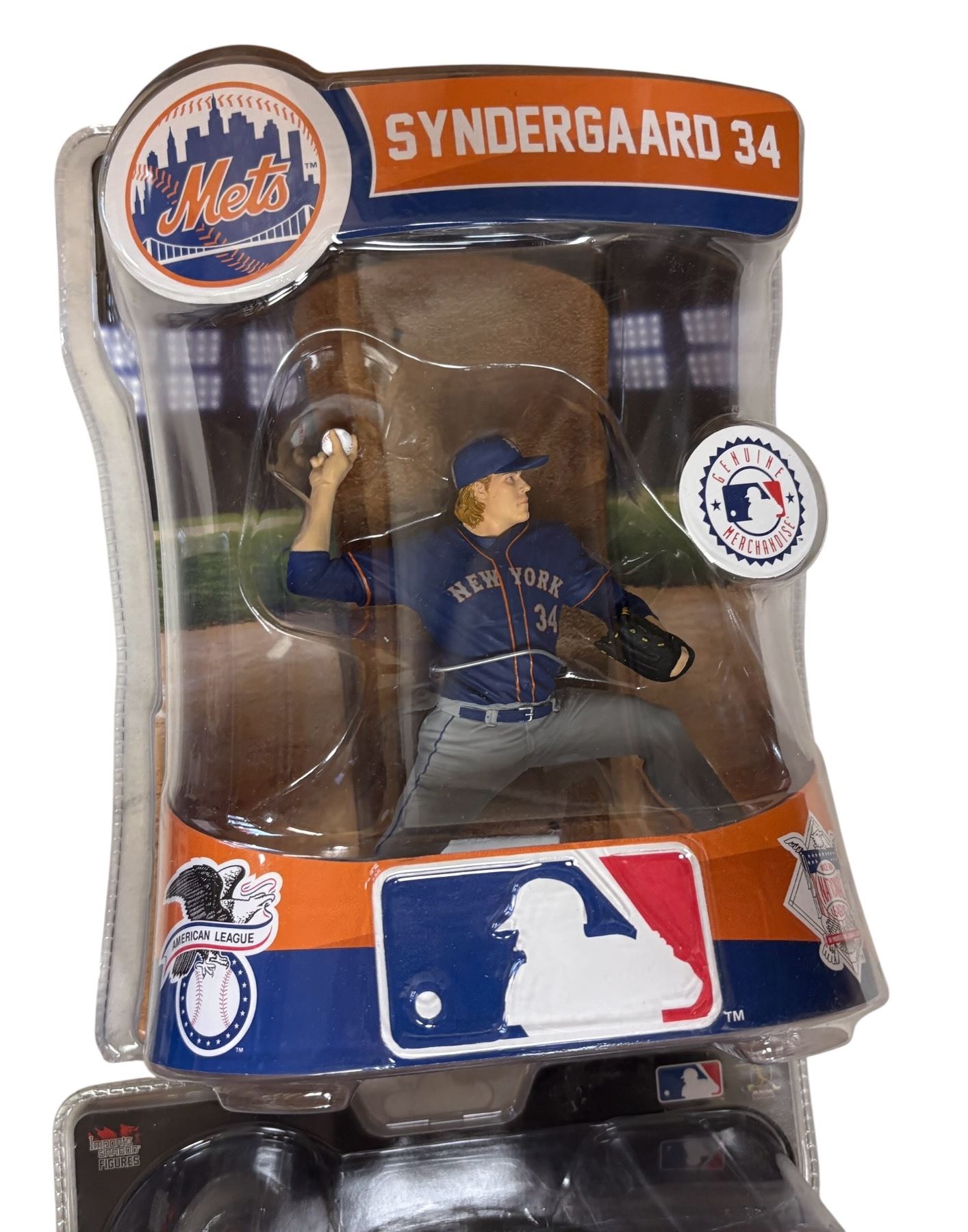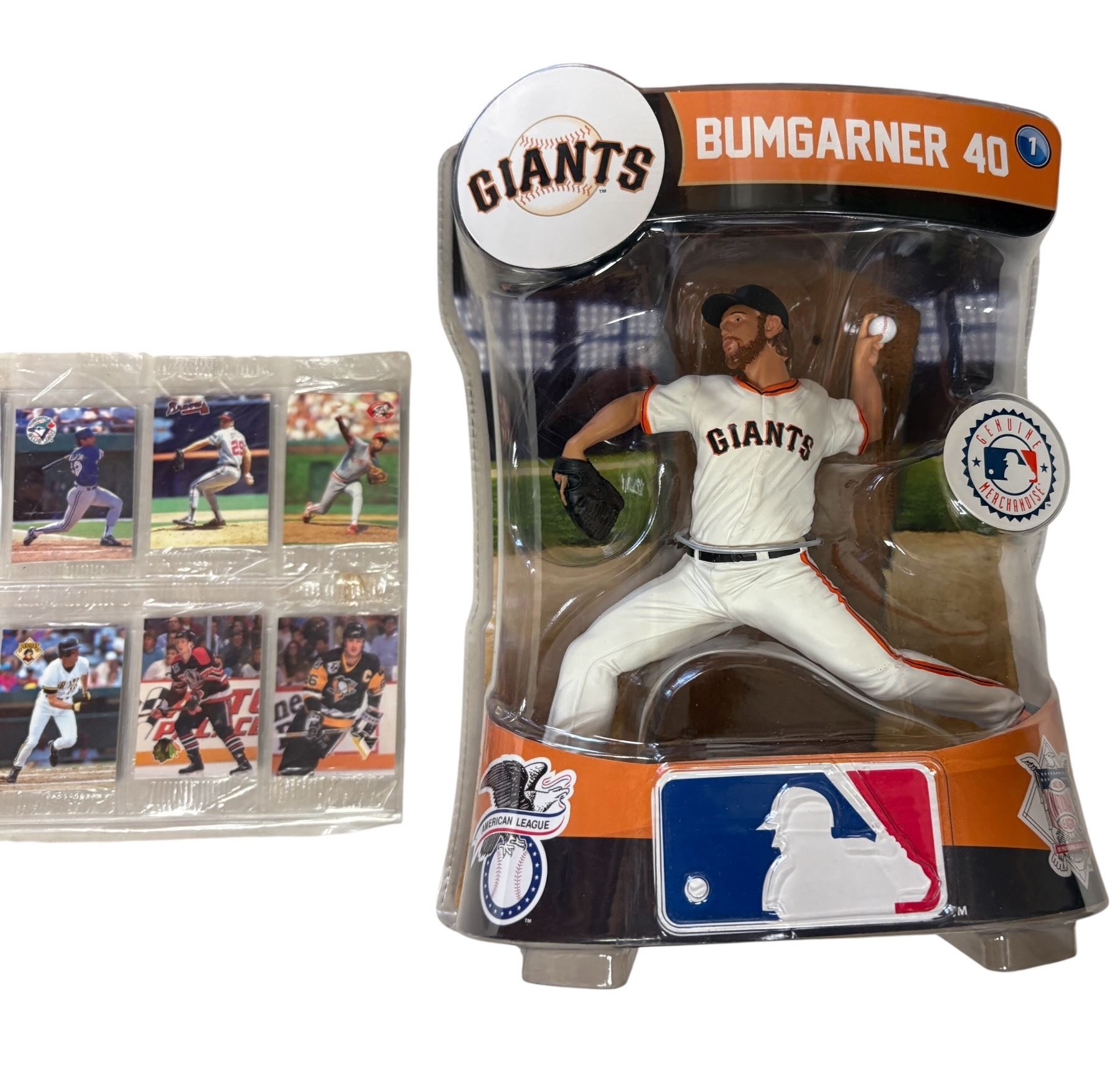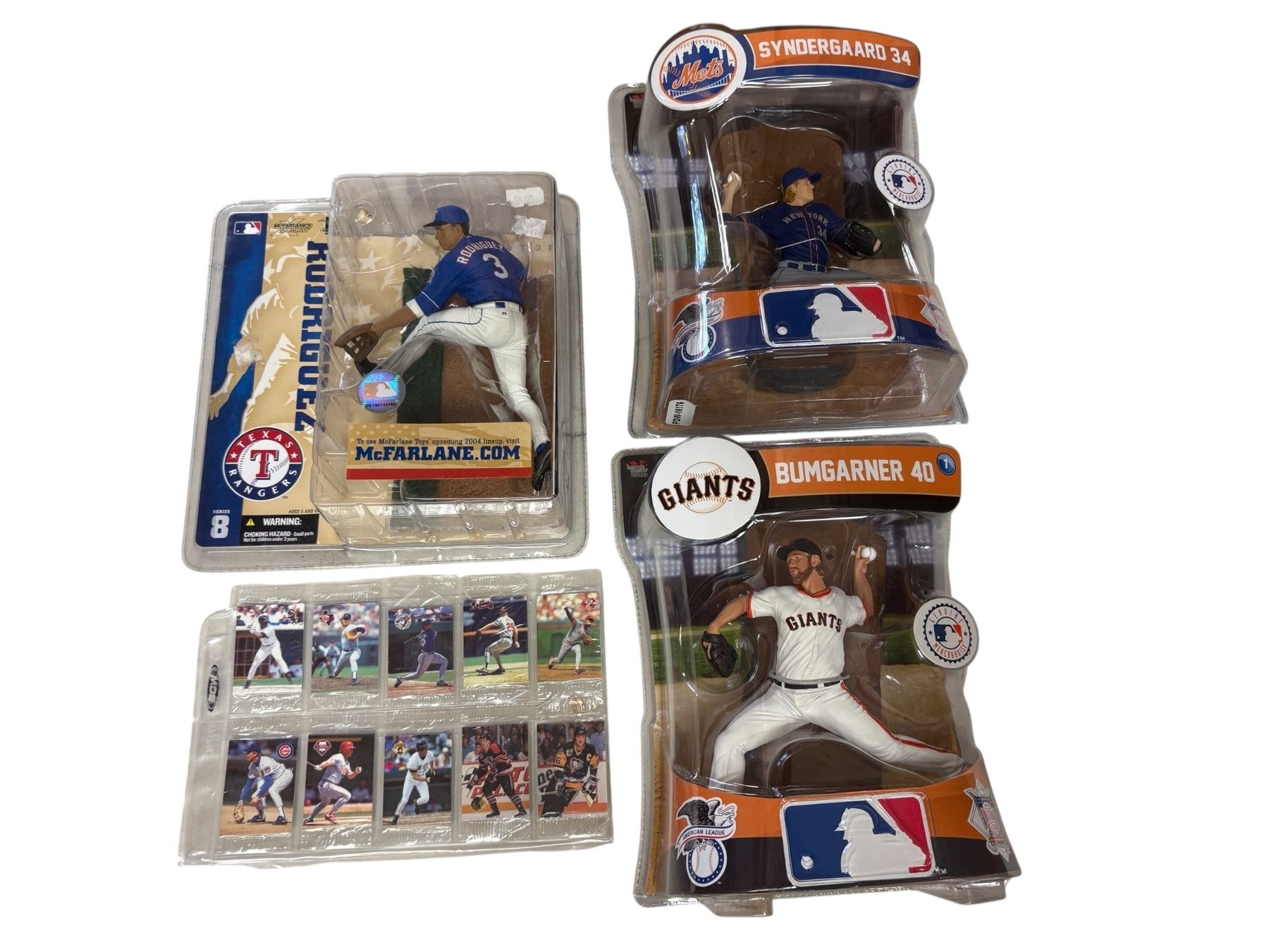 Lot includes MLB McFarlane sports figures of Alex Rodriguez, Noah Syndergaard, and Madison Bumgarner. Each figure showcases detailed likenesses and uniforms. Also includes additional baseball cards featuring various players. Figures produced by McFarlane Toys, known for realistic sports collectibles.