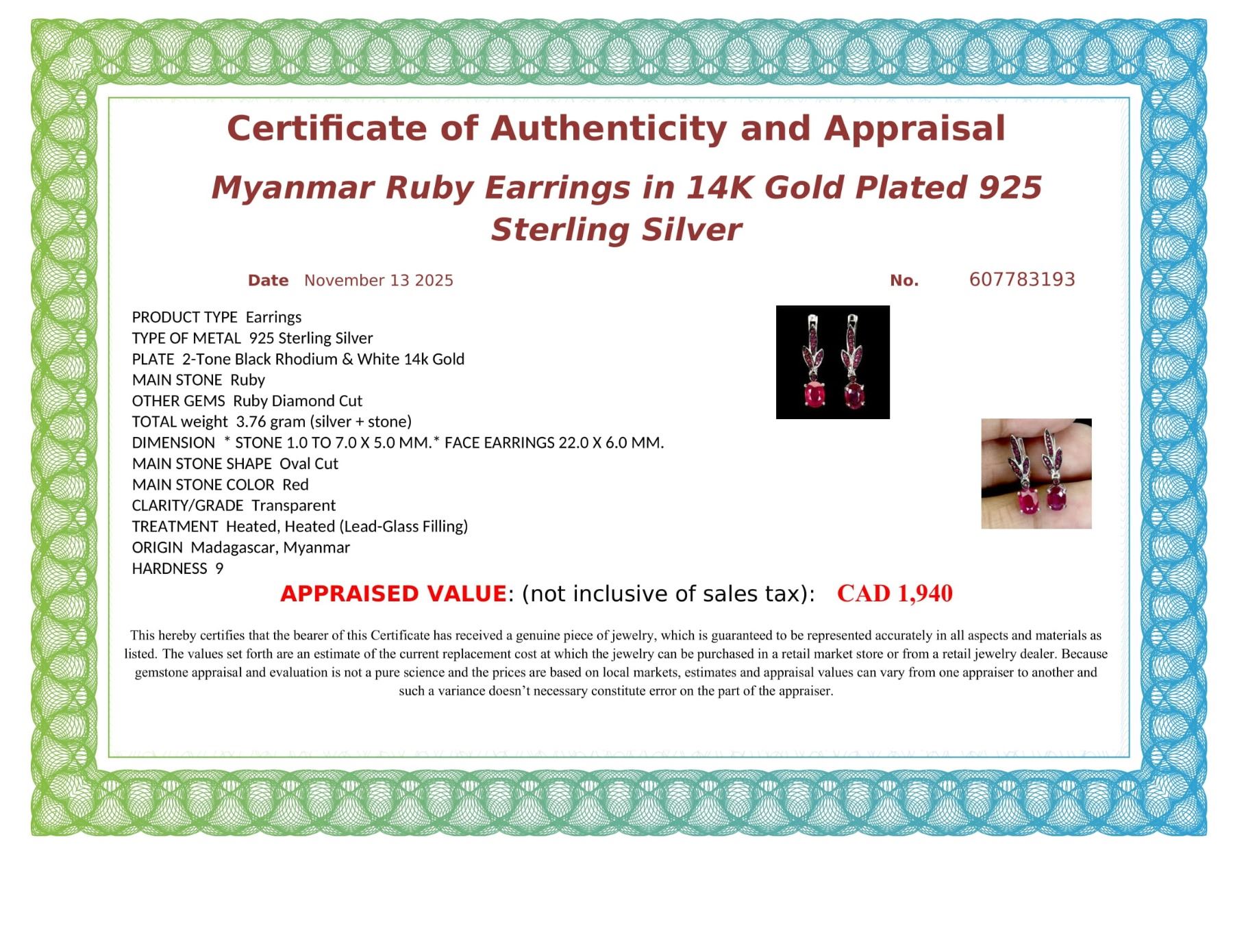 MYANMAR (BURMA) EARRINGS IN 2 TONE BLACK RHODIUM AND 14K WHITE PLATED GOLD OVER 925 STERLING SILVER - APPRAISED REPLACEMENT VALUE $ 1,940
