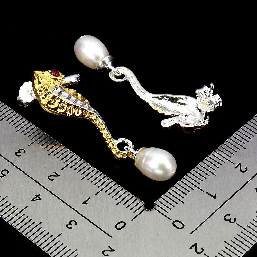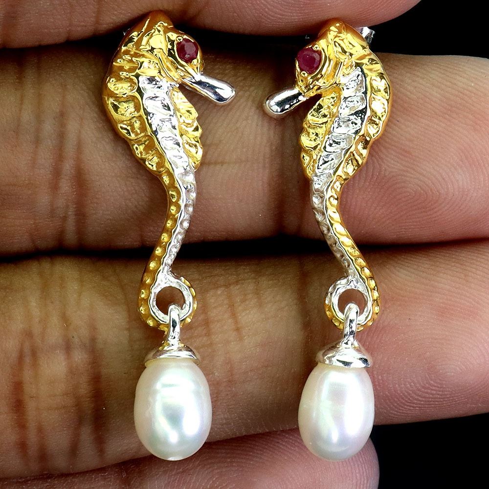 MYANMAR RUBY AND PEARL SEAHORSE EARRINGS IN 14K 2 TONE WHITE AND YELLOW PLATED GOLD OVER 925 STERLING SILVER -SIZE 8 - APPRAISED REPLACEMENT VALUE 900