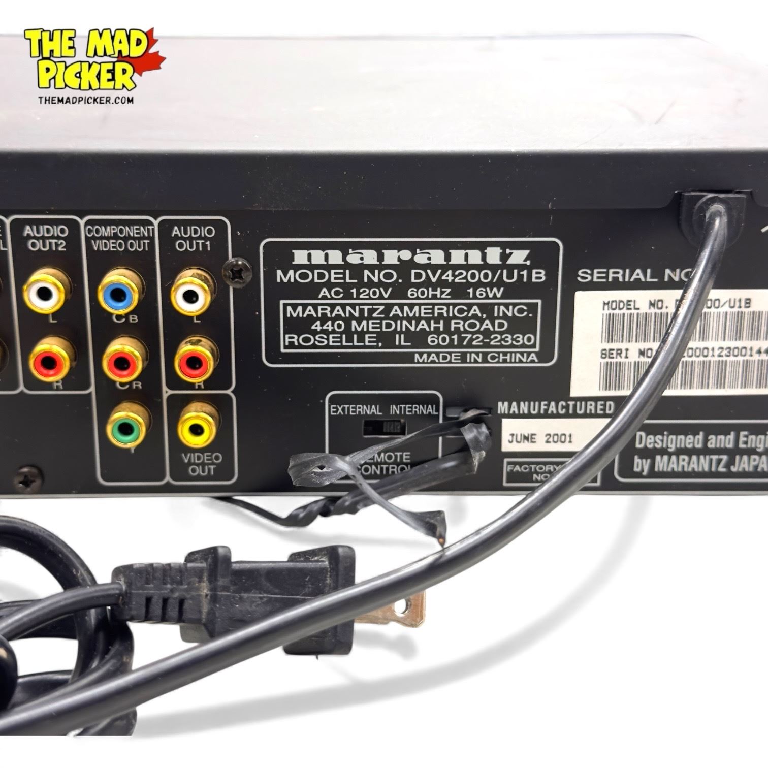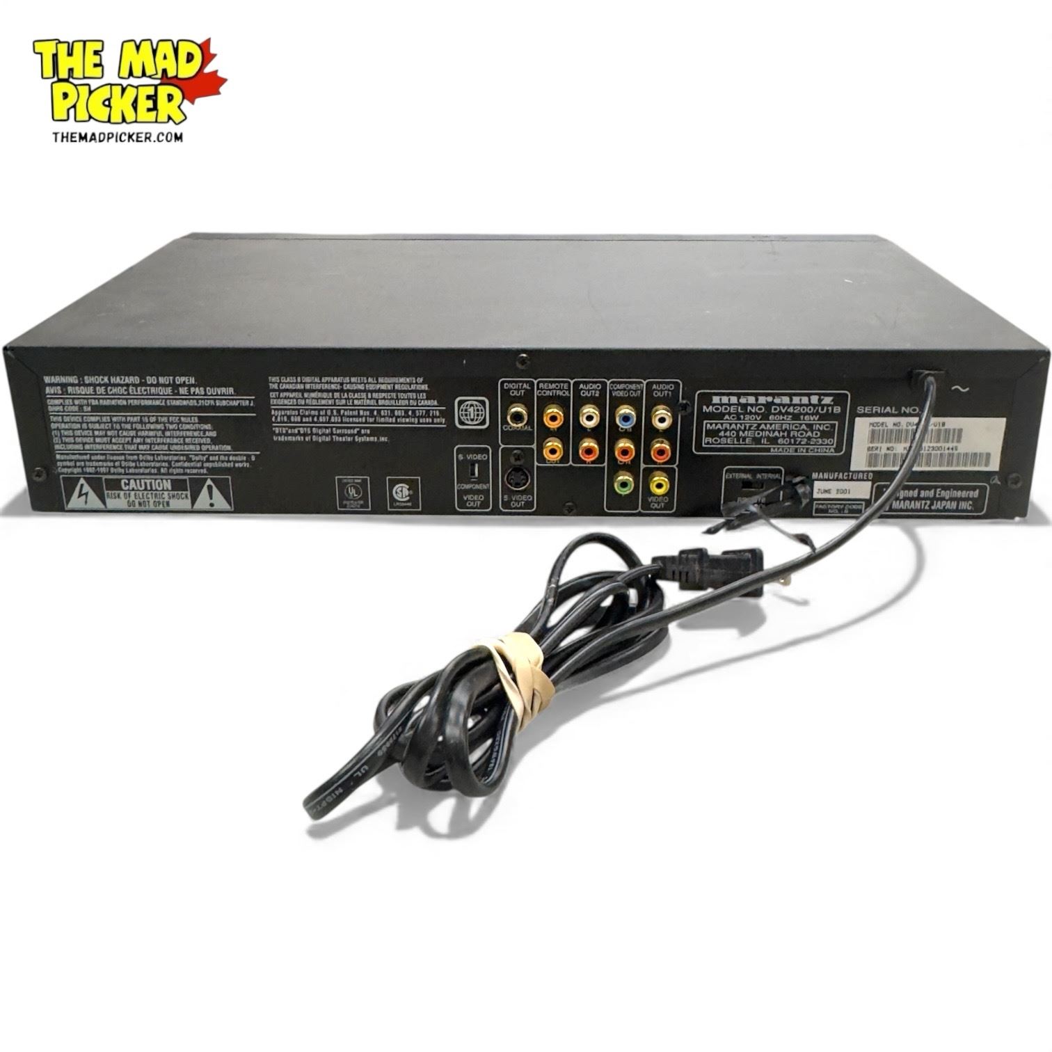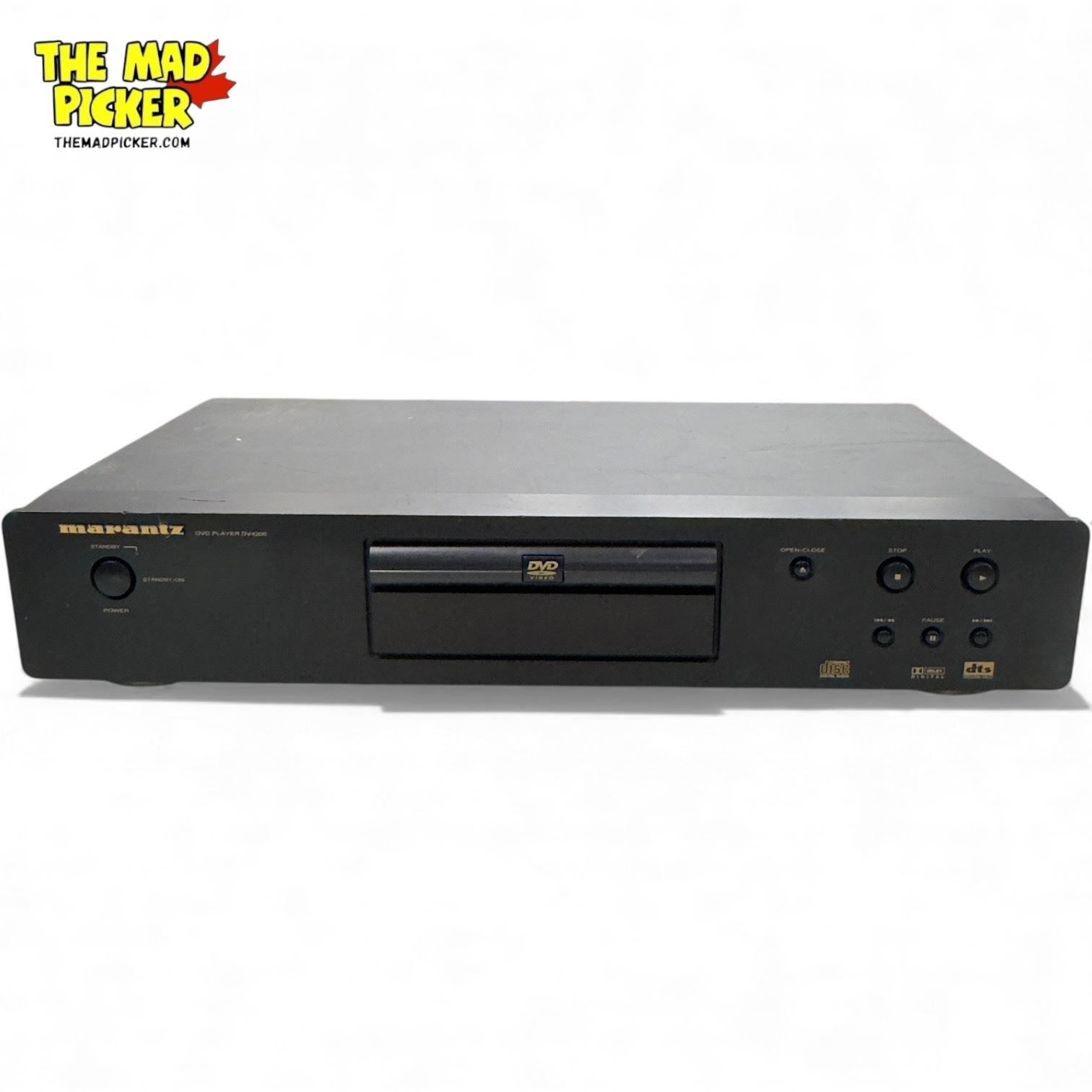 The Marantz DV4200/U1B is a high-quality DVD player from the early 2000s offering playback of DVD-Video, CD, CD-R, CD-RW, Video CD, and MP3 discs. Audio formats supported include PCM, Dolby Digital, and DTS. Audio performance: signal-to-noise ratio 105dB, dynamic range 100dB, THD 0.003%, line output 2V. Digital outputs: coaxial and optical. Video outputs: composite, S-Video, SCART. Features include MP3 playback with up to 10 hours of continuous music, strict hand-selected components for fidelity, and compatibility with multiple disc formats. Dimensions: 440 × 88 × 254 mm; weight 3.2kg. Year of release ~2002. Remote control not included.