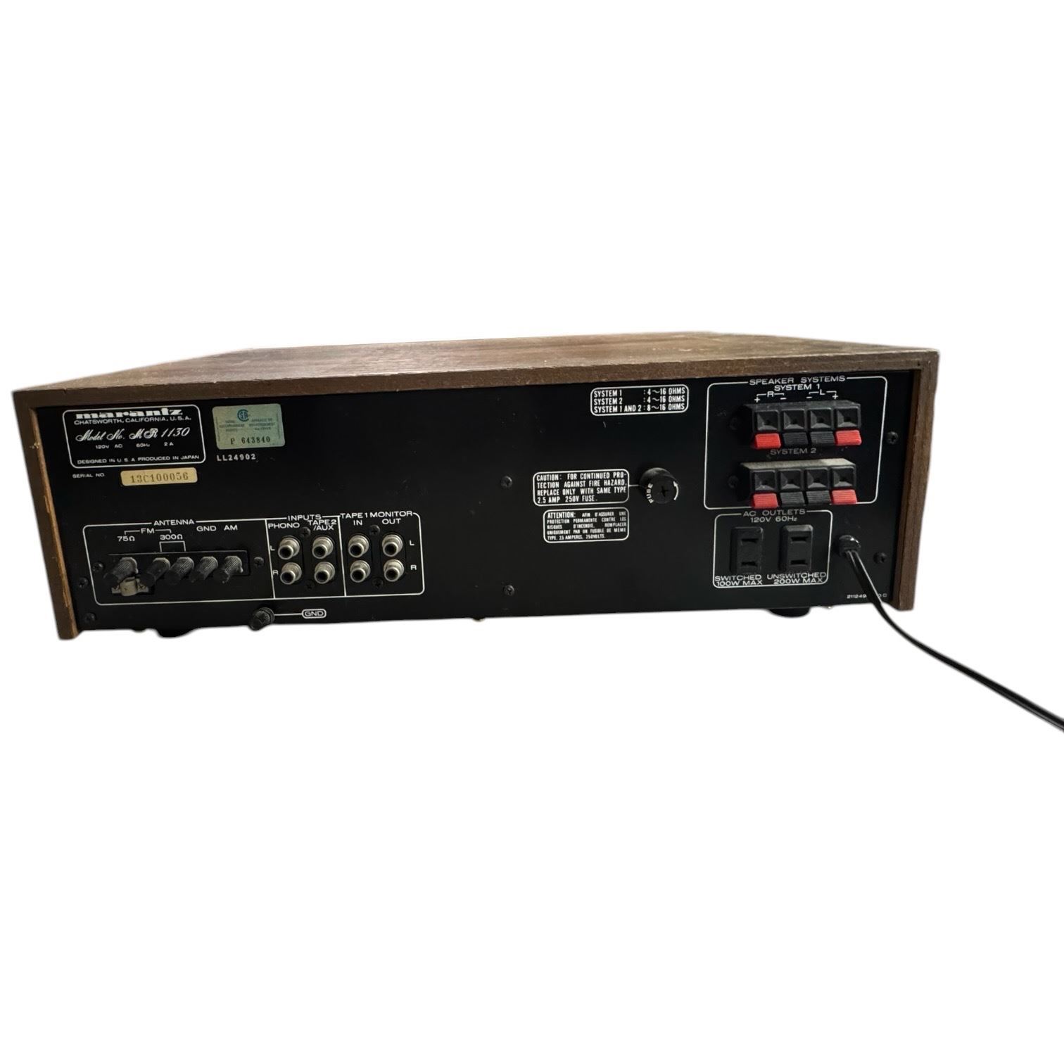 Marantz MR 1130 stereo receiver with AM/FM tuner from the 1970s. Solid state design featuring controls for bass, treble, balance, and input selection. Includes tuning meter and headphone output. Known for its classic vintage audio performance. Item is as pictured.