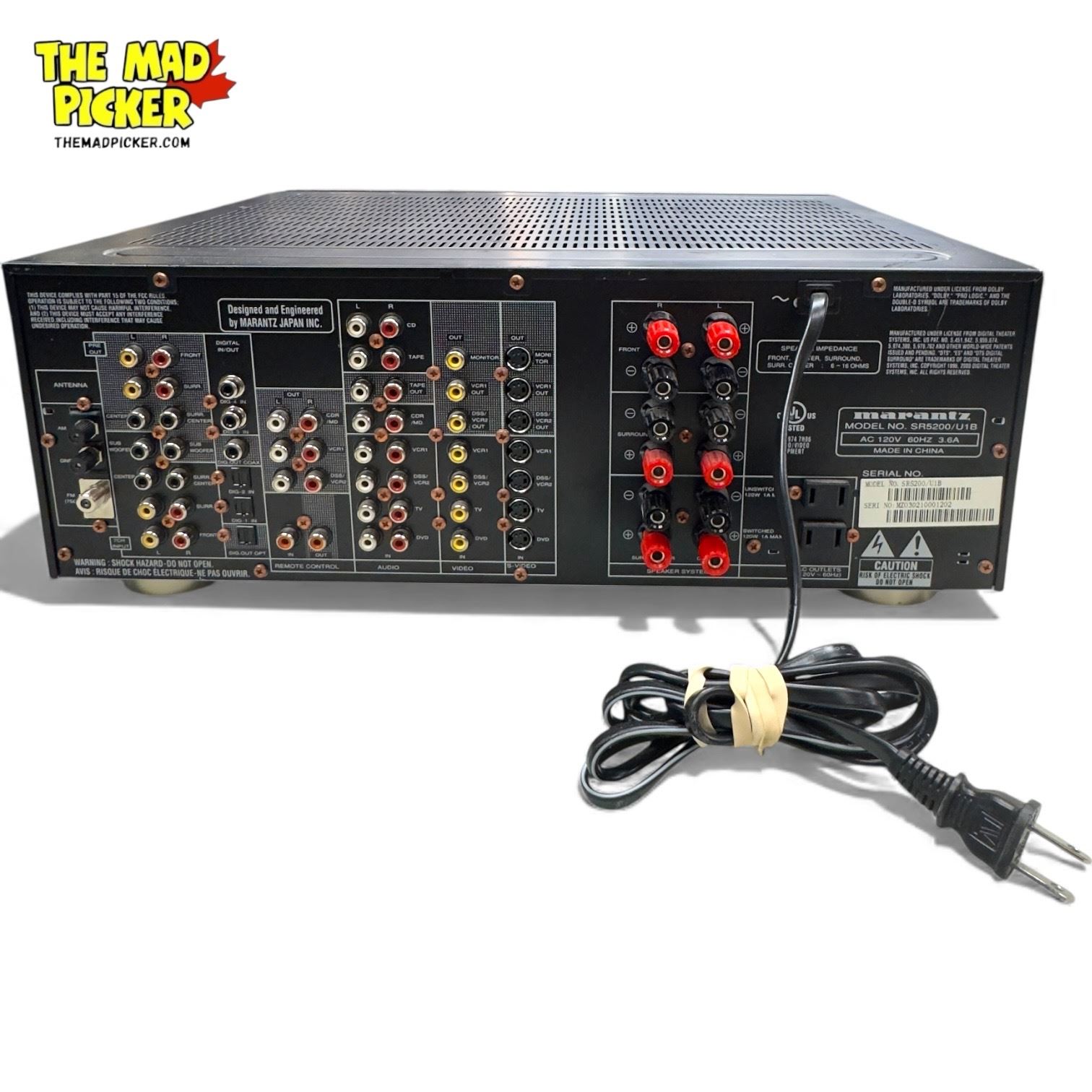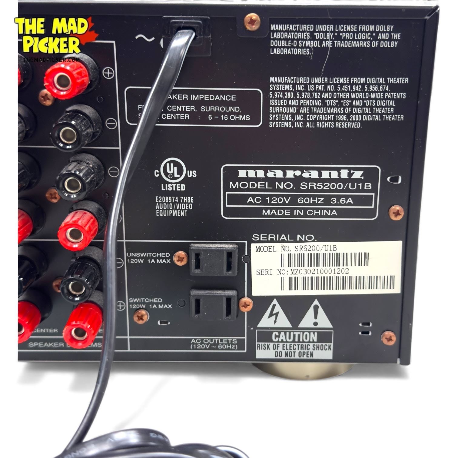 The Marantz SR5200/U1B is a 6.1-channel AV surround receiver rated at 90W per channel into 8Ω, released around 2001 as part of Marantz’s home theater lineup. Amplifier section: 90W x6 channels (8Ω, 20Hz–20kHz, THD 0.05%), equal power discrete amplifier design, speaker impedance 6Ω–16Ω. Audio performance: frequency response 20Hz–20kHz, THD 0.05%, signal-to