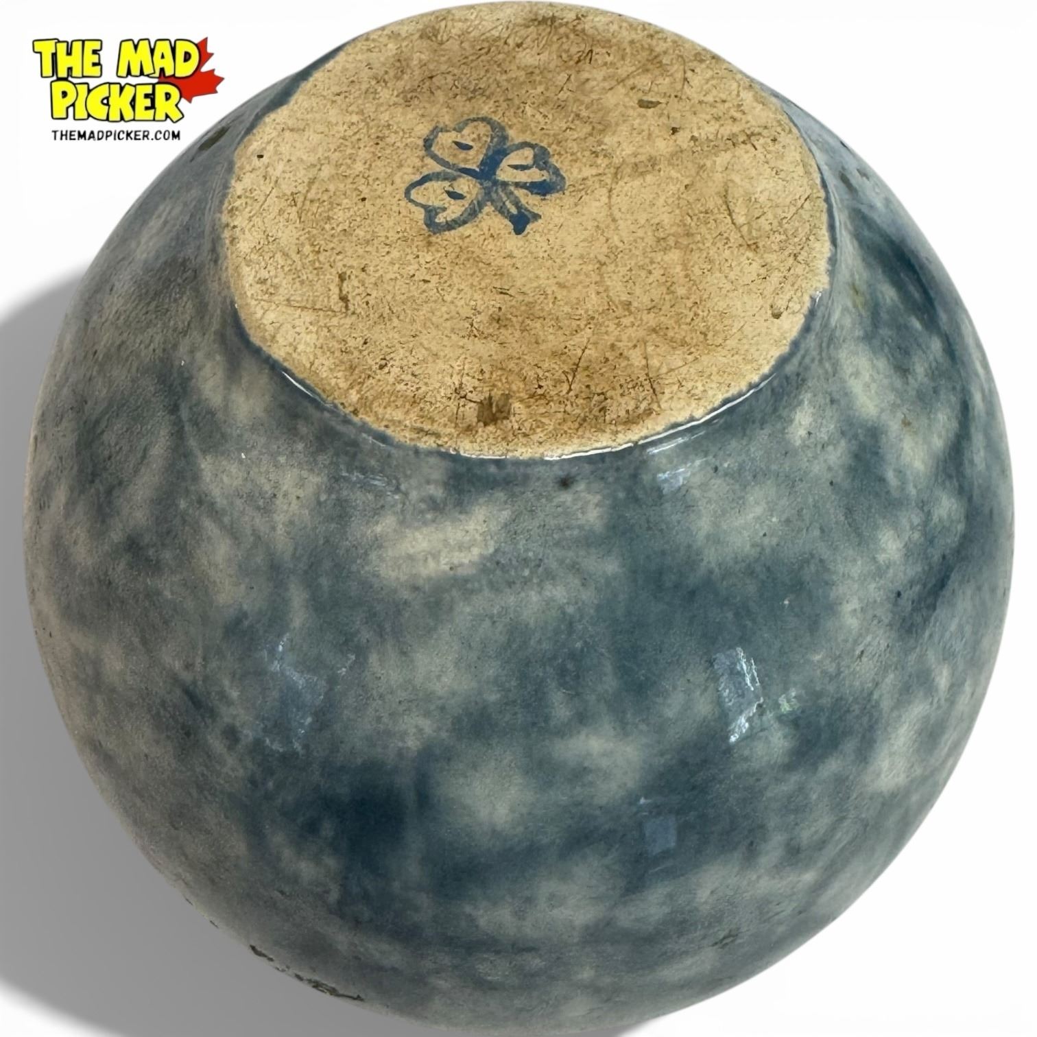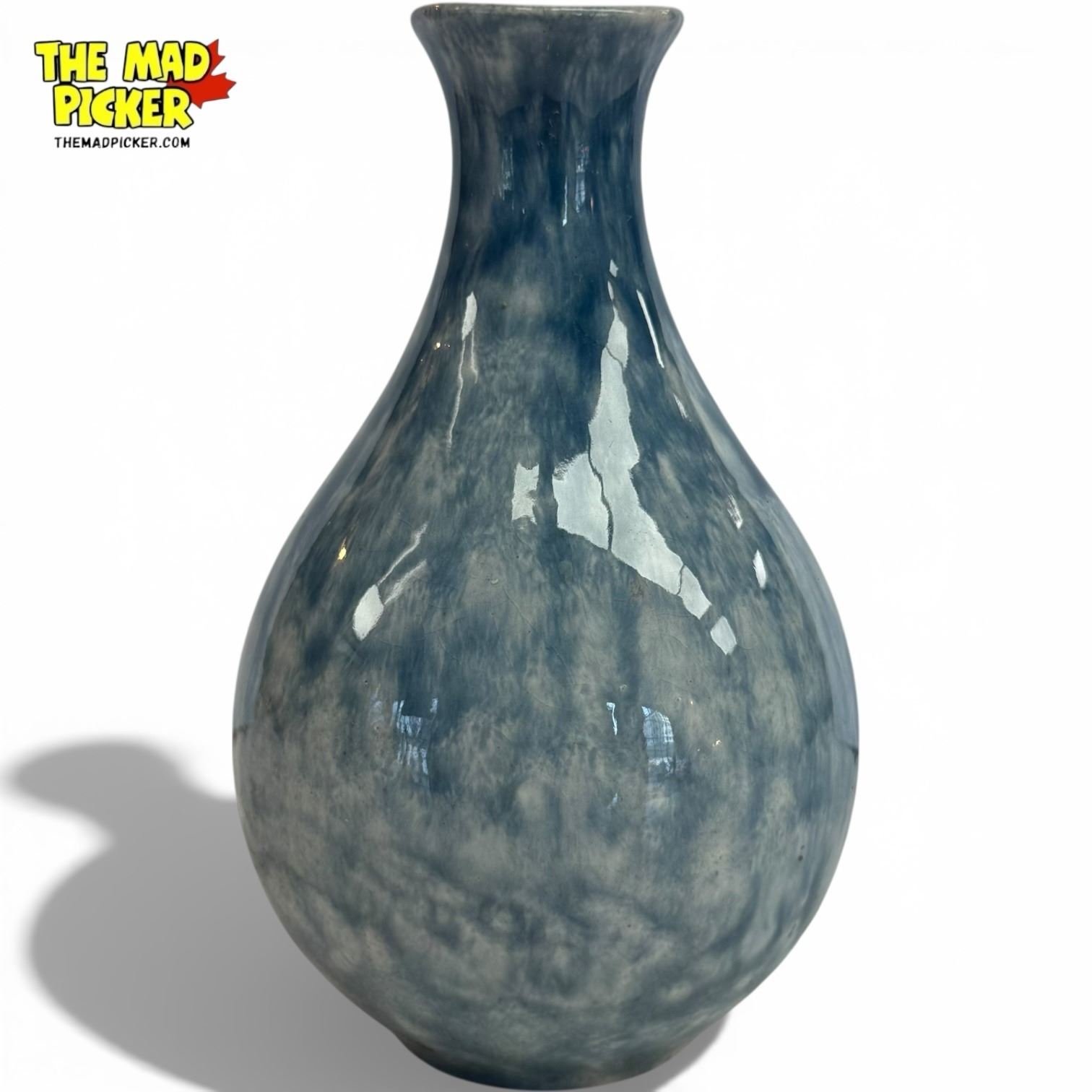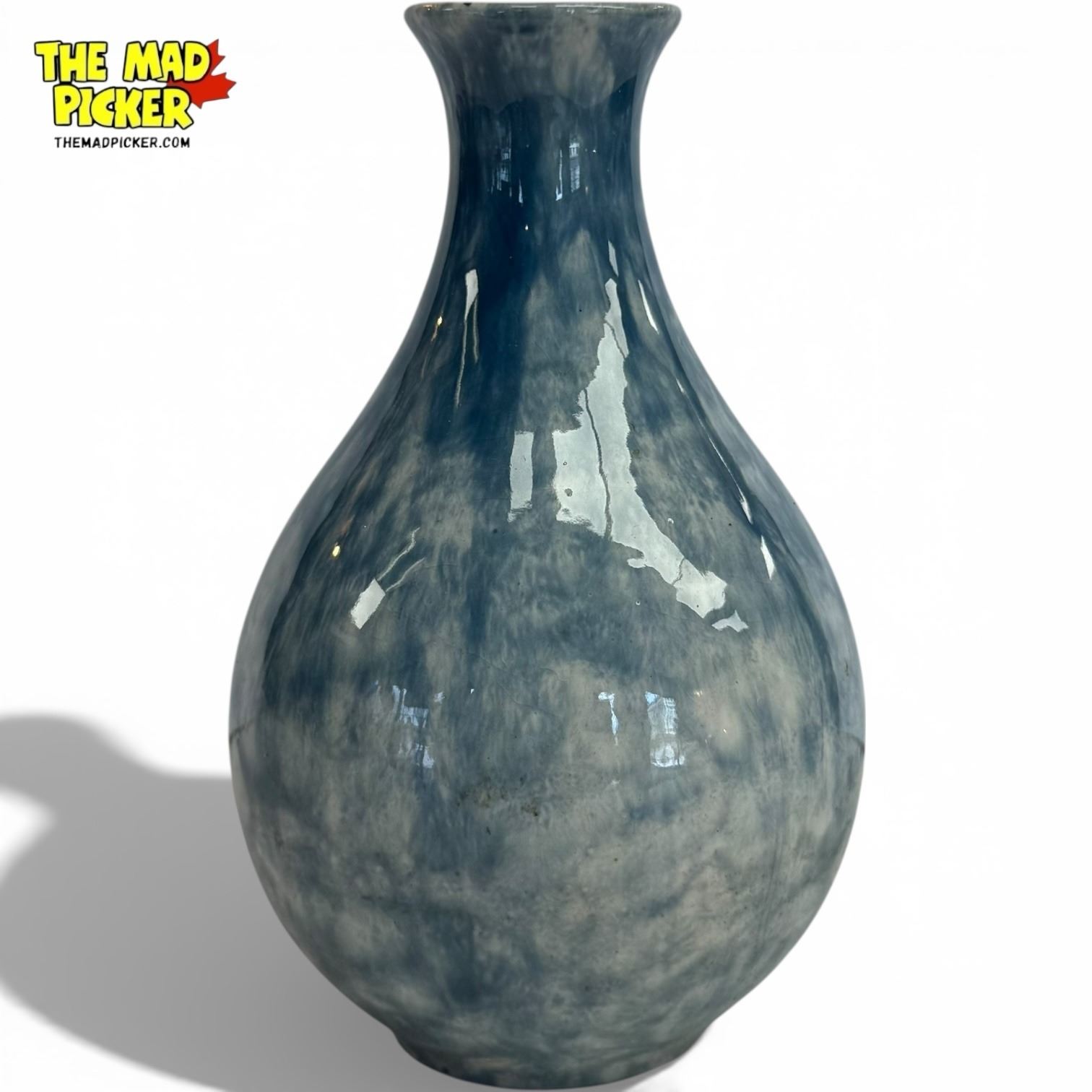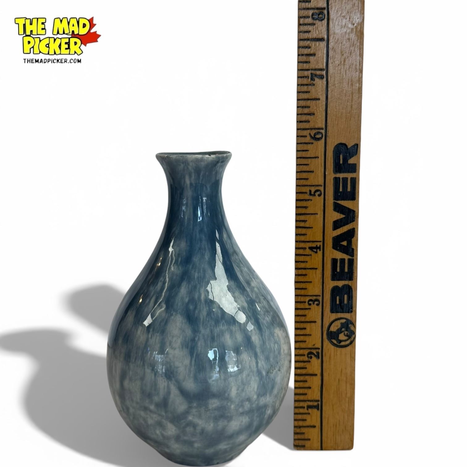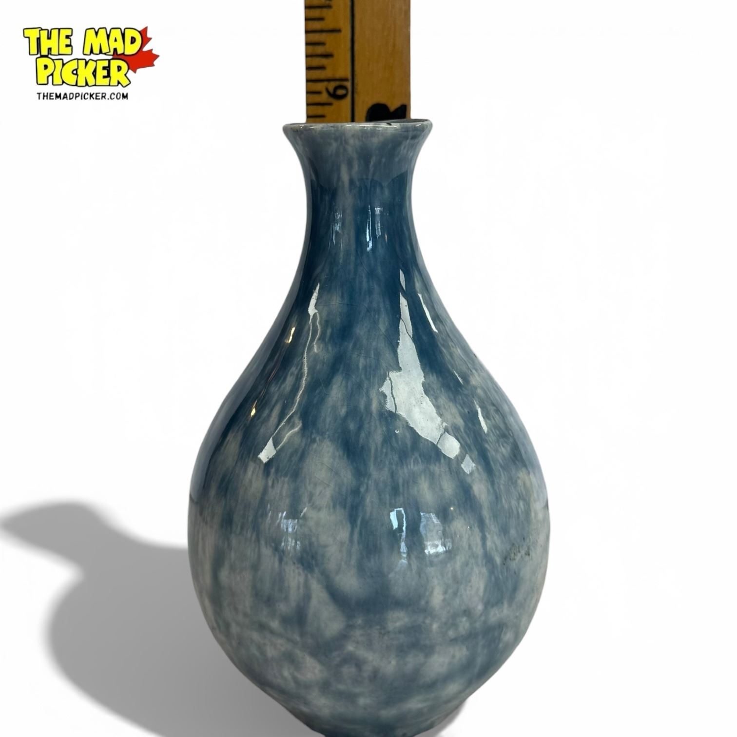 Ceramic vase measuring 6 inches in height, featuring a marbled blue finish with a glossy glaze. Distinctive clover-style maker's stamp impressed at the base. No visible marks indicating the maker or production date. Likely artisanal or small-scale production. Compact decorative piece.