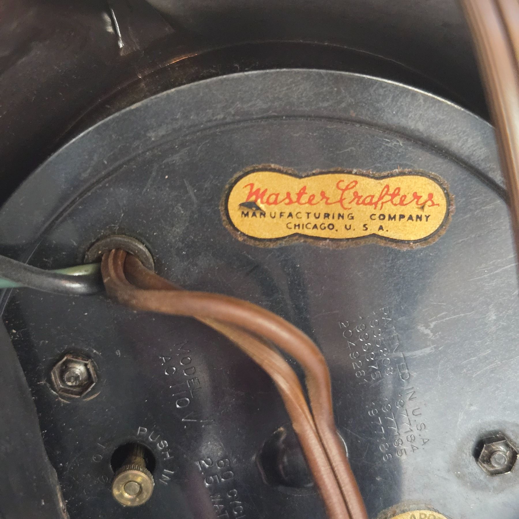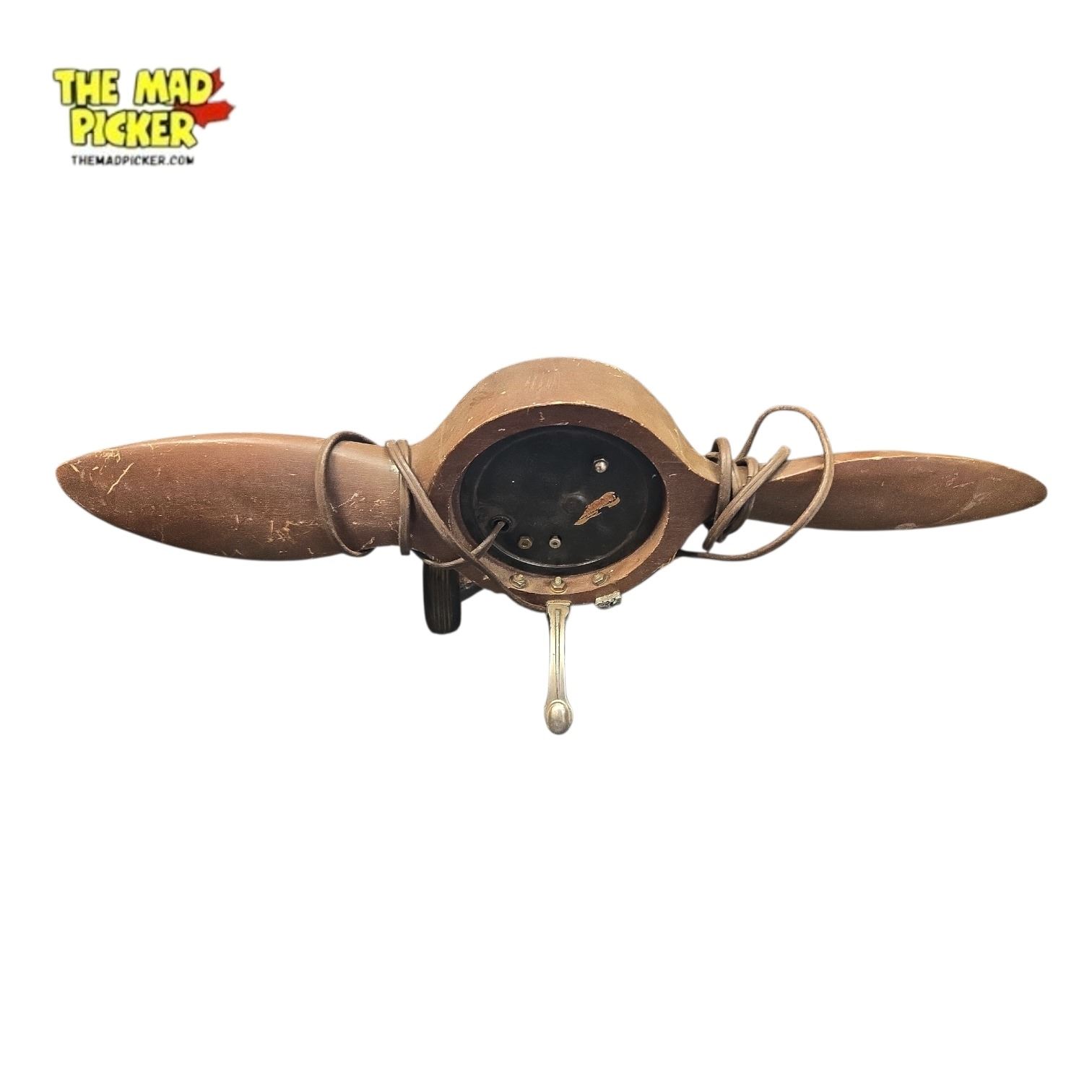 Set of two Master Crafters vintage-style airplane propeller clocks. Designed as decorative table or desk clocks resembling aircraft propellers. Made from wood and plastic. Both clocks exhibit damage; condition details unspecified. Designed for display or decorative purposes.