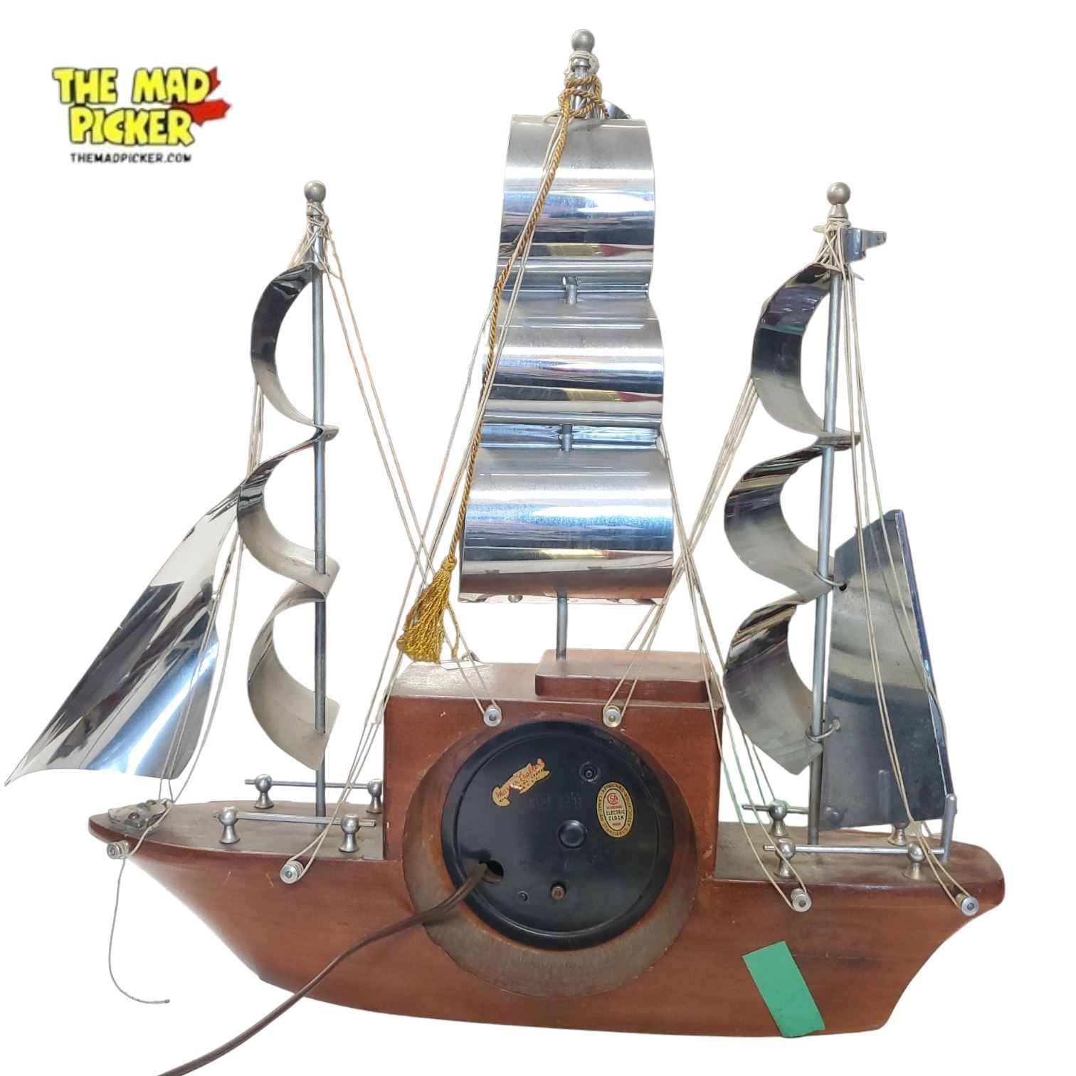 Mastercrafters 'Yankee Clipper' ship clock, mid-century design. Features wooden ship structure and clock face integrated into the ship's hull. Measures 17in tall. Known for its vintage maritime-inspired style, this clock is a blend of functional timepiece and decorative nautical art.