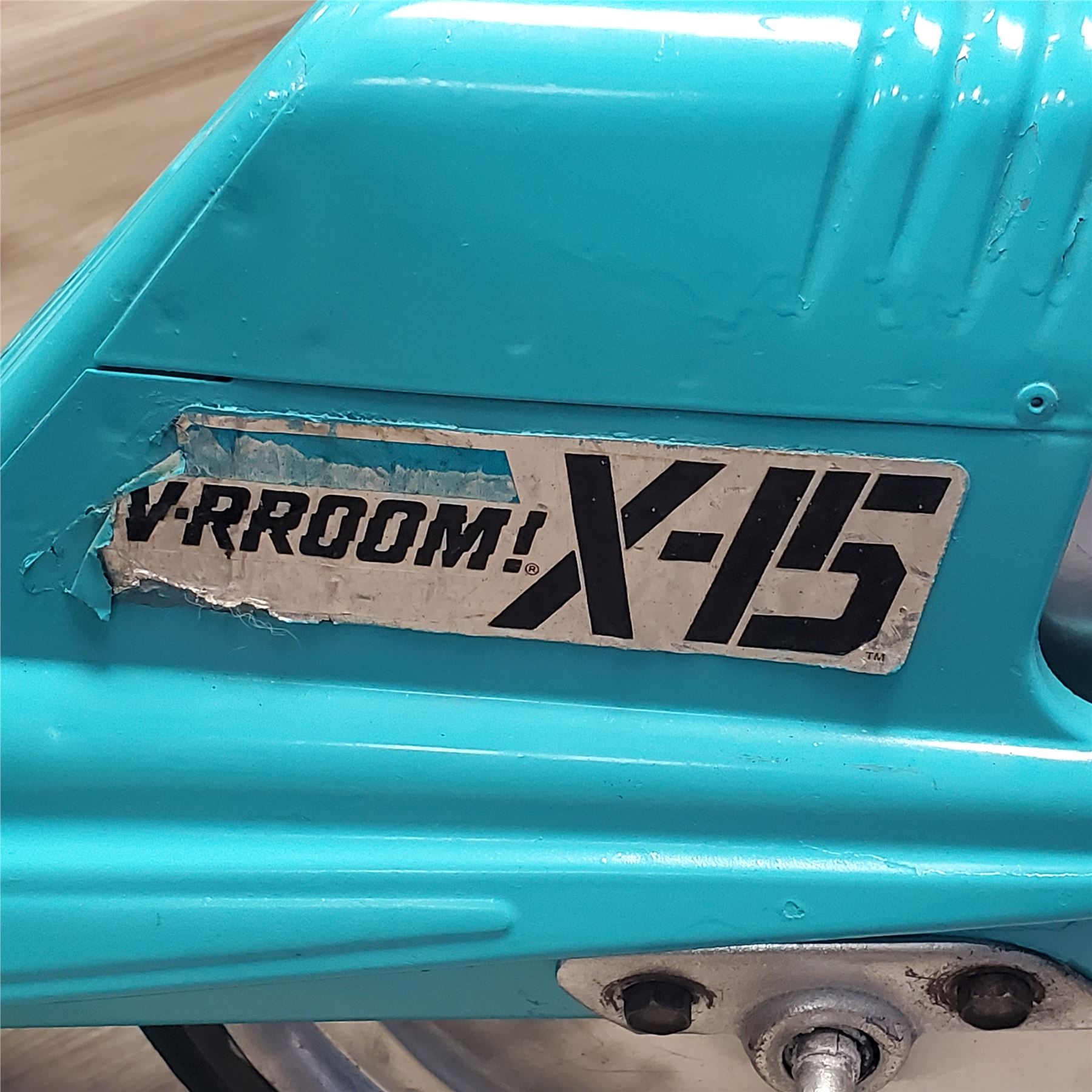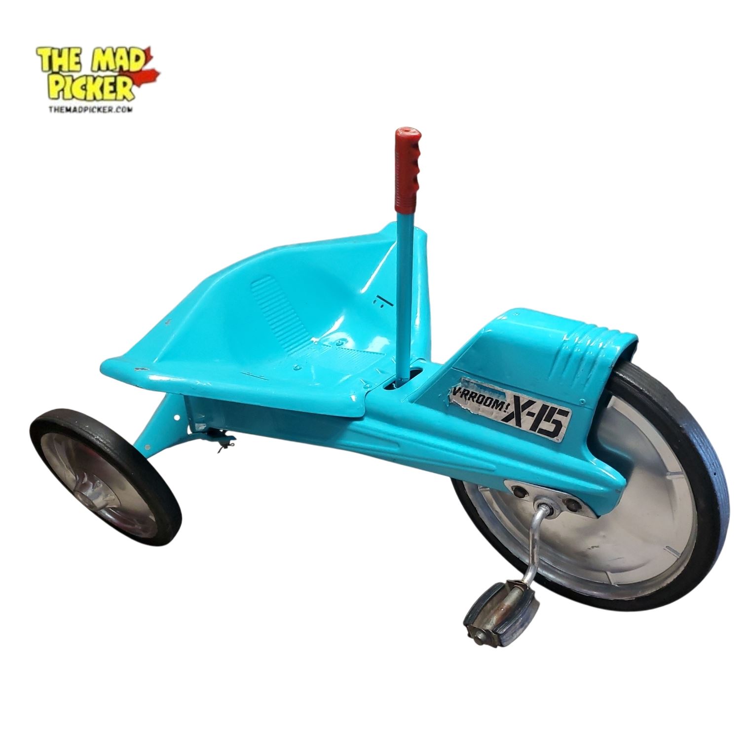 Vintage Mattel V-RROOM! X-15 pedal car tricycle, introduced circa 1964. Features direct pedal drive to the front wheel and joystick-controlled steering of rear wheels, allowing banking motion. Constructed from steel with an aerospace-inspired design typical of the 1960s. Classic ride-on toy.