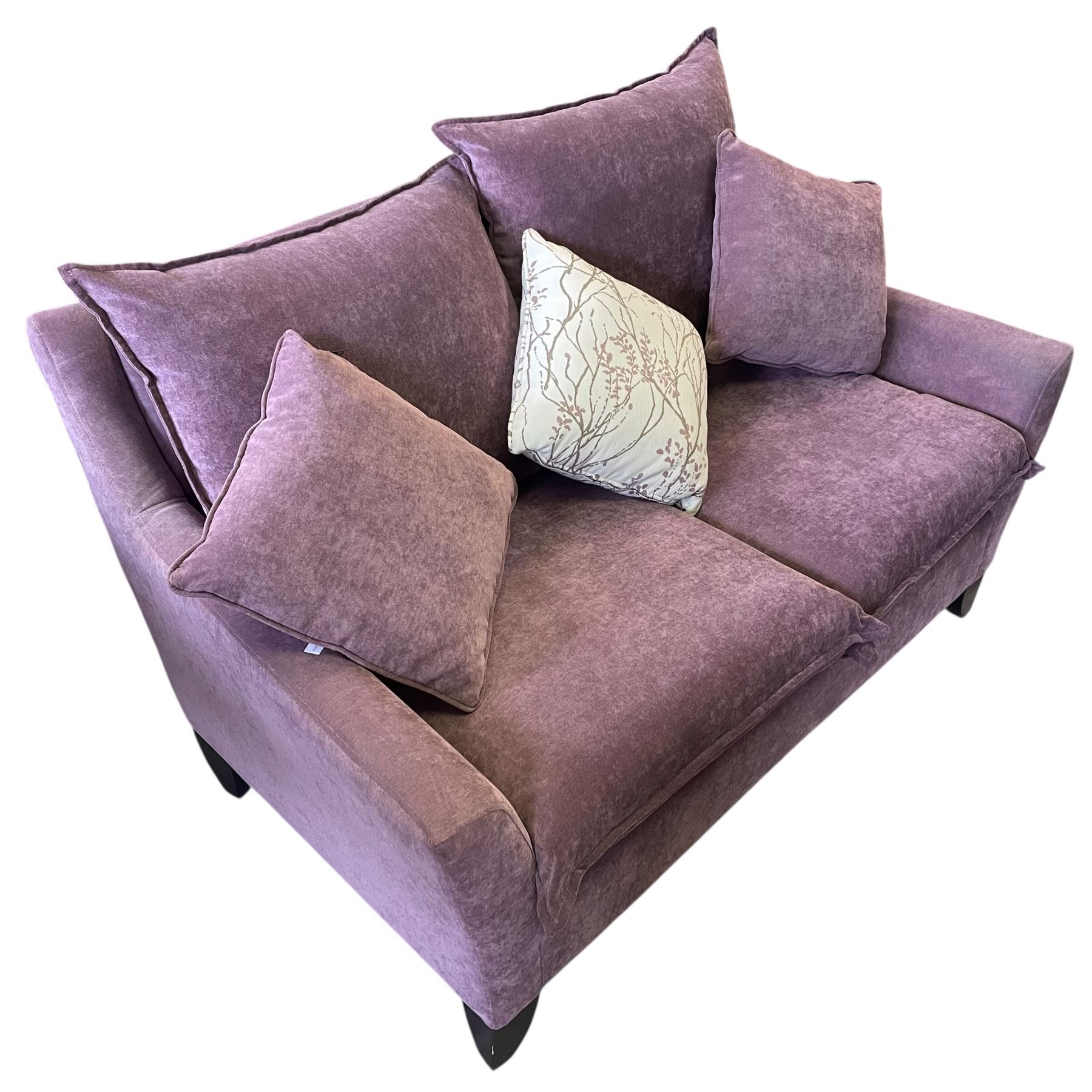 Mauve Couch Potato by Sofa Co with dimensions Length: 58-In, Width: 36-In, Height: 33.5-In. Features a compact design suitable for various indoor settings. Item is as pictured. Comes with throw pillows