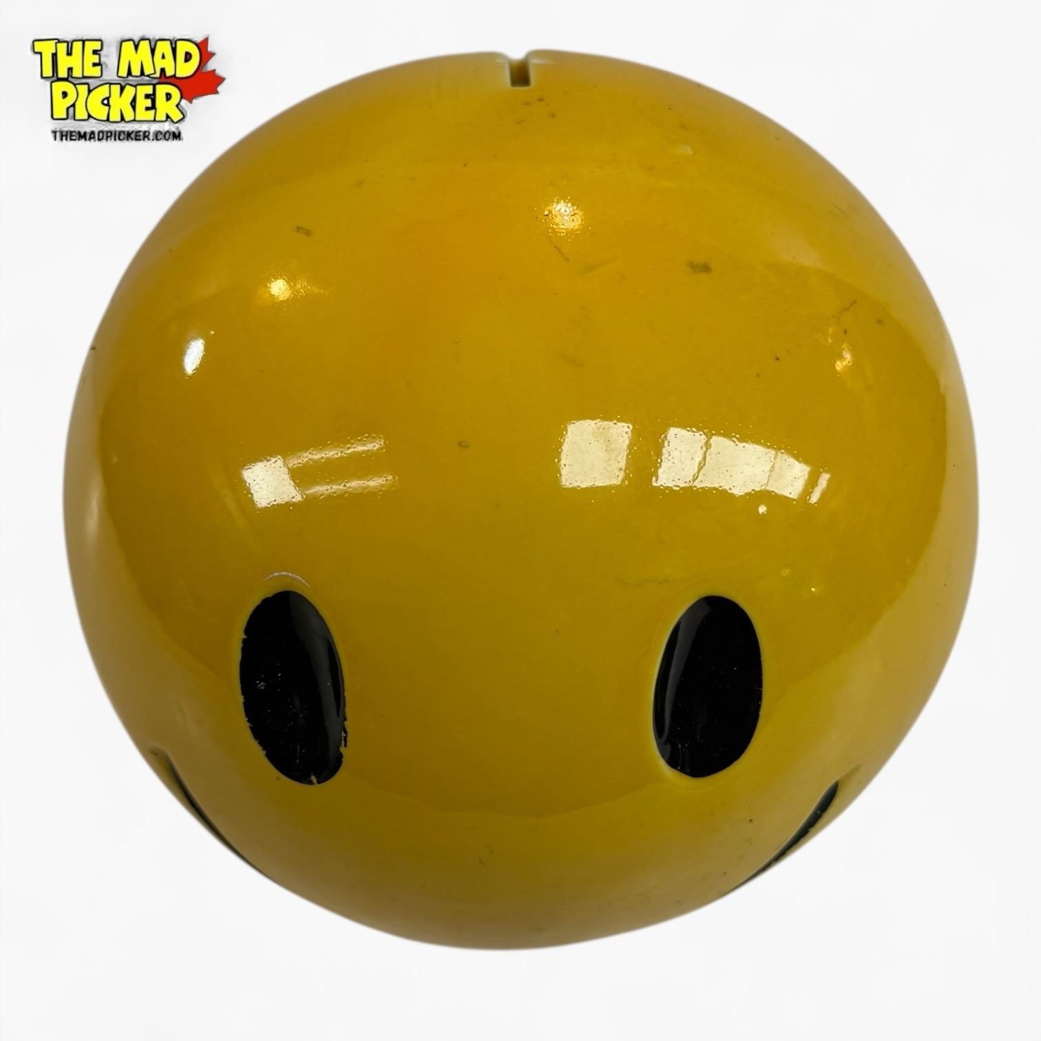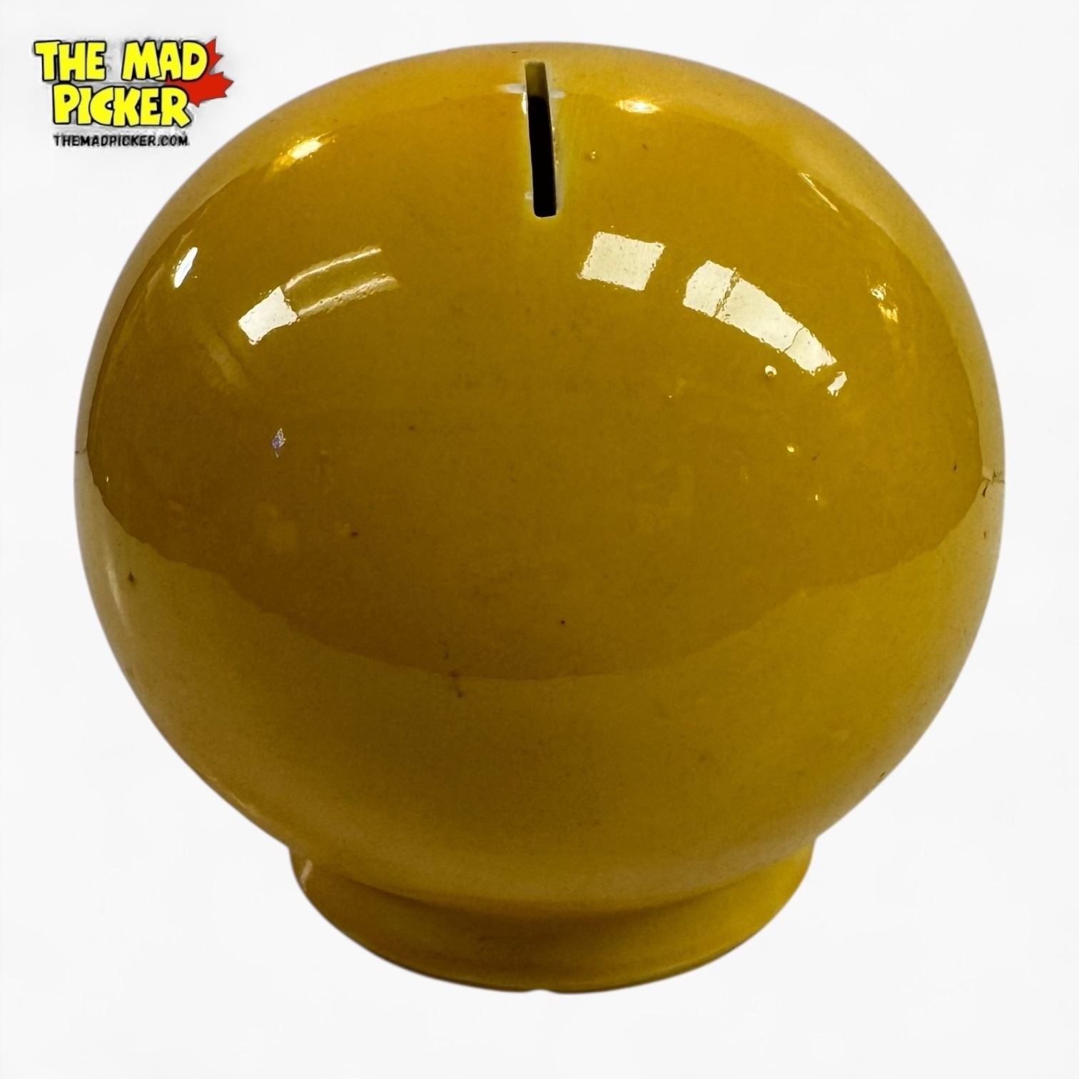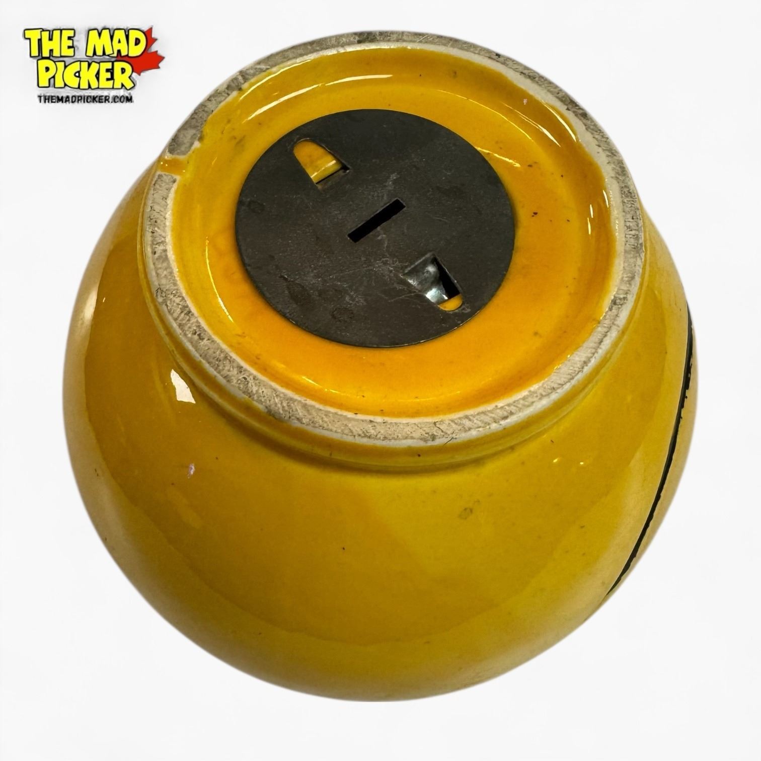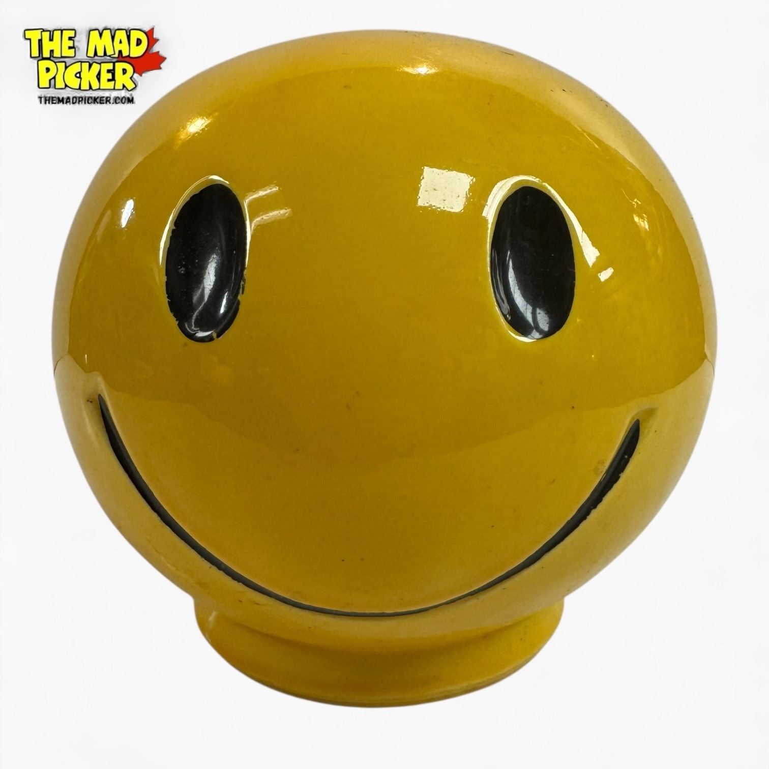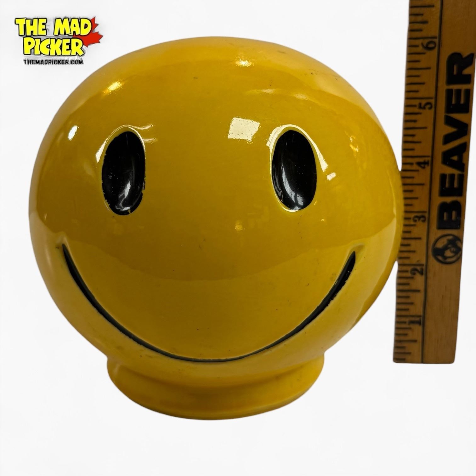 Vintage McCoy Pottery USA Smiley Happy Face bank from the 1970s. Yellow ceramic with original plastic stopper. Stands approximately 7 inches tall. Features McCoy USA marking on the base. Popular collectible symbolizing 1970s pop culture.