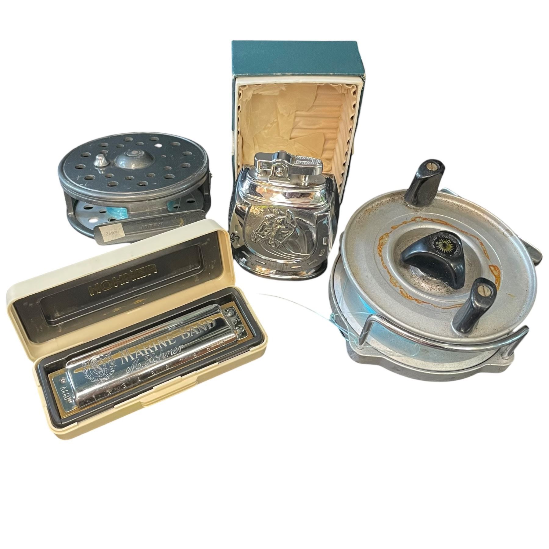 Men's Lot: Casting Reel, Fly Fishing Reel, Harmonica and Vintage Lighter