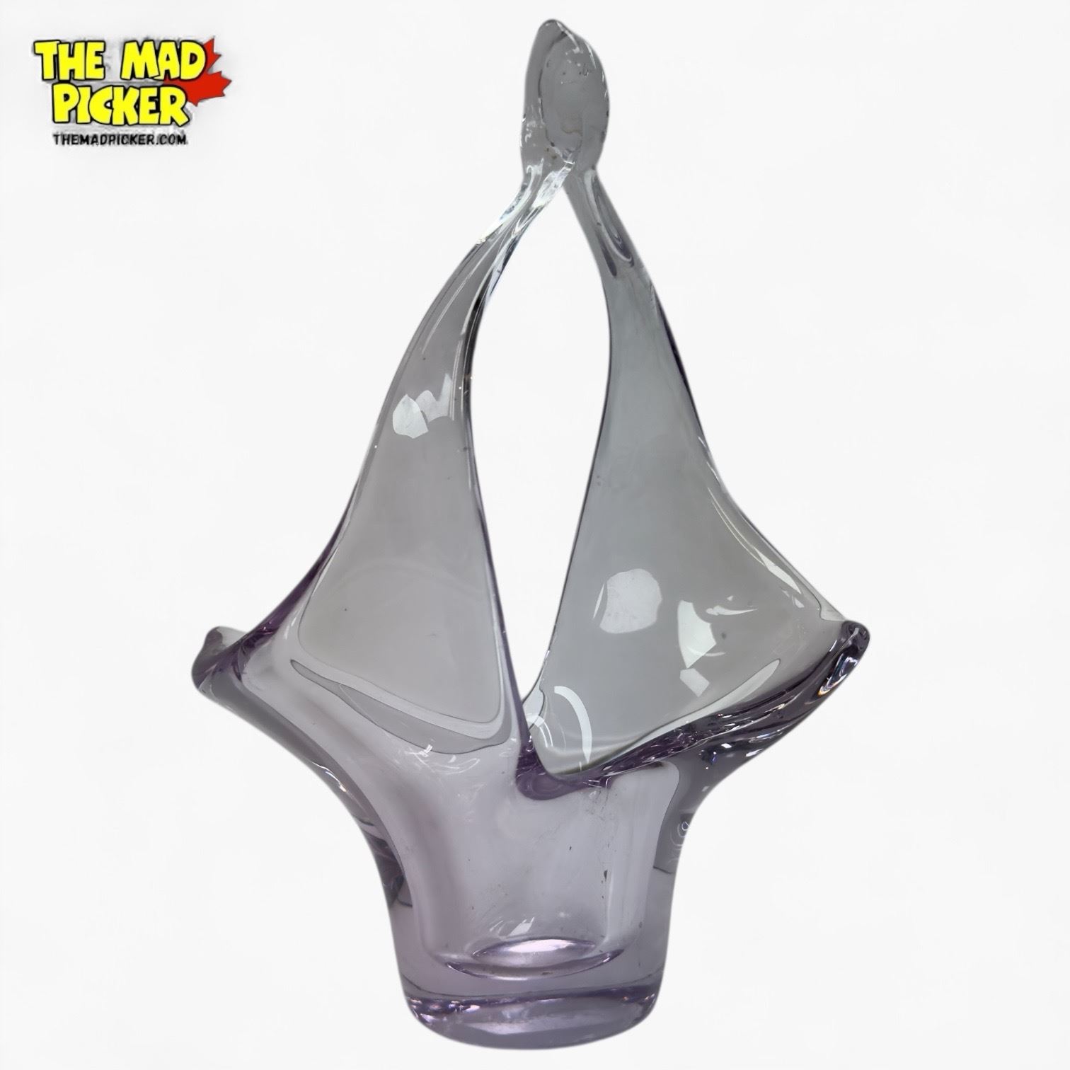Mery Bomboniere handblown art glass basket, made in Italy. Features a light purple/amethyst hue. Crafted with traditional Italian glassblowing techniques. Unsigned decorative basket suitable as a centerpiece. Approximate origin: modern production.