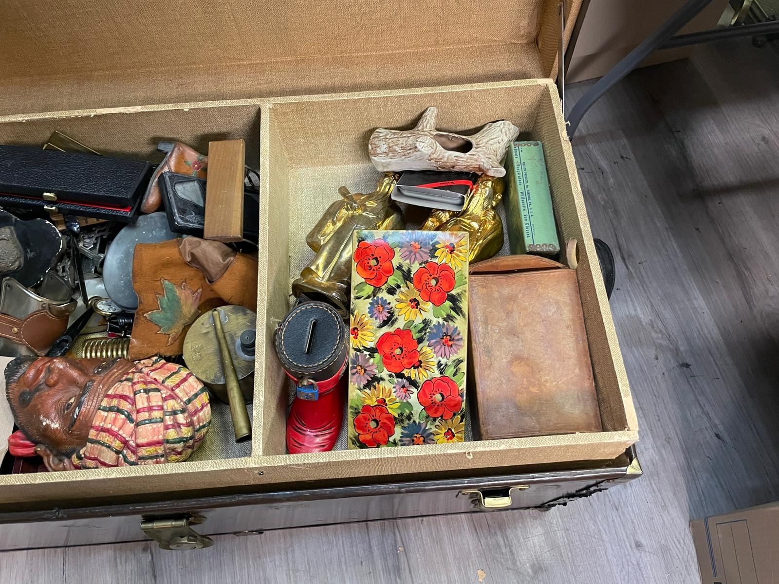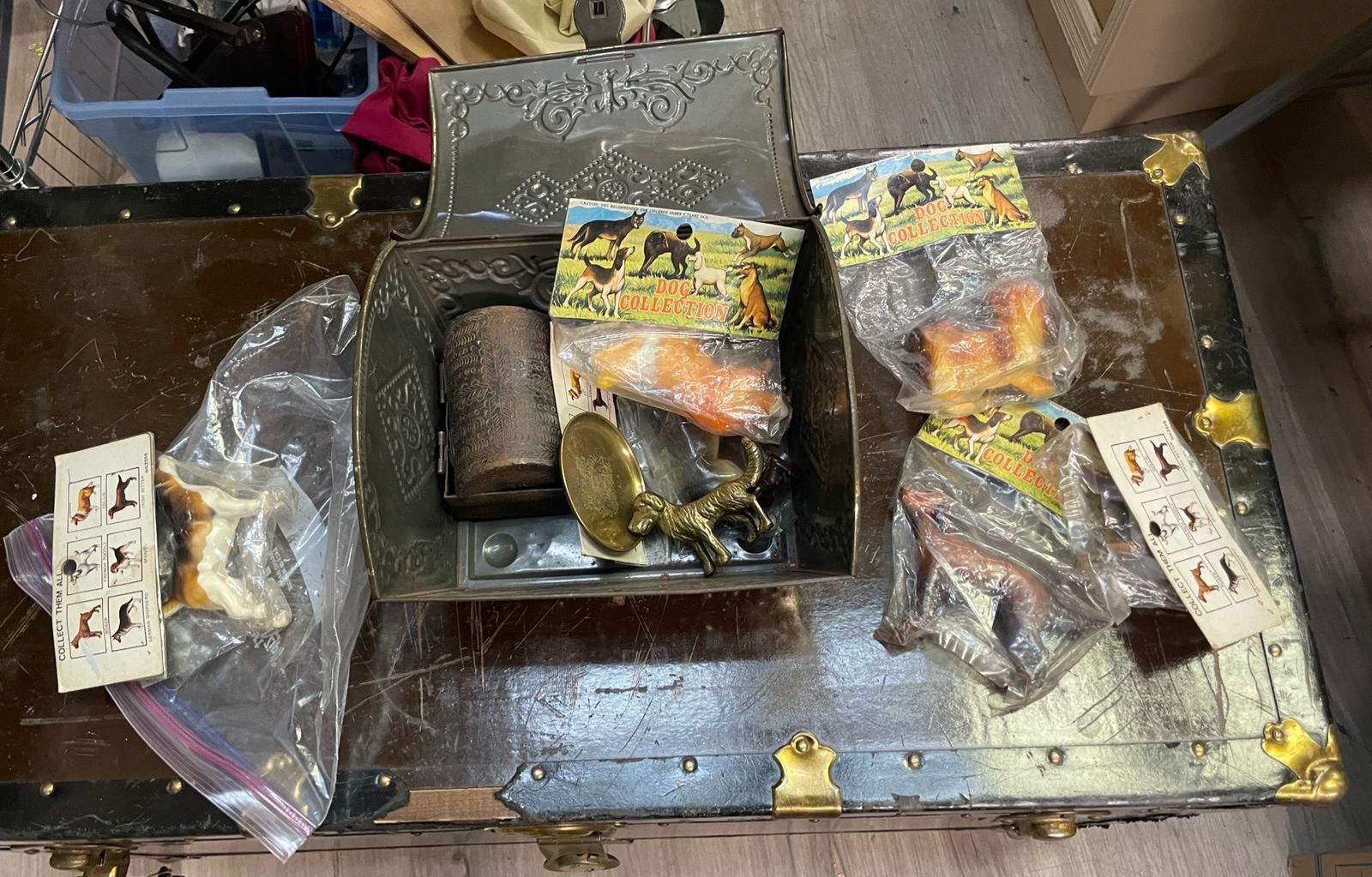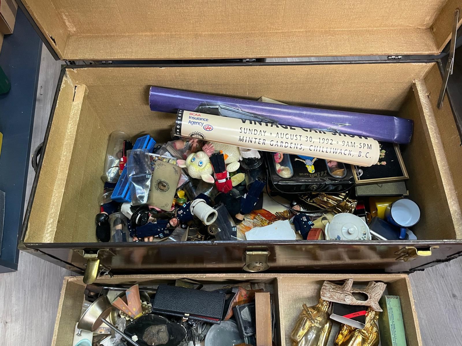 Metal Clad Storage Trunk & Contents and Candy Tin Full of Animal Toys (Vintage decorative collectibles in trunk)