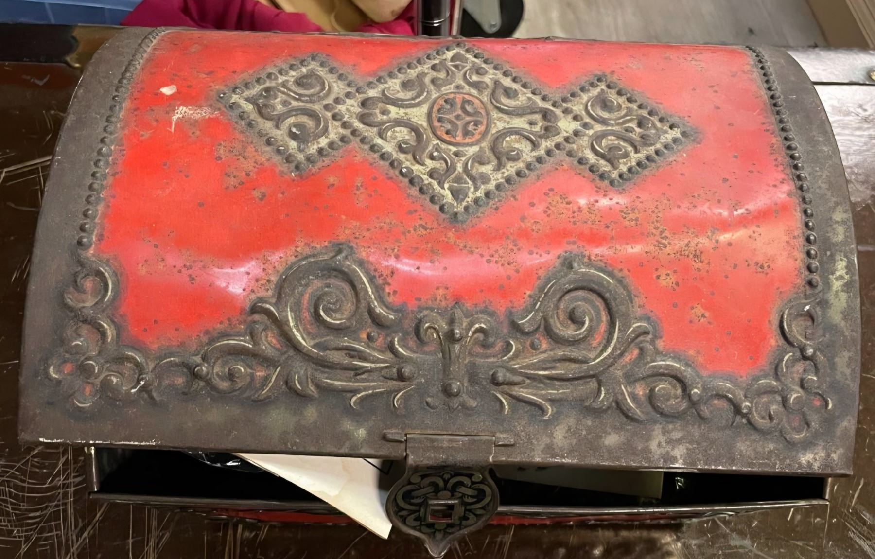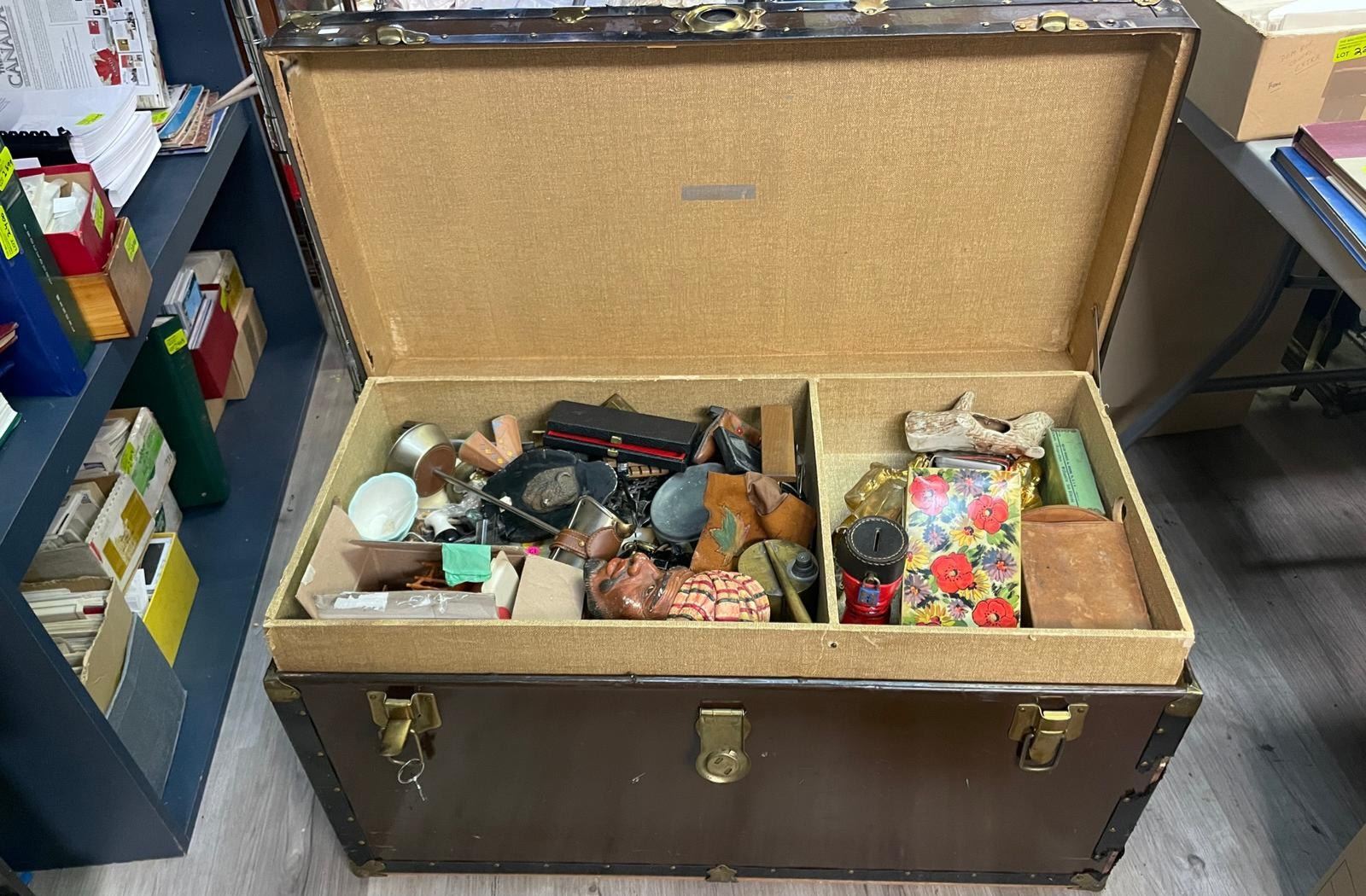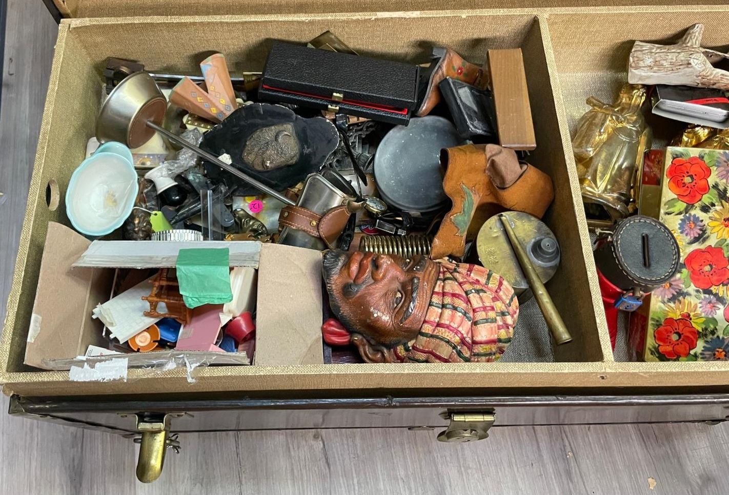 Metal Clad Storage Trunk & Contents and Candy Tin Full of Animal Toys (Vintage decorative collectibles in trunk)