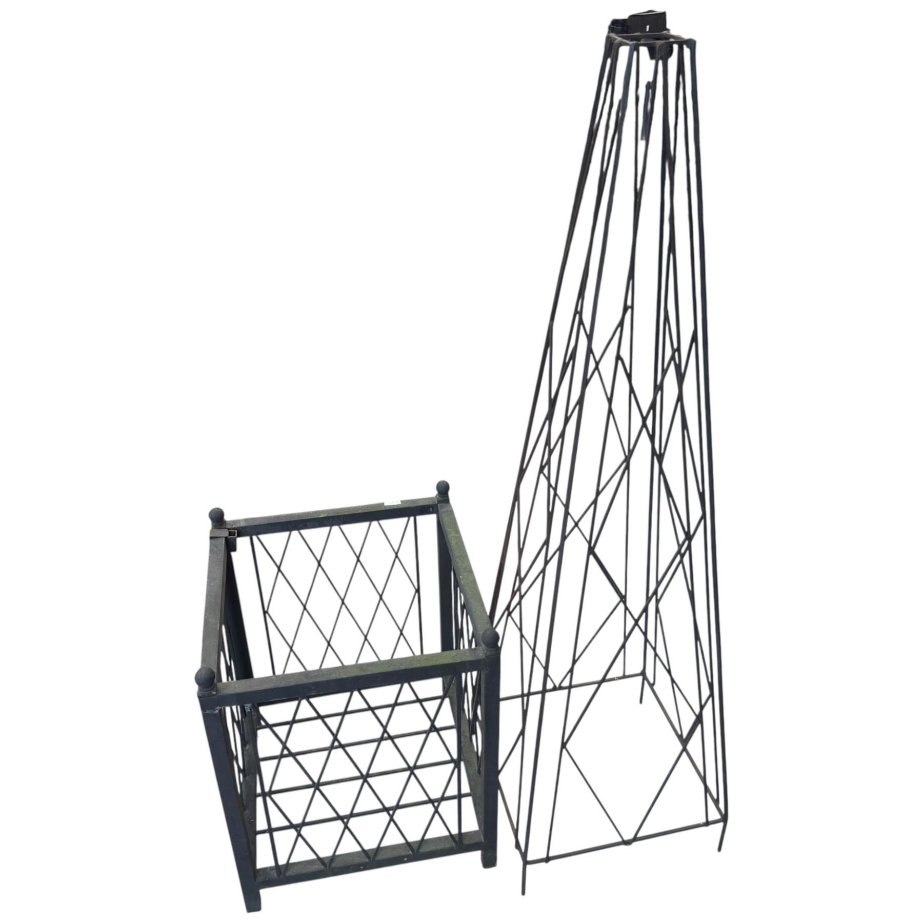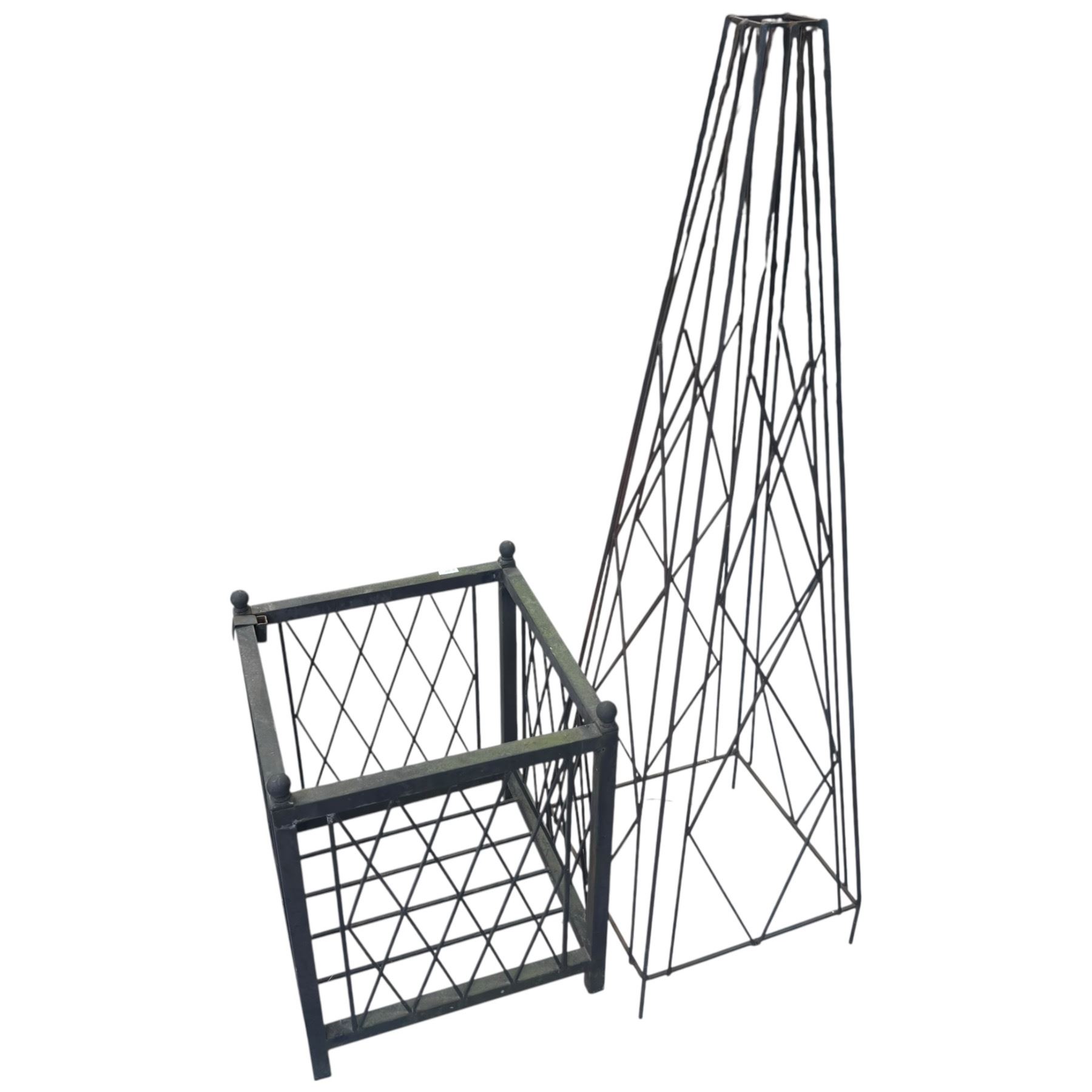 Garden set includes a metal planter basket measuring 15x15x19-Inch and a matching metal trellis 15-Inch tall. Both items are designed for garden use and are as pictured.
