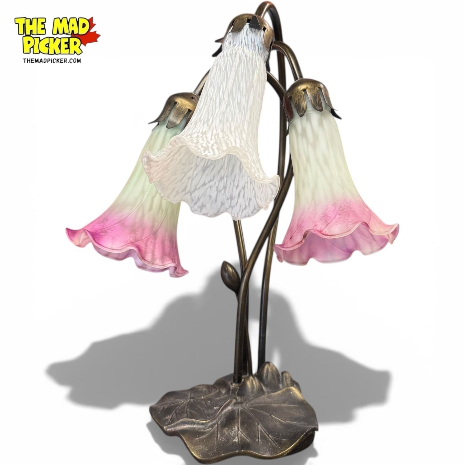 Meyda Tiffany Style Pond Lily accent lamp featuring three lights with hand-blown pink and white art glass shades. The base has a mahogany bronze finish, evoking an antique aesthetic. This lamp showcases a design inspired by natural lily forms and includes intricate detailing characteristic of Meyda's craftsmanship.