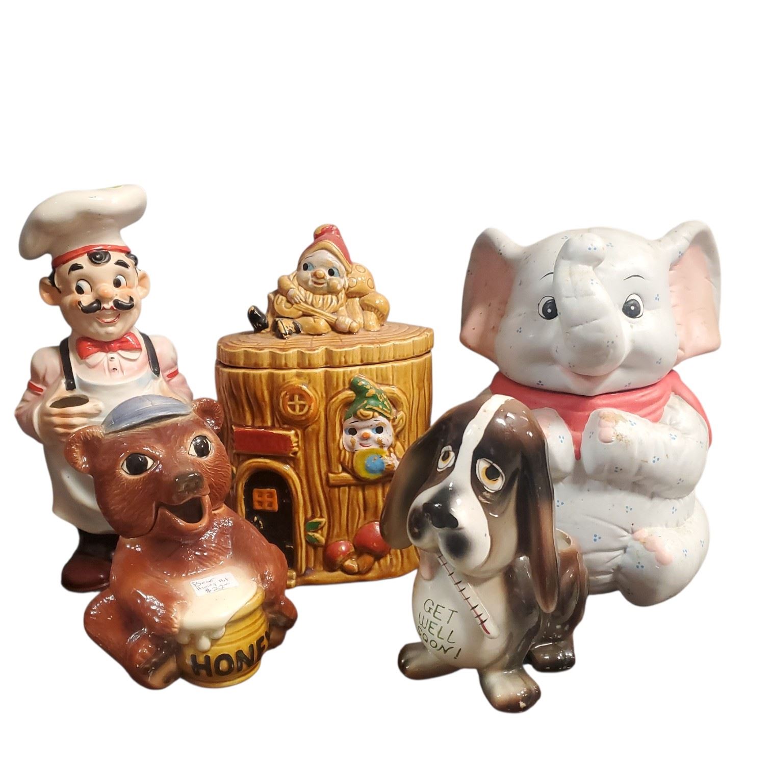 Collection of mid-century ceramic decorative items including cookie jars, planters, and a utensil holder. The tallest piece measures 12-Inch in height. Items feature mid-century design elements. Item is as pictured.