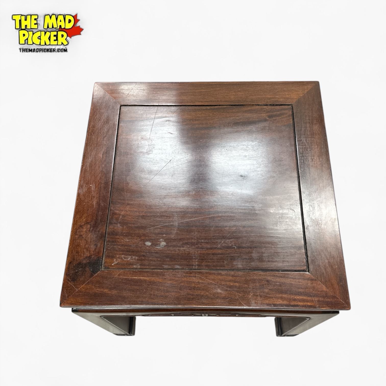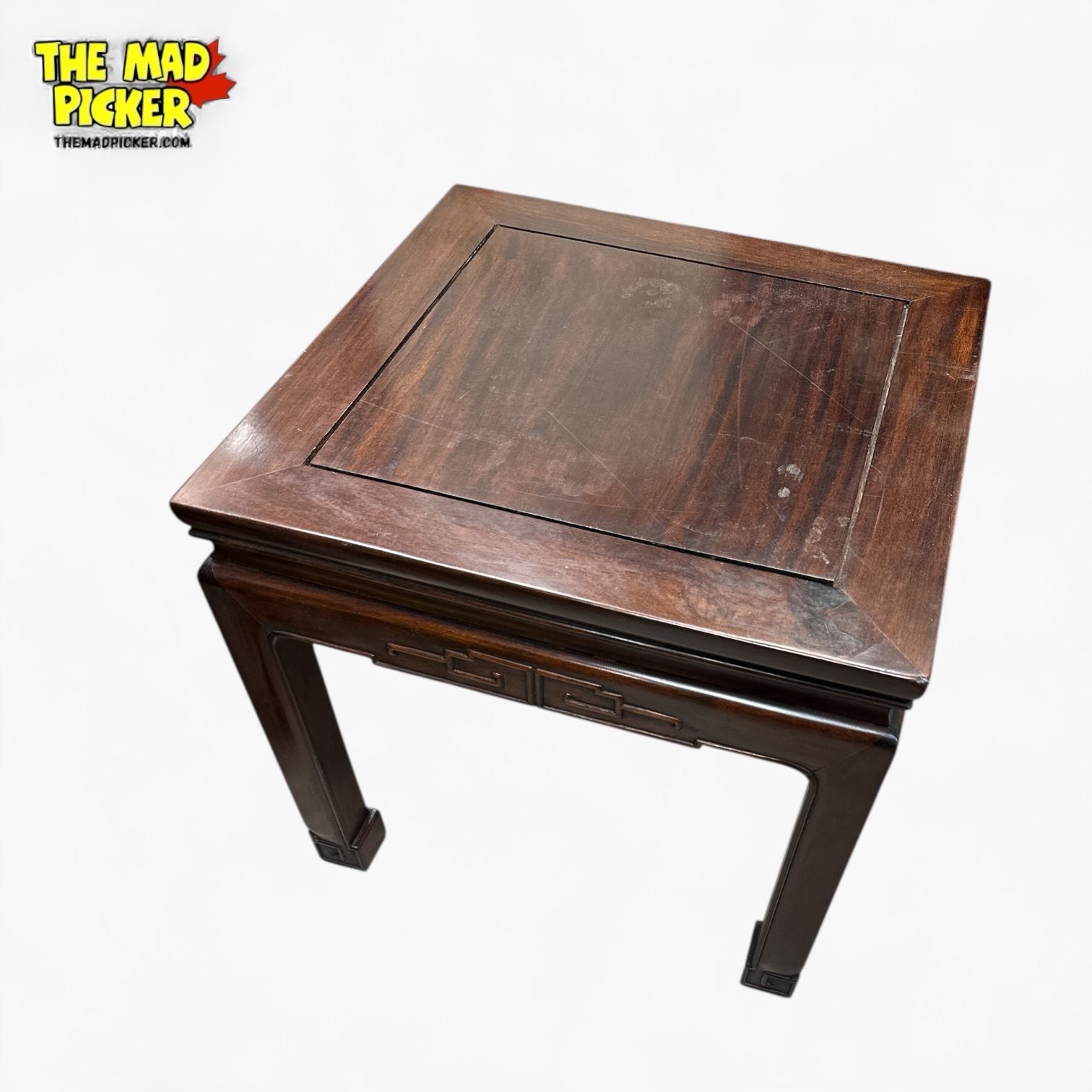 Mid-century Chinese rosewood table in Ming style. Features intricate hand-carved detailing and a warm, natural rosewood finish. Dimensions are 18x18x16 inches. Crafted with traditional joinery techniques. Ideal as a side table or display piece reflecting classic Ming dynasty design aesthetics.