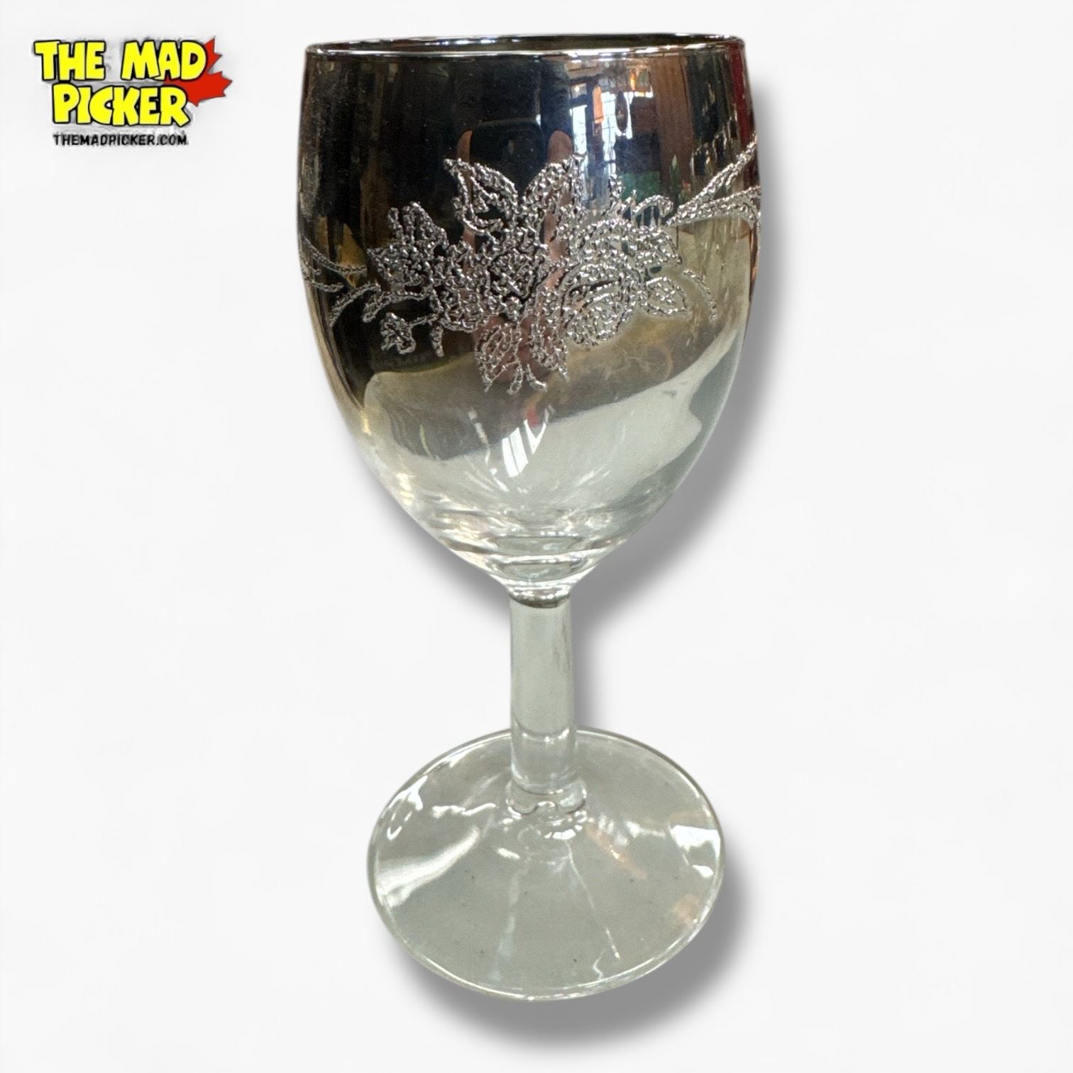 Set of 7 Mid-Century Modern wine glasses in the Dorothy Thorpe style. Features a silver fade finish with floral design detailing. Typical of the 1950s-1960s era, these glasses represent a quintessential example of mid-century aesthetic. Condition and dimensions not specified.