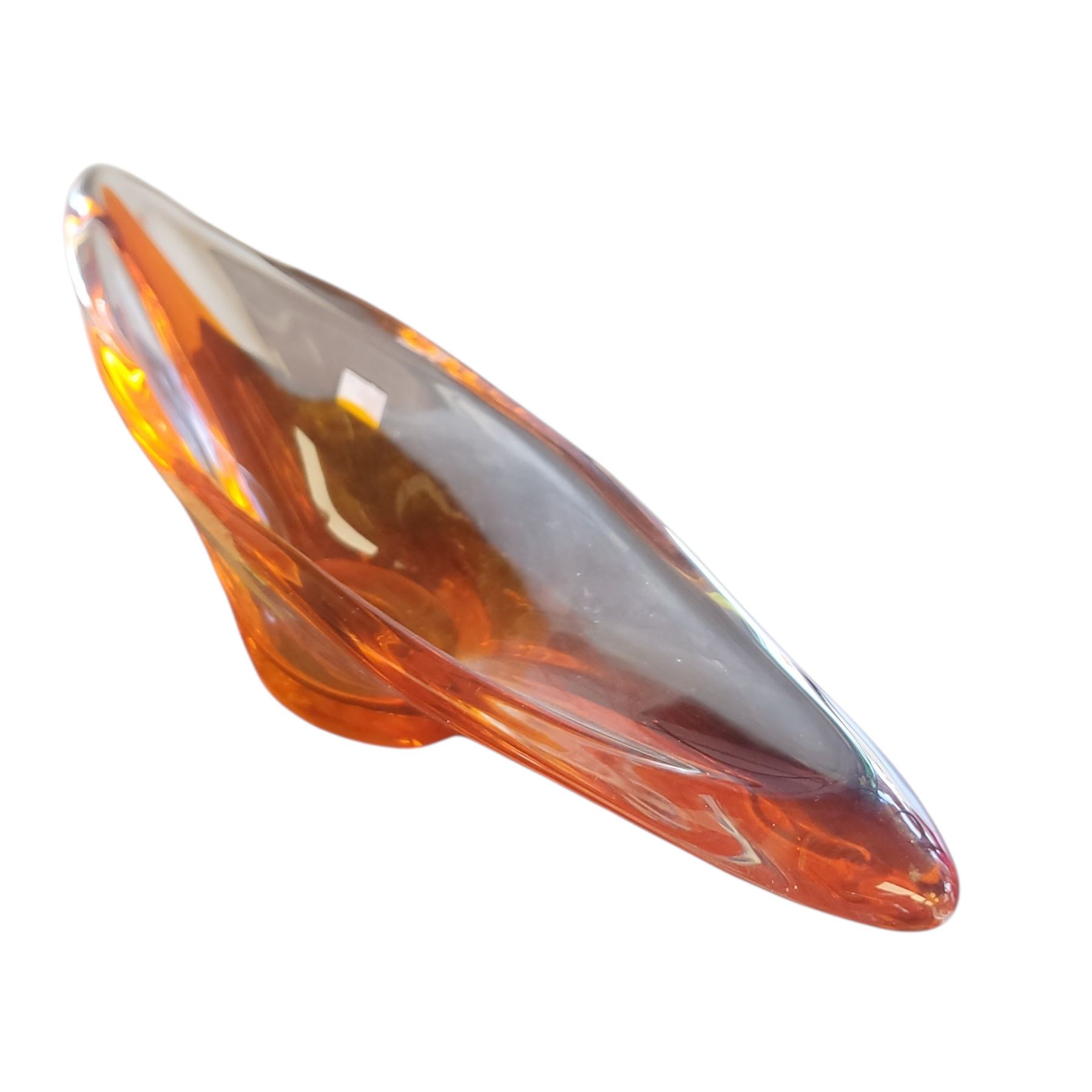 Mid Century Modern art glass centerpiece bowl in Coquille style. Features orange & clear coloration. This decorative bowl is 16-Inch wide and showcases a flowing, organic form characteristic of Coquille glass design. Item is as pictured.