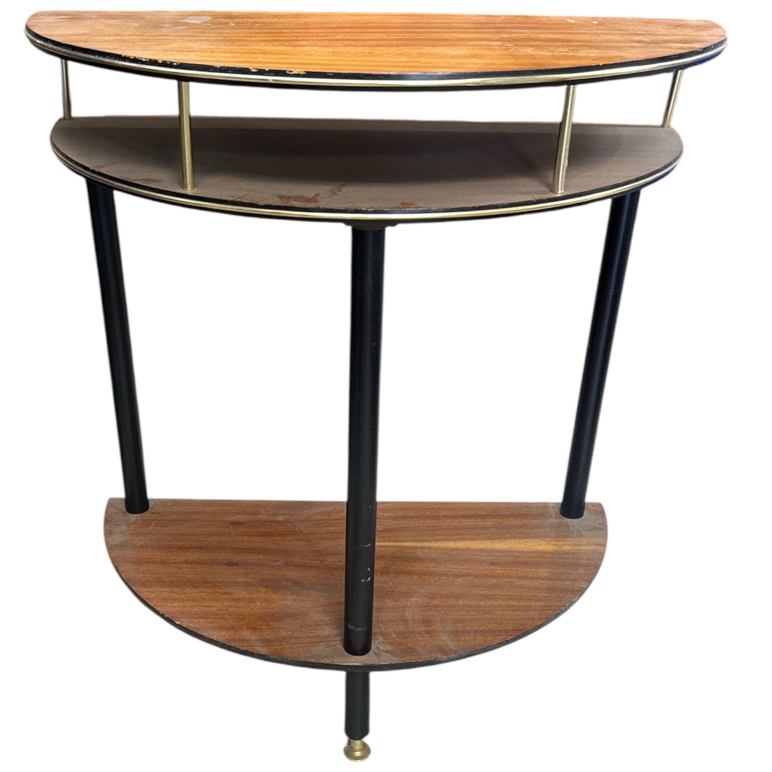 Mid Century Modern demilune half moon table featuring veneered surface and brass accents. Measures 25x12.5x28-Inch tall. The table showcases classic mid-century design elements with curved lines and mixed materials. Item is as pictured.