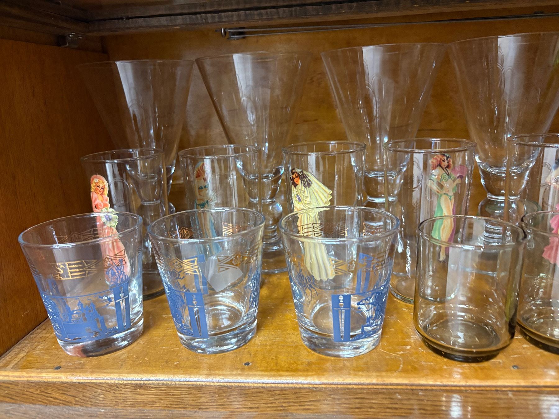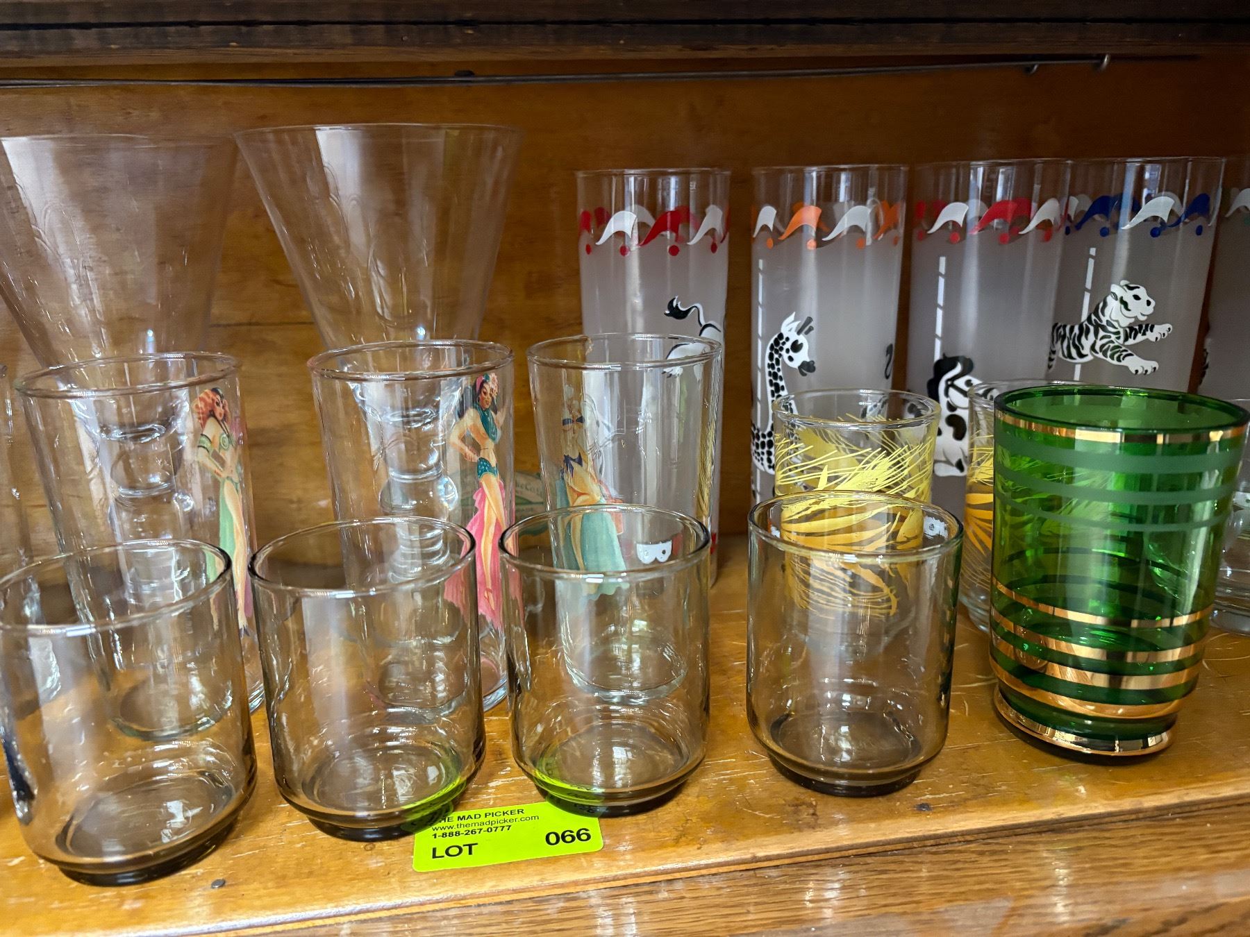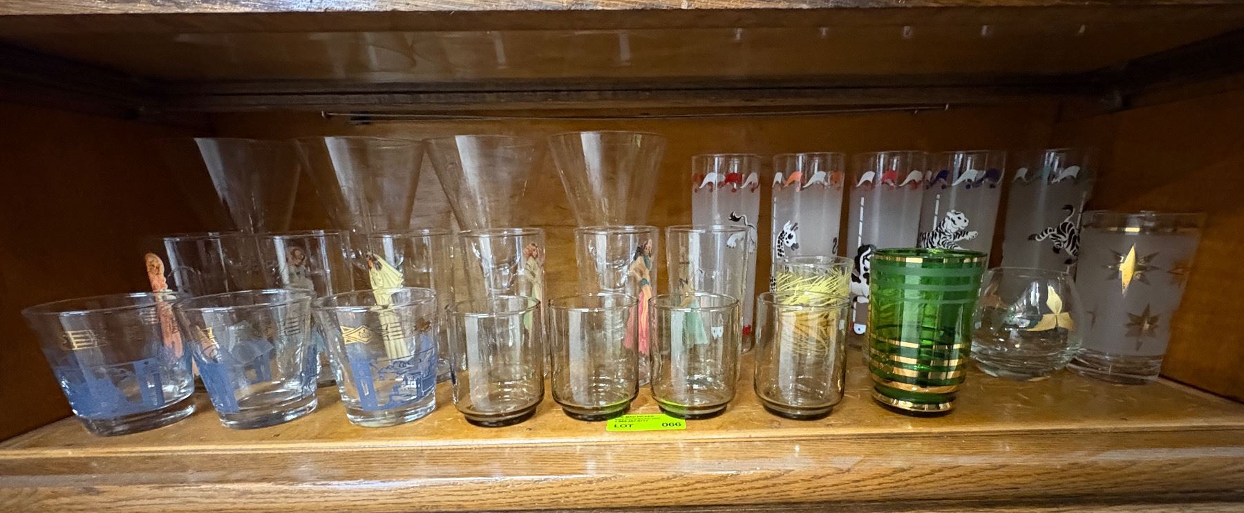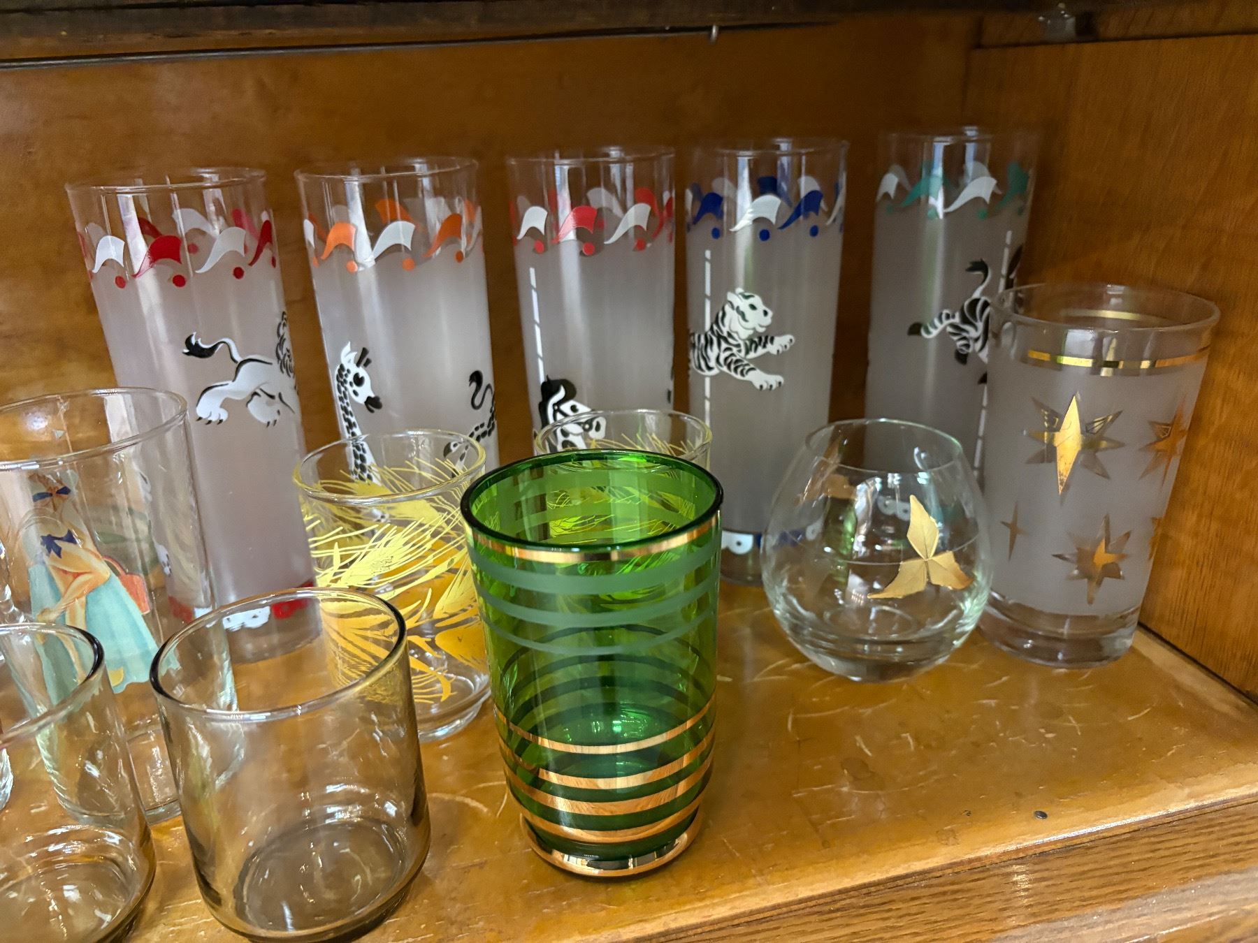 A collection of mid-century modern glassware, featuring pieces by Libbey and various other makers. Includes assorted drinkware with design elements reflective of the mid-20th century aesthetic. Likely produced between the 1950s and 1970s. Variety of styles and patterns characteristic of the era.