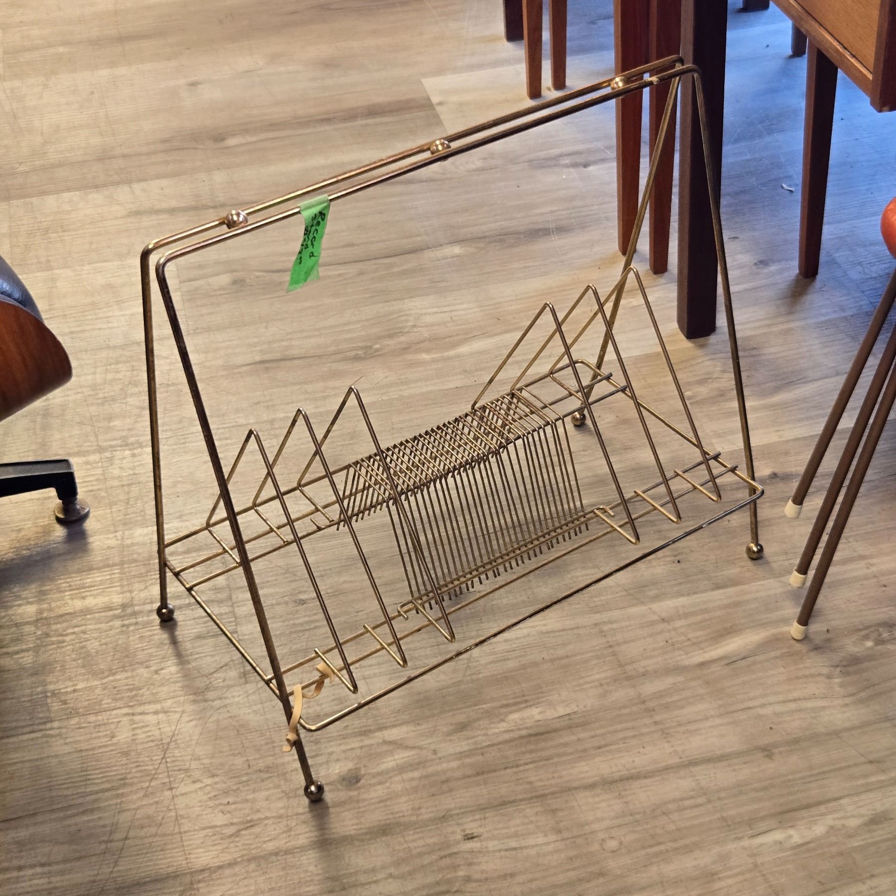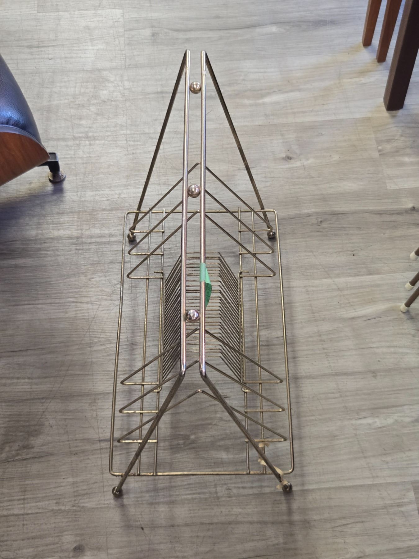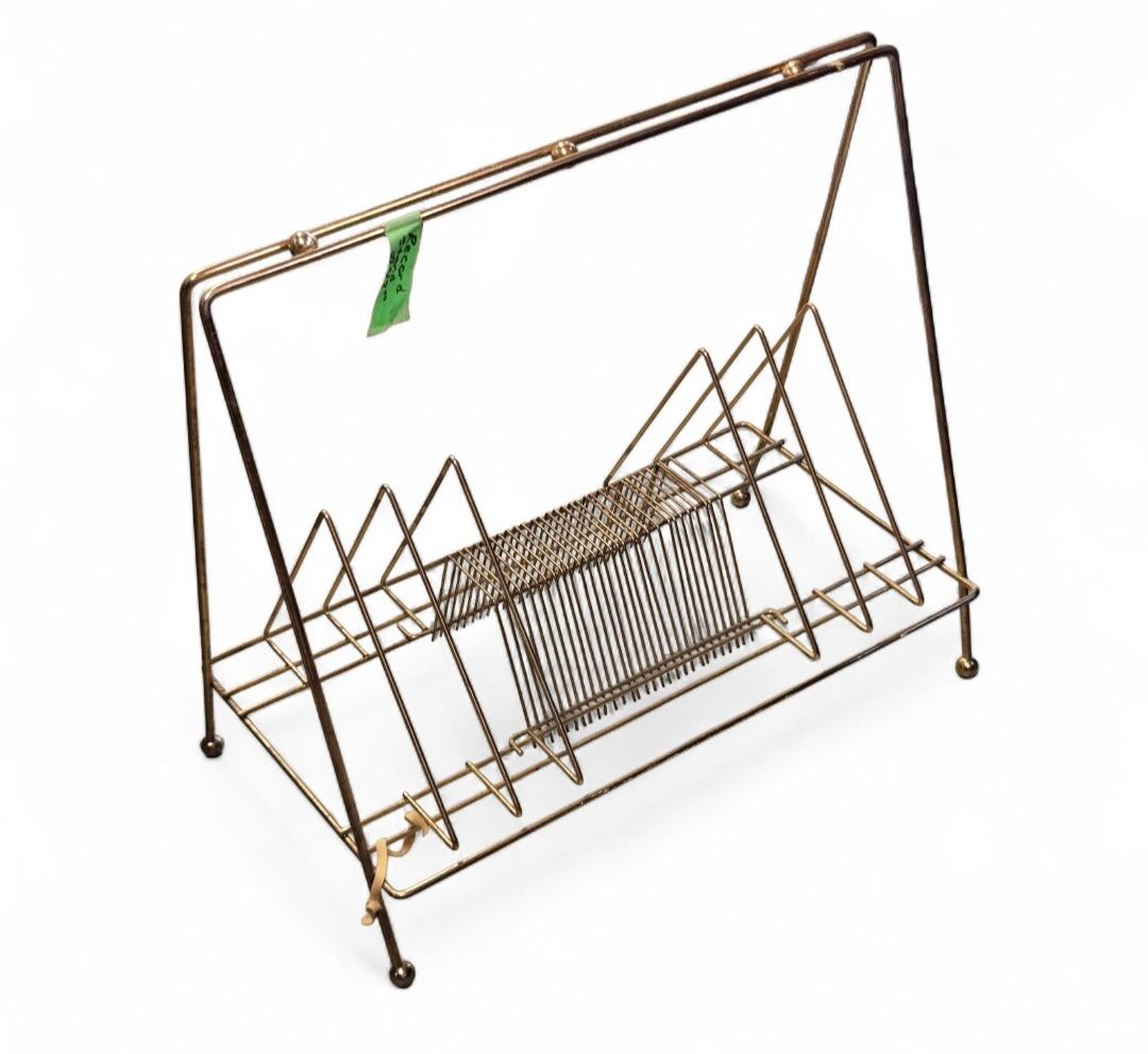 Mid Century Modern record and magazine rack made of gold-tone wire. Measures 19x11x17 inches. Features a slotted design suitable for storing records or magazines. Period design reflective of mid-20th century styling. Item is as pictured.