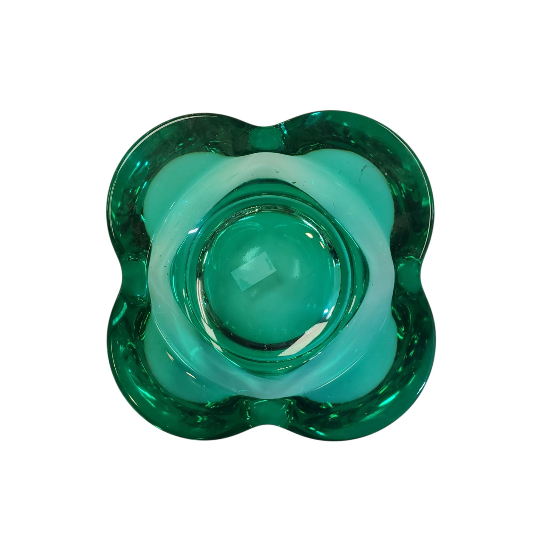 Mid-century modern green art glass ashtray bowl, unsigned. Features a smooth, organic shape with a bright green hue. Measures 5.75 inches across. Likely hand-blown, typical of mid-century glass design aesthetics. Functional as an ashtray or decorative item.