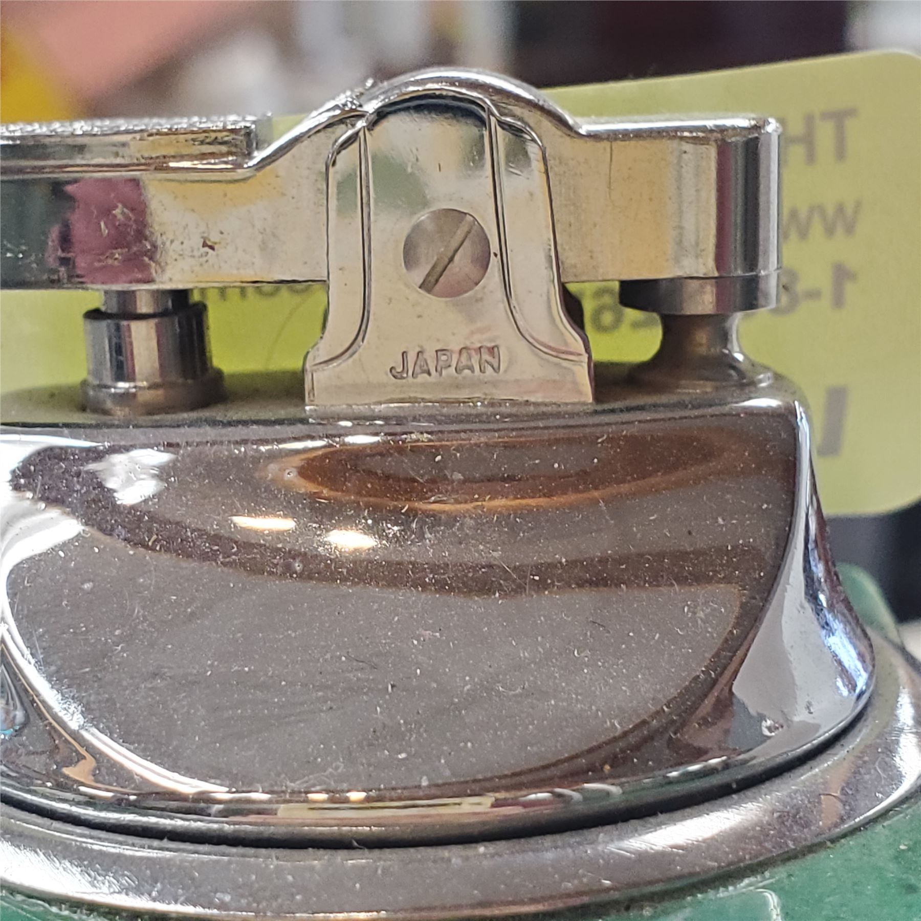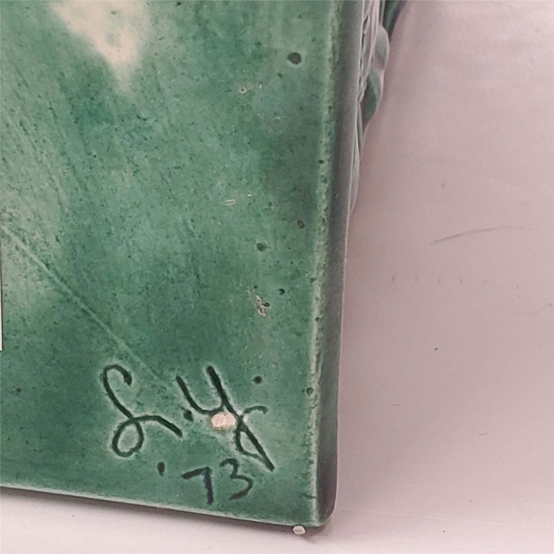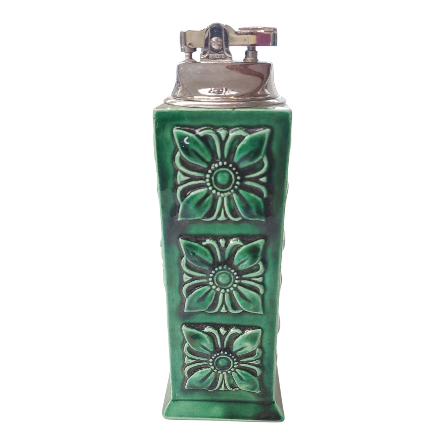 Mid-Century Modern ceramic table lighter in green glaze, signed 'L.Y. 73' on the base, indicating production in 1973. Standing 6.5 inches tall. Features a sleek, sculptural form consistent with 1970s design aesthetics. Functional, designed for both use and decorative display.