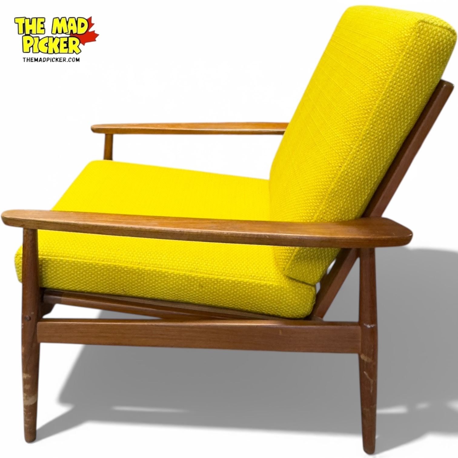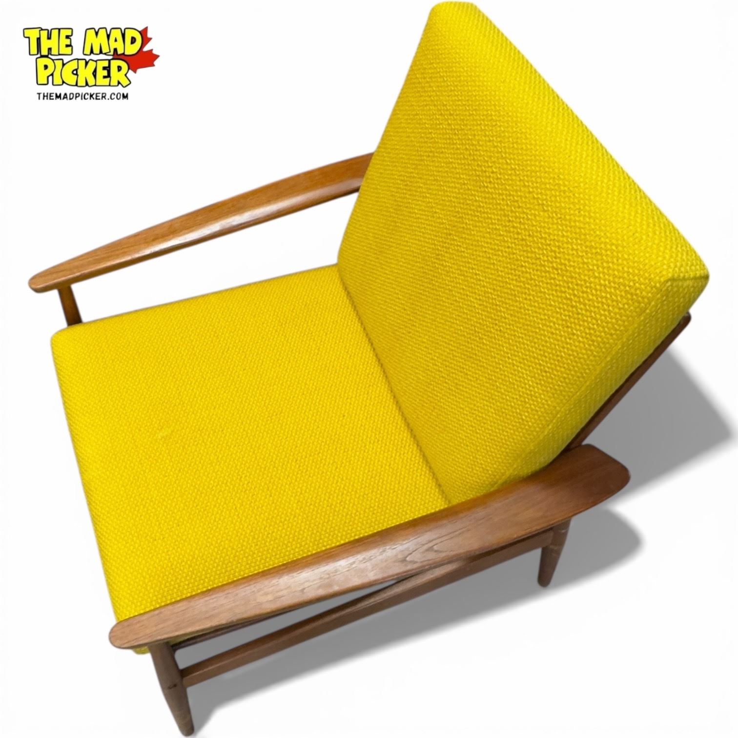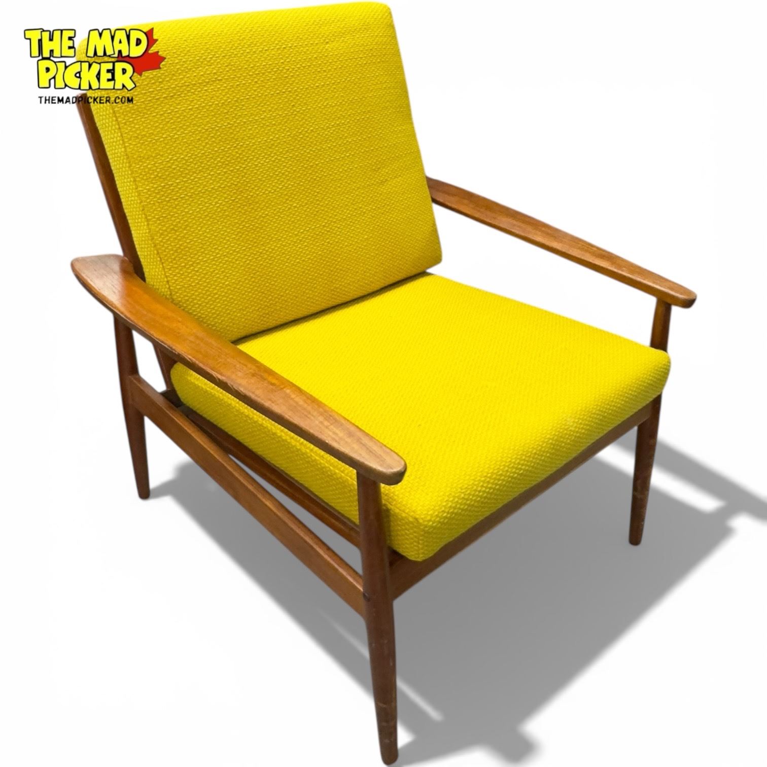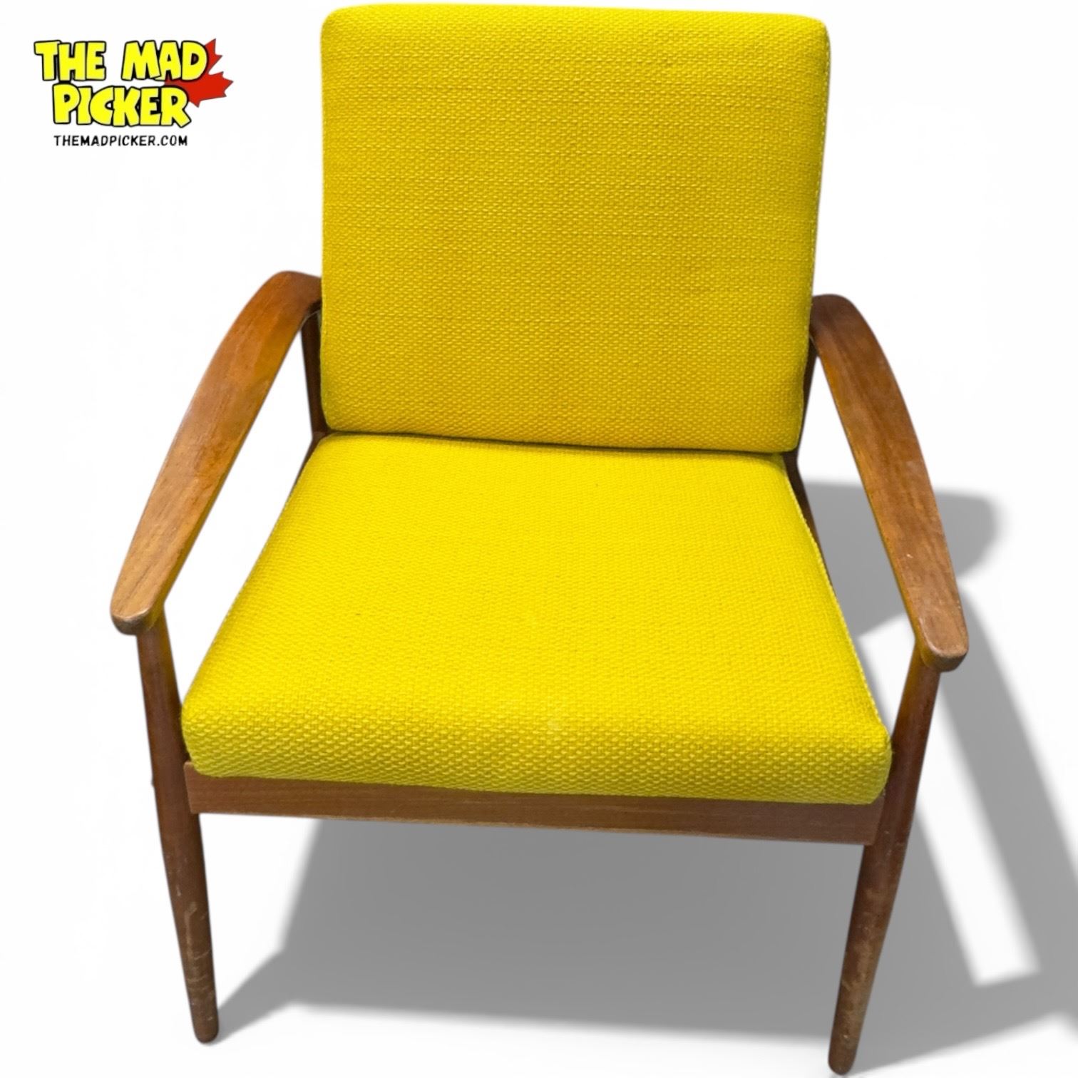 Mid-Century Modern armchair in the style of Grete Jalk, crafted in teak. Features original yellow upholstered cushions. Approximate dimensions: 31in tall, 27.5in wide, 28in depth. Known for its clean lines and functional design, this chair reflects Jalk's Danish design aesthetics from the 1950s-1960s.