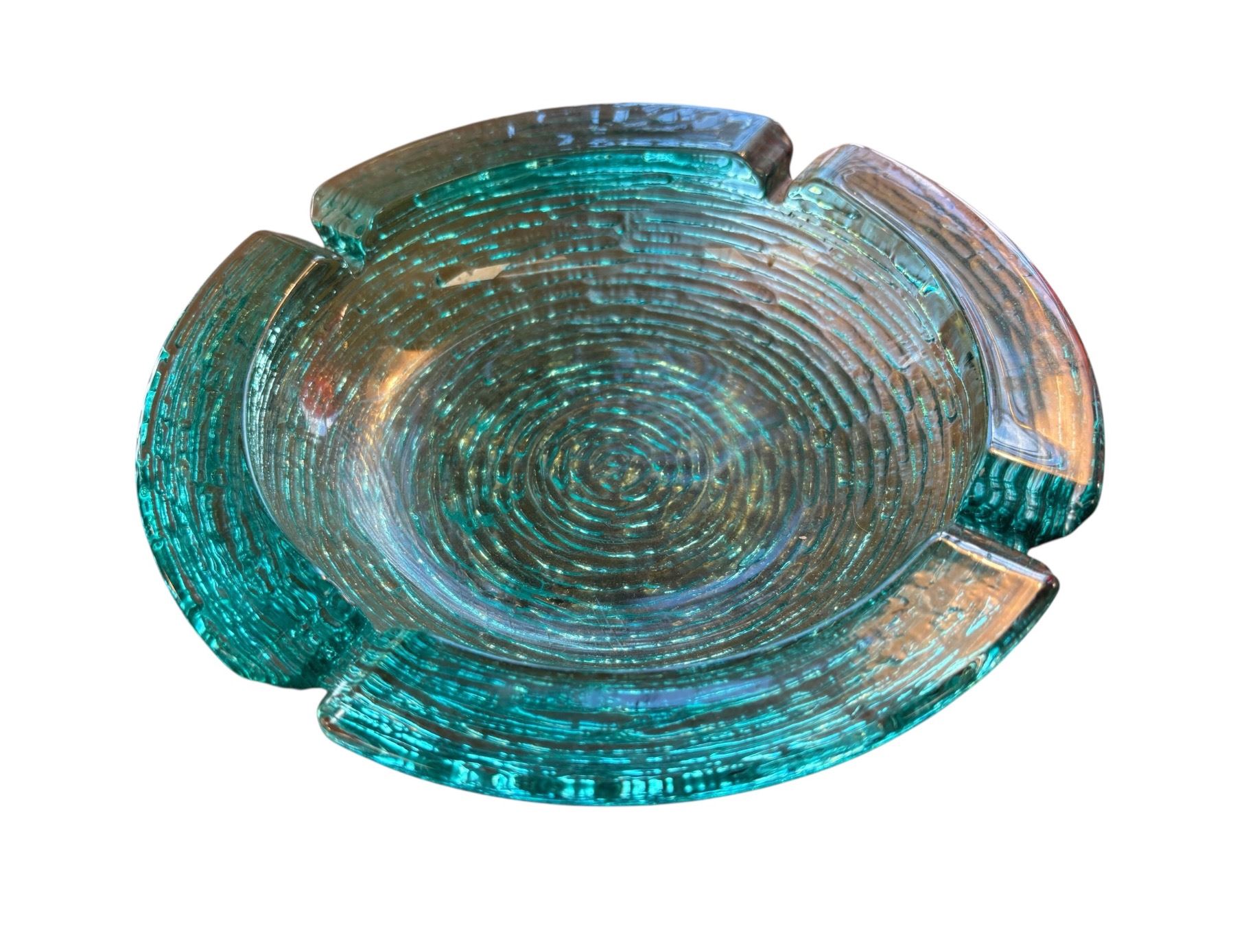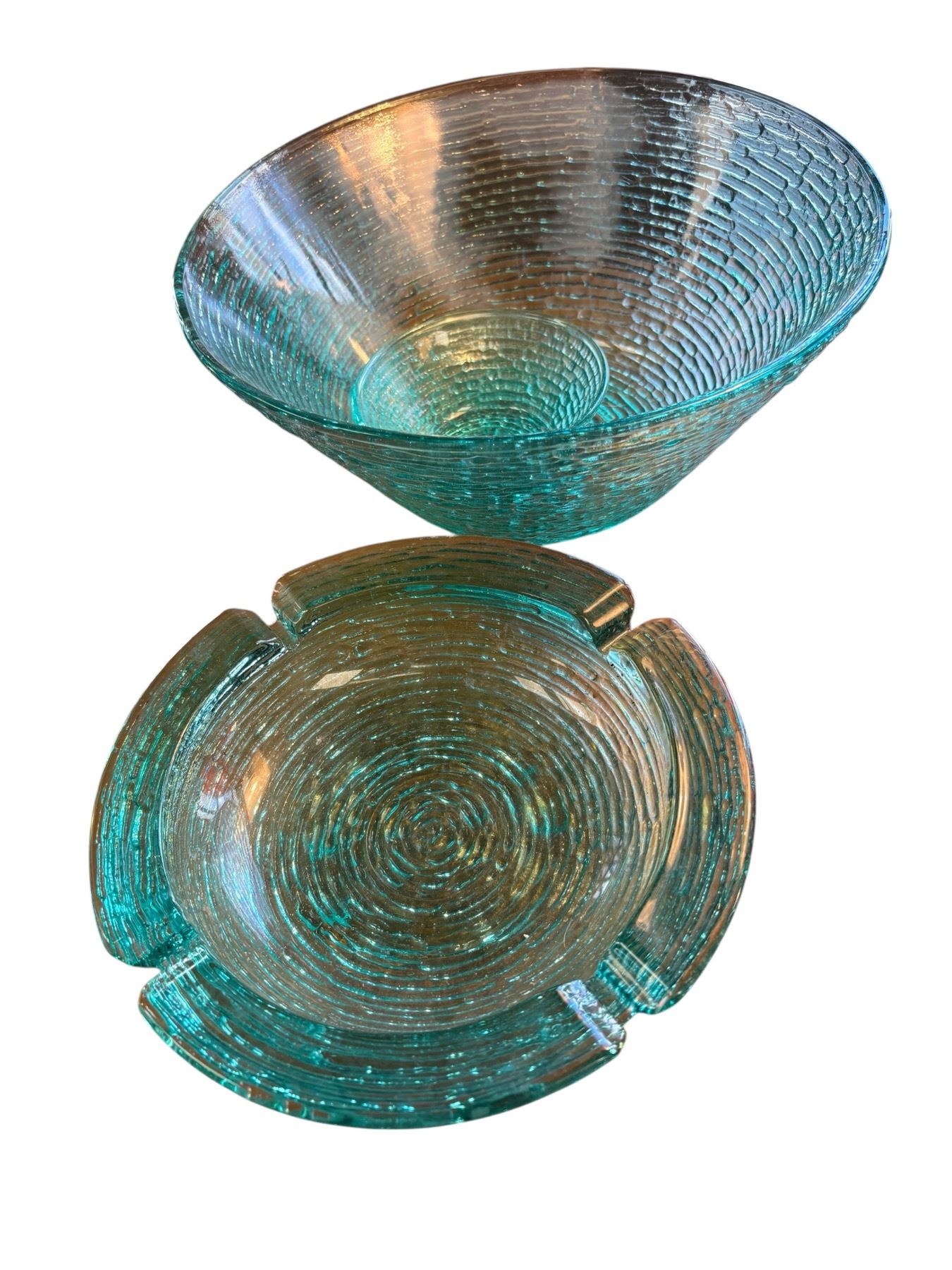Mid Century Modern Soreno series by Anchor Hocking in aquamarine glass. Includes chip & dip bowl and large ashtray with 9-inch diameter. Soreno features textured concentric rings design. Produced in the USA during the mid-20th century. Items are as pictured.