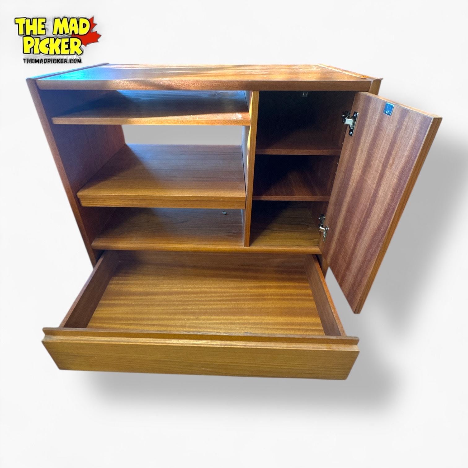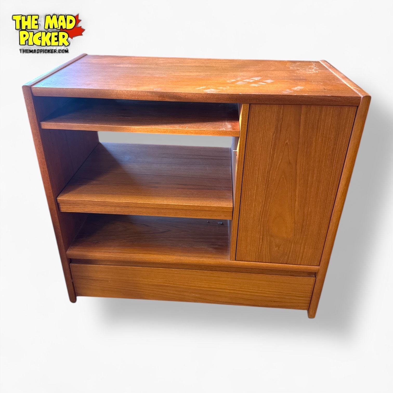 Mid-Century Modern teak cabinet designed as a record player cabinet or sideboard. Features a clean, minimalist design typical of the 1950s-1960s. Measures approximately 33 1/2in Width x 18in Depth x 29 1/2in Height. Functional as media storage or sideboard, showcasing vintage craftsmanship.