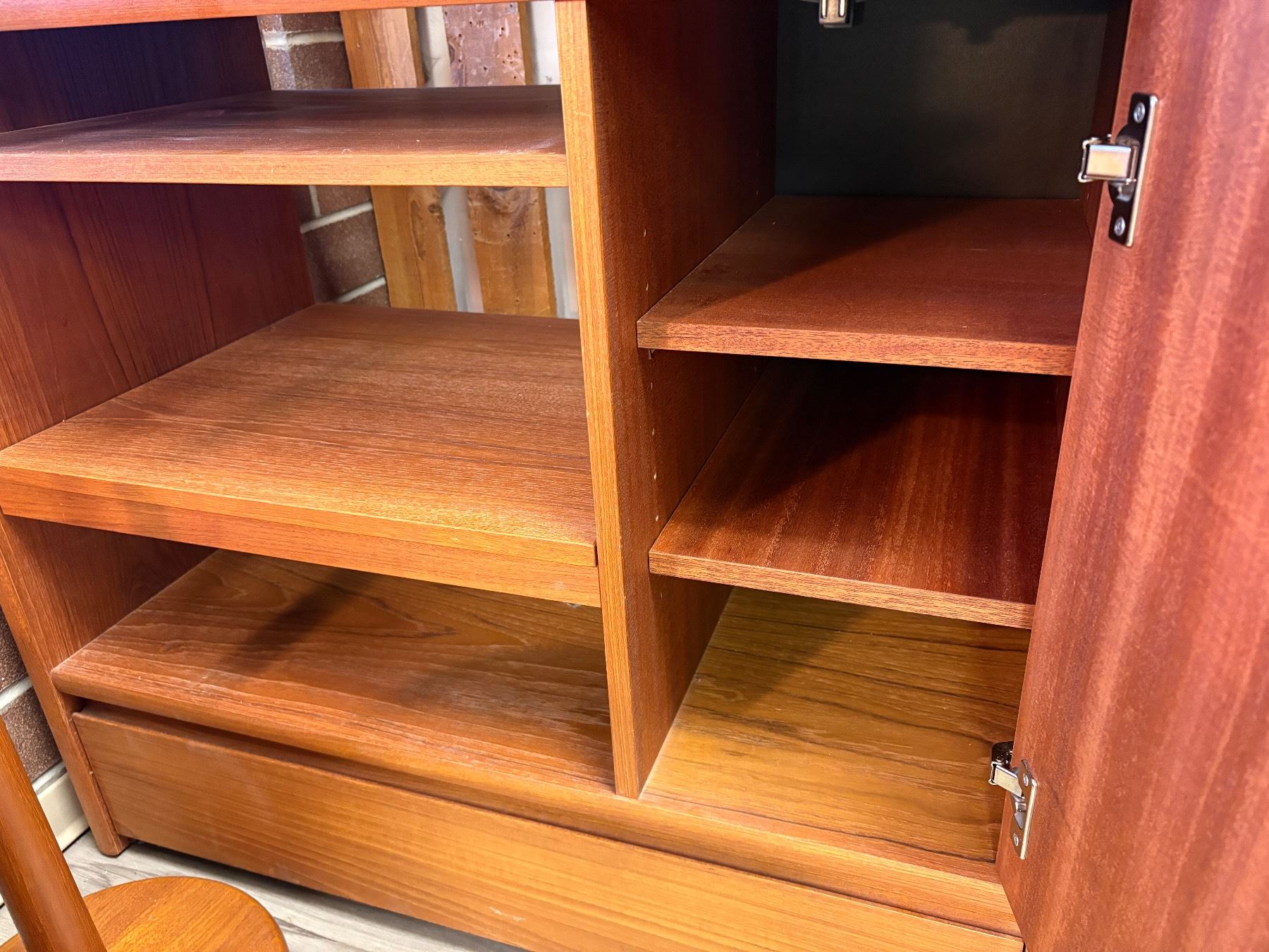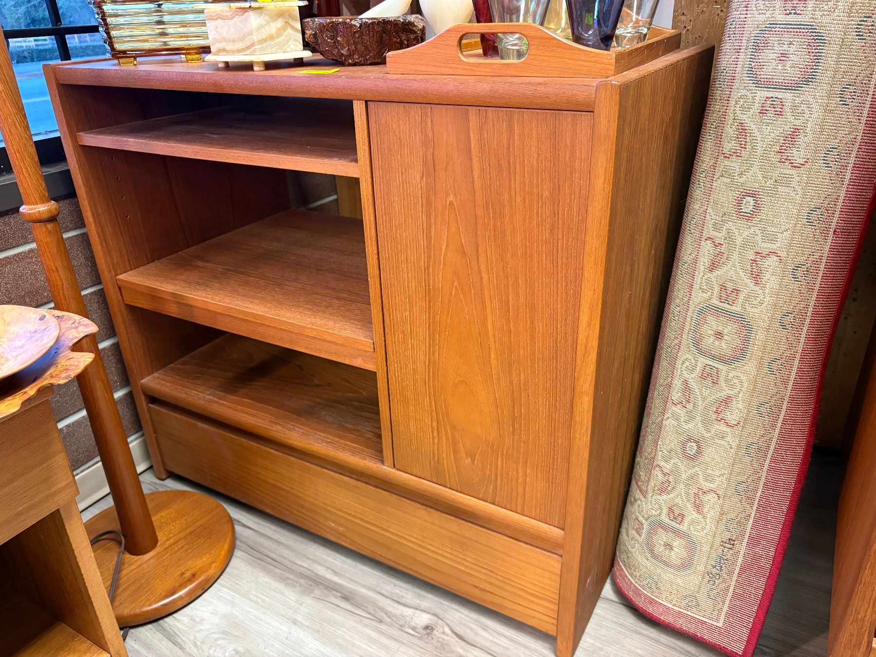 Mid-Century Modern vintage Hi-Fi console with wood finish. Measuring 33.5x18x29.5in, this piece features a classic design typical of the mid-20th century, suitable for audio equipment or storage. Item is as pictured.