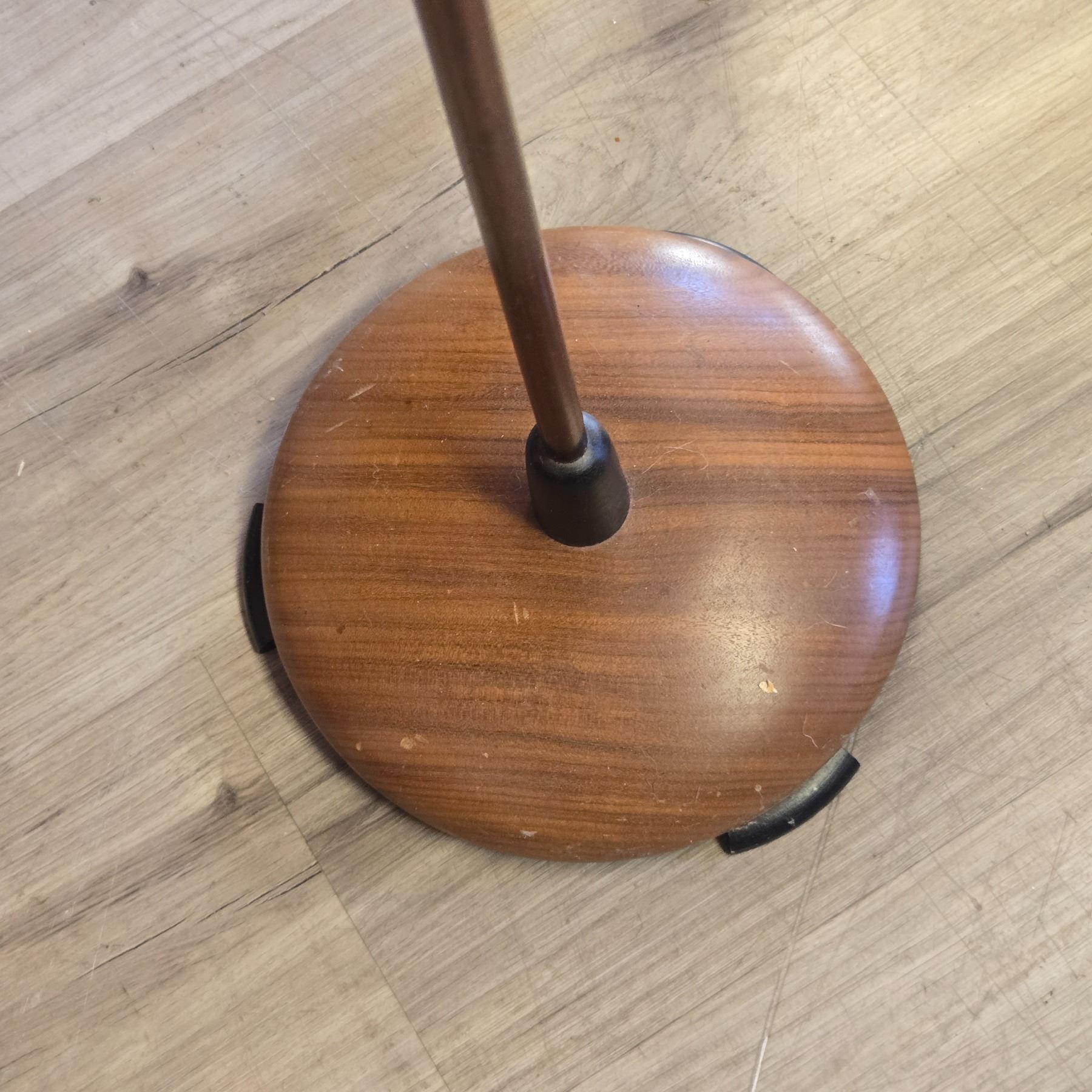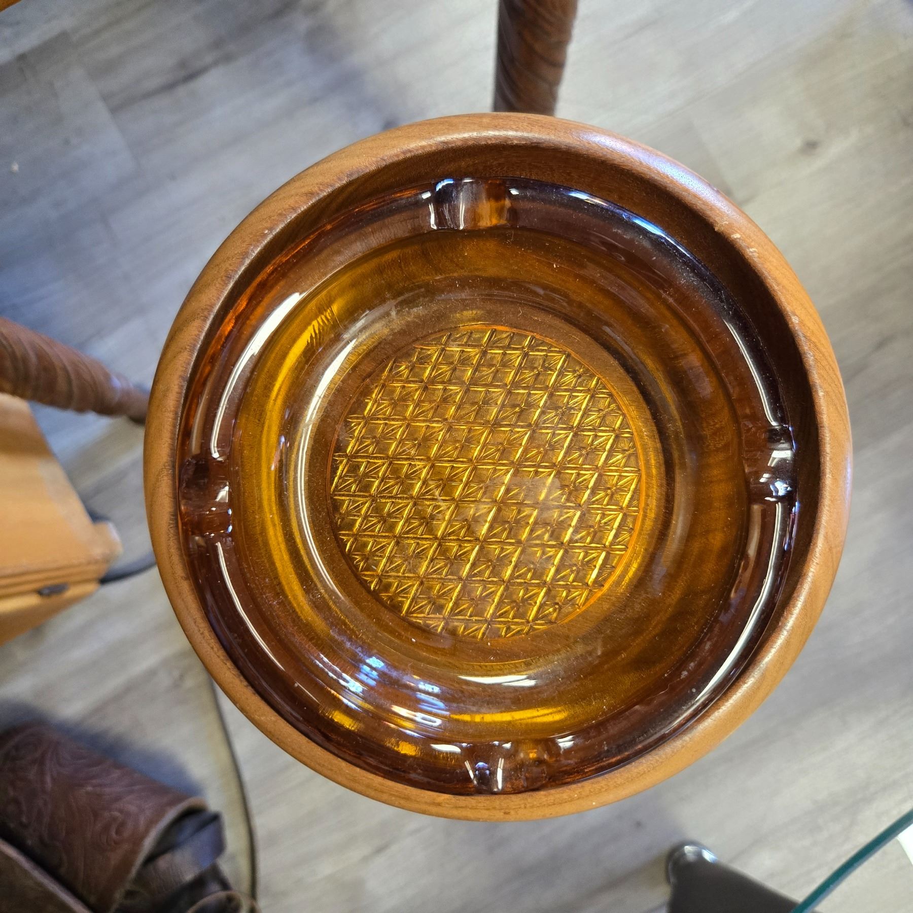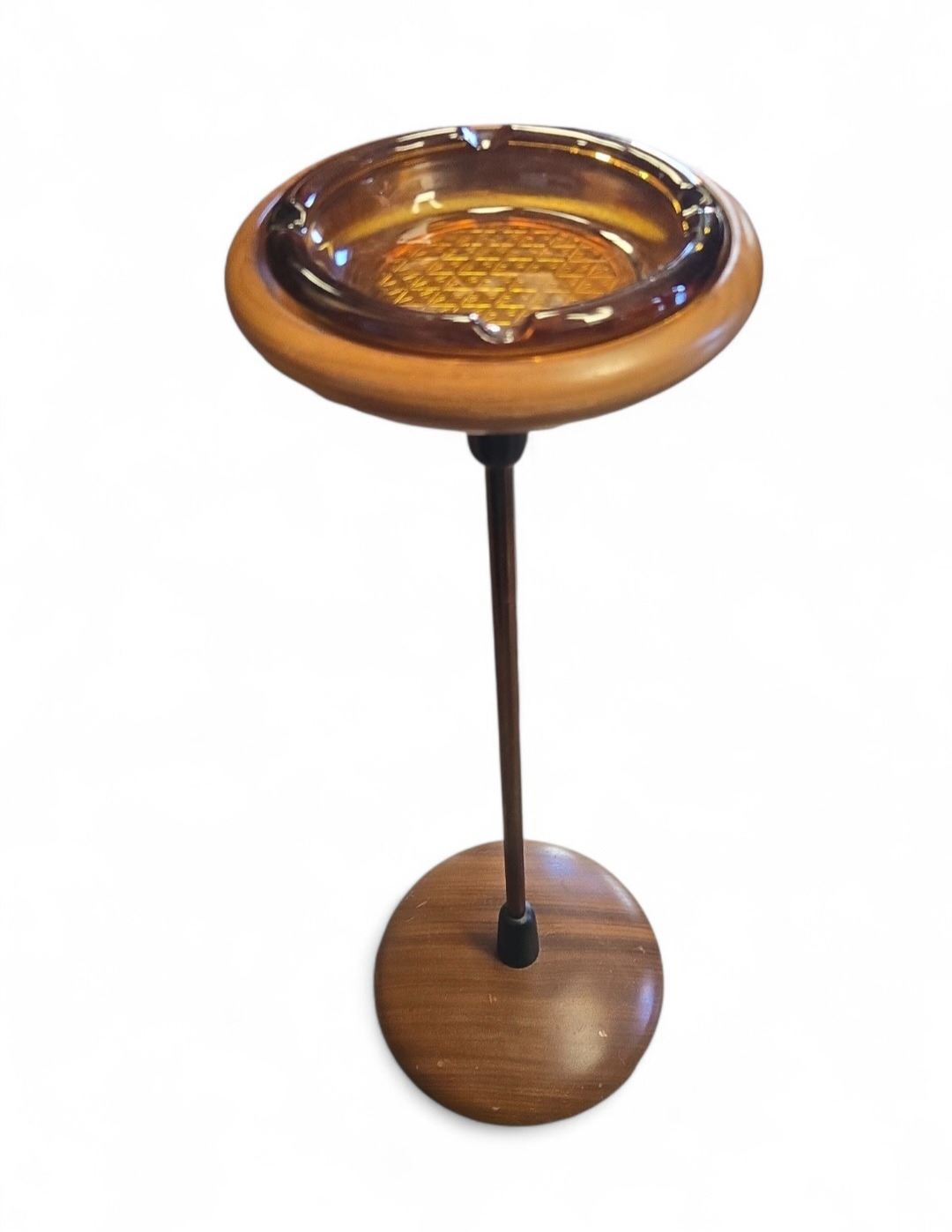 Mid Century Modern floor standing ashtray featuring a wooden base and amber glass ashtray insert. Measures 23.5-Inch tall. The design reflects typical mid-century aesthetics with functional and stylish materials. Item is as pictured.