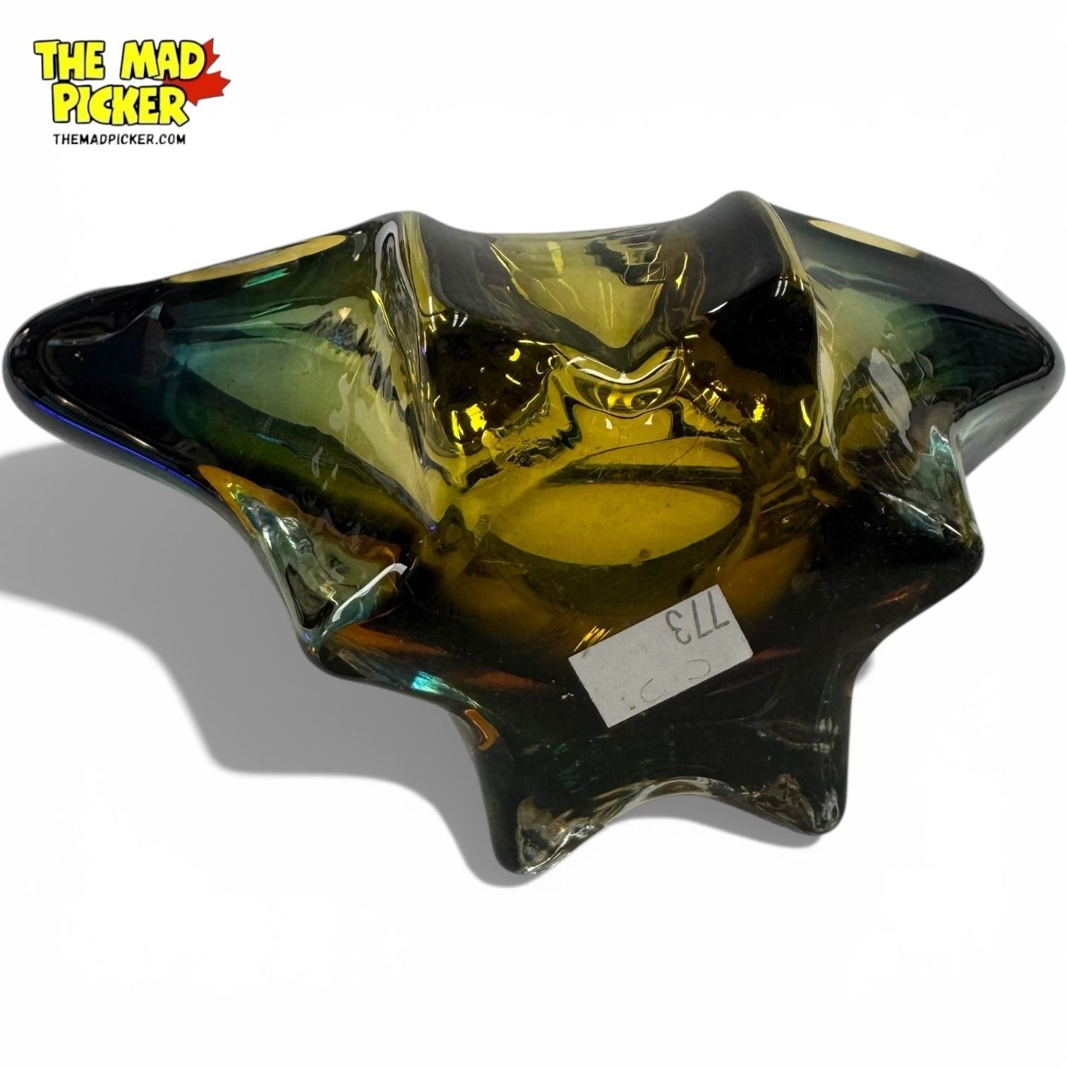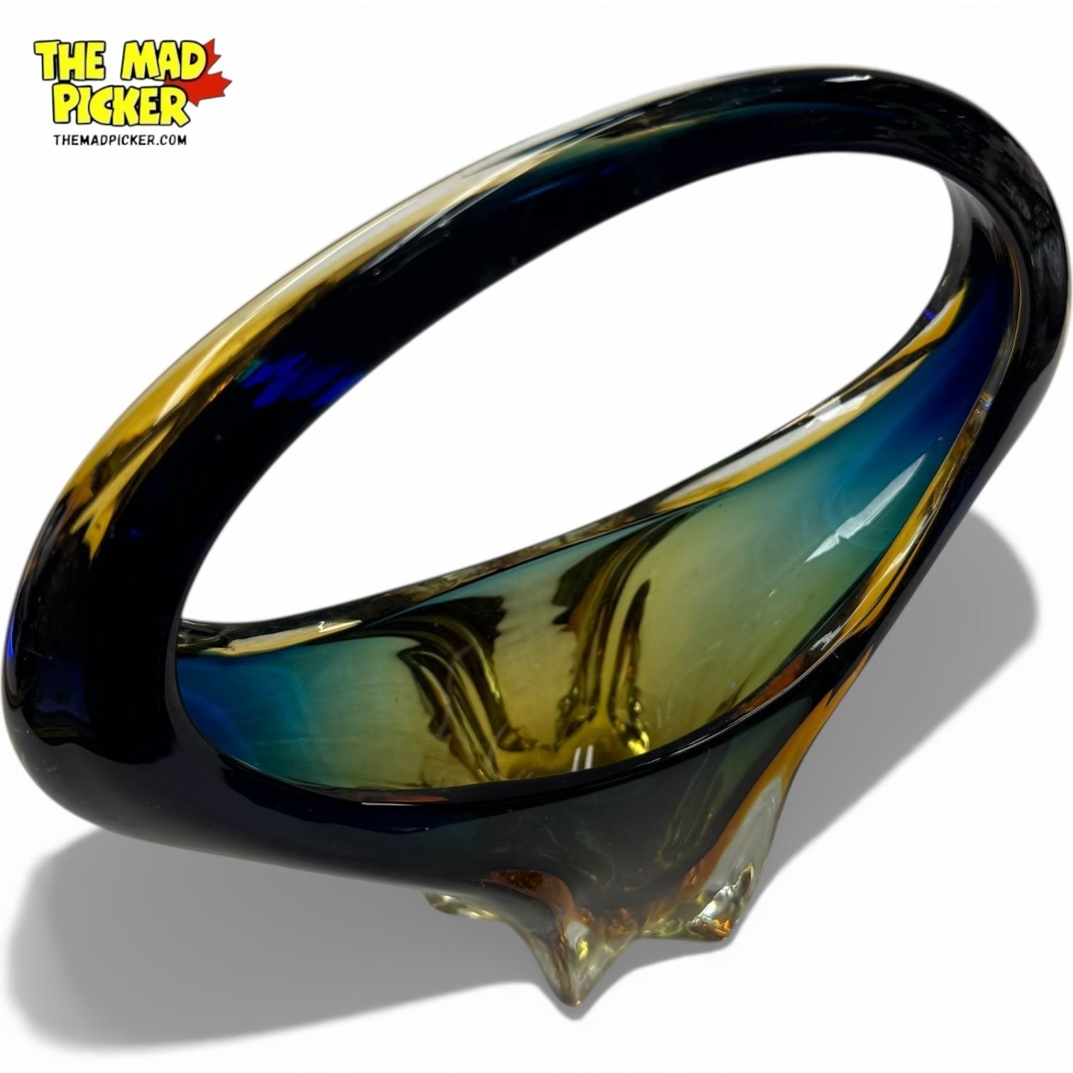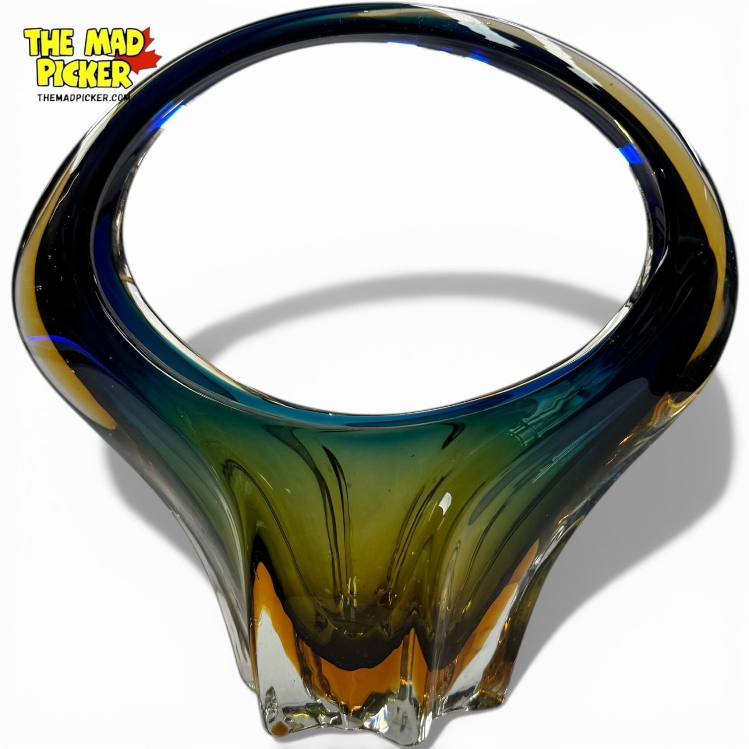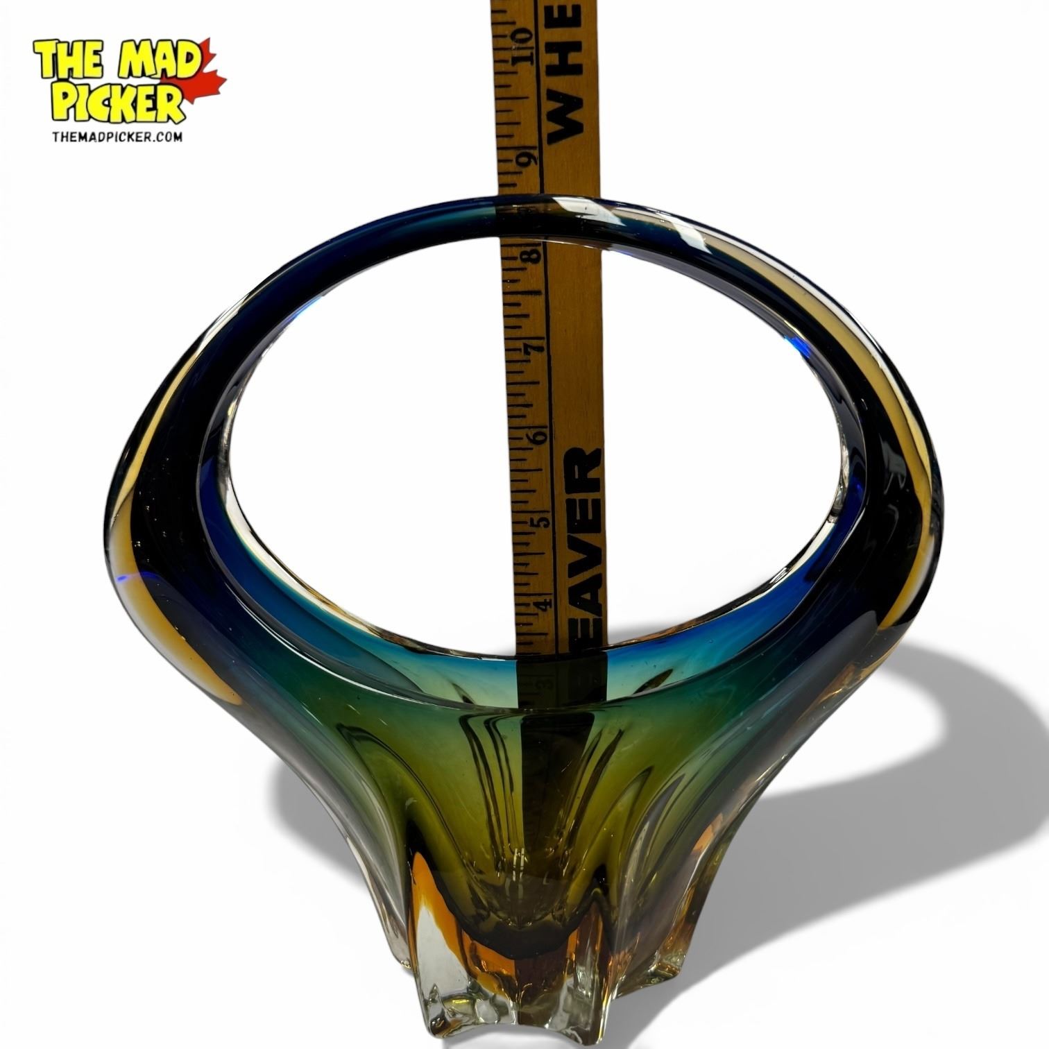 Mid-Century Venetian Art Glass Basket - Vibrant Blue to Amber/Orange - 4" x 9" x 9" tall