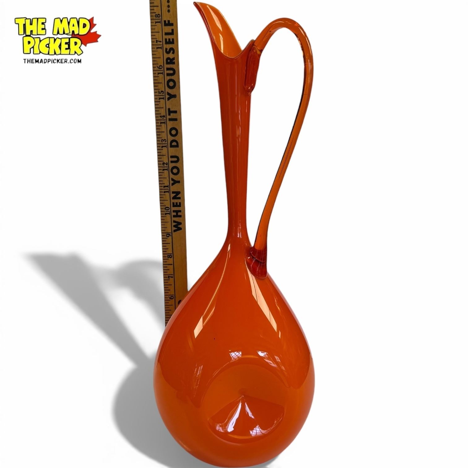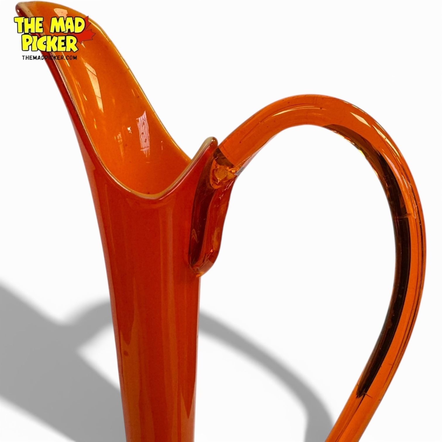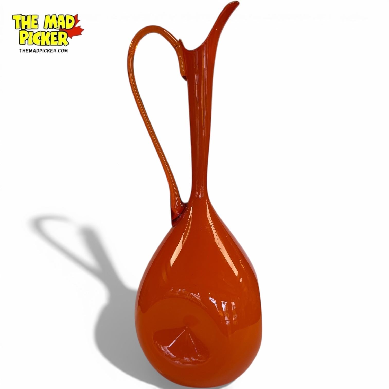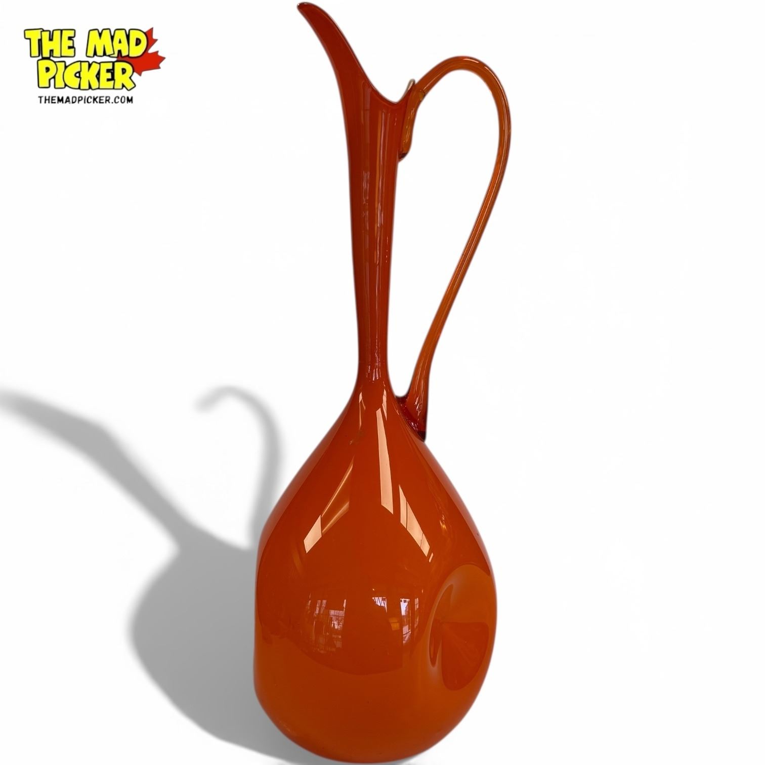Hand-blown cased glass pitcher from mid-century Empoli, Italy. Features a colored external layer over internal white glass, a long neck, angular jug shape, and applied handle. Commonly stands approximately 19 inches tall. Iconic example of mid-century modern Italian glass craftsmanship. Small chip pictured