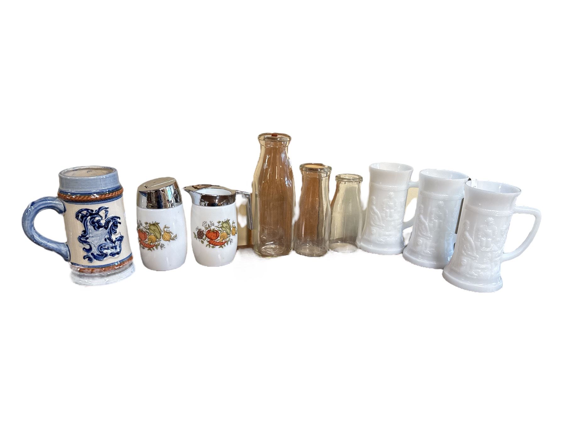 Milk Glass Steins, Sugar/Syrup Dispensers, Vintage Milk Bottles