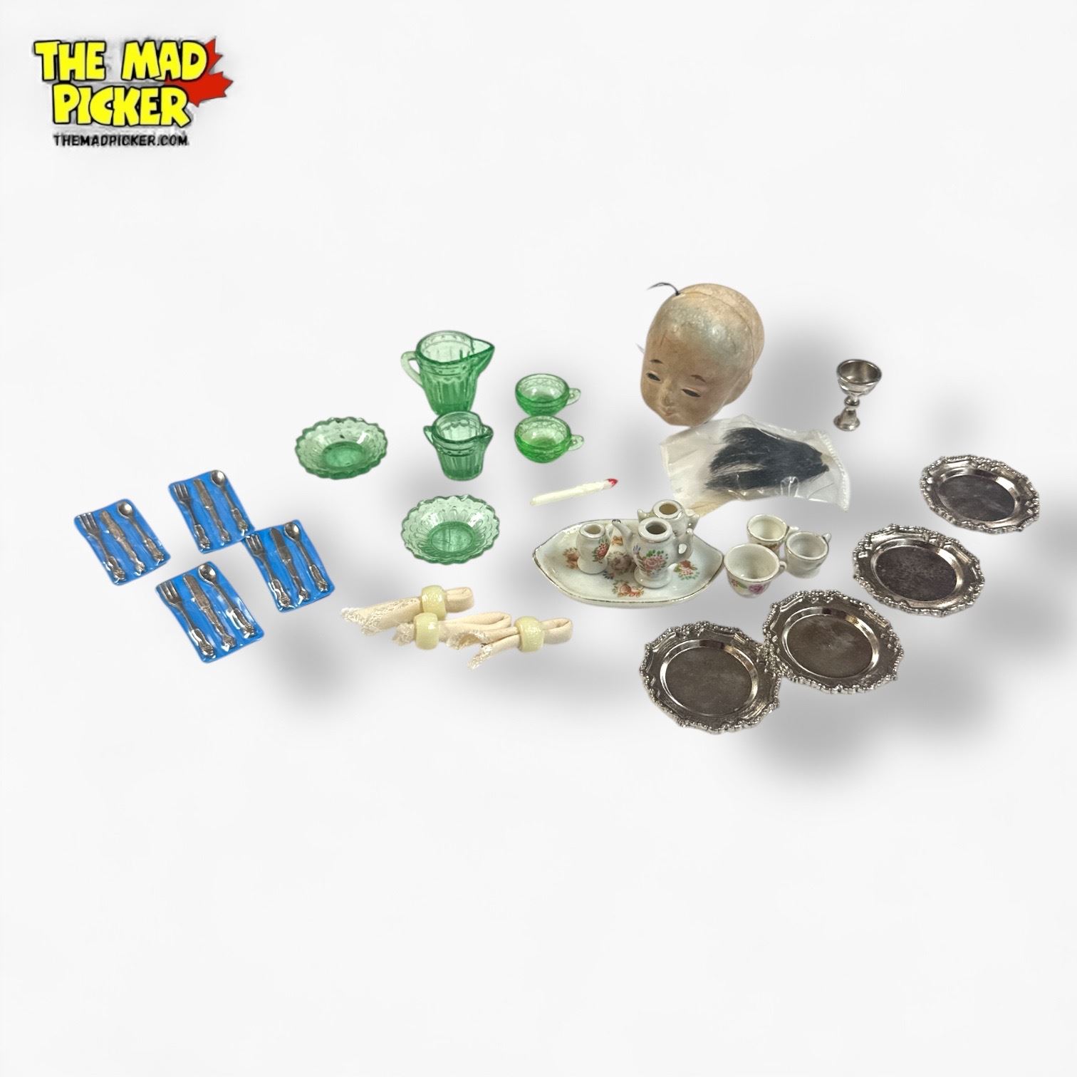 Set of miniature dollhouse decor items including green glass platters, a vintage doll head, and detailed cutlery pieces. Perfectly scaled for dollhouse settings. Likely mid-20th century construction, materials include glass and metal. Unmarked, suitable for vintage dollhouse displays.