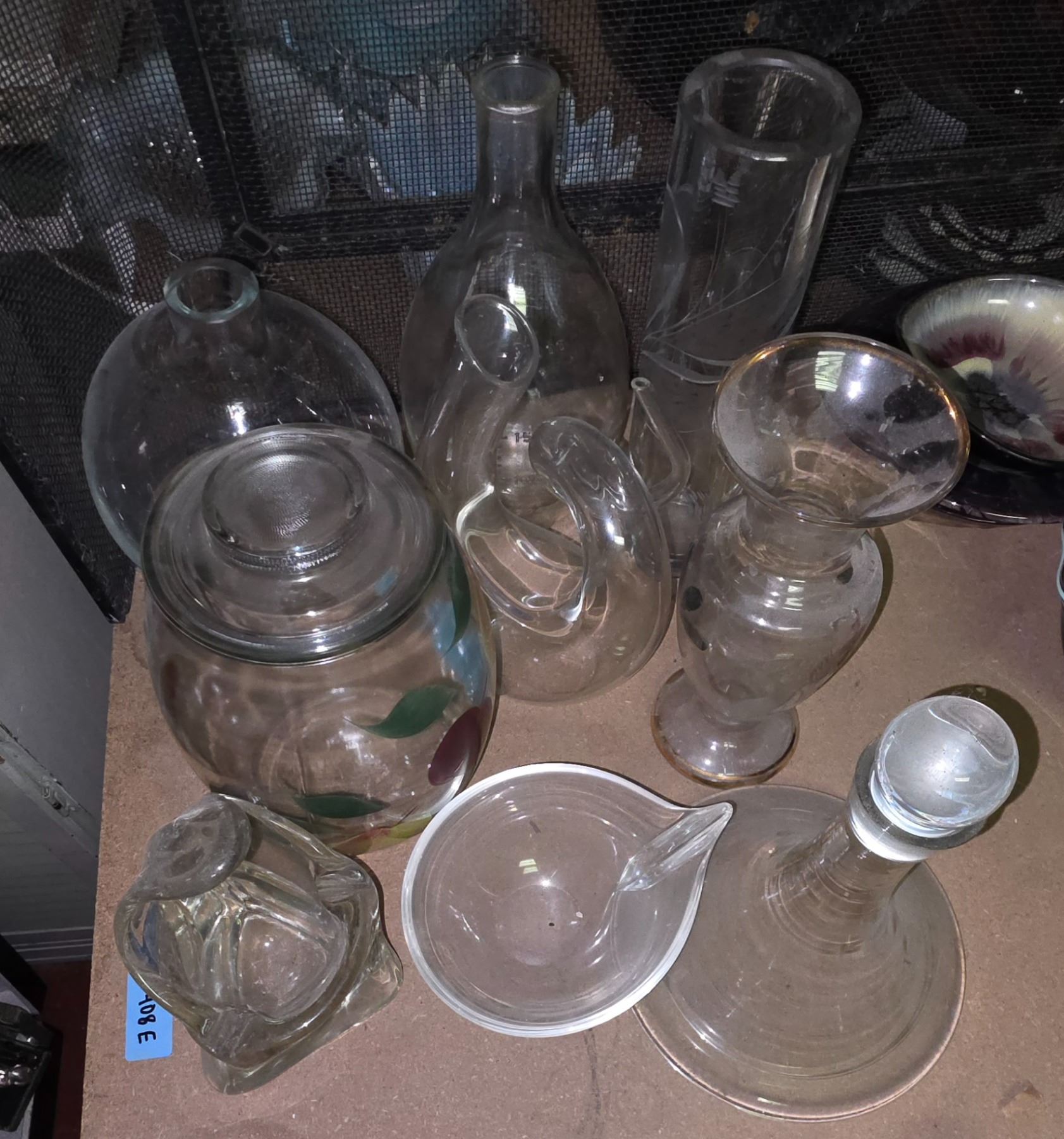 Misc. vintage and mid century decanter, vases, jar, and an ash tray