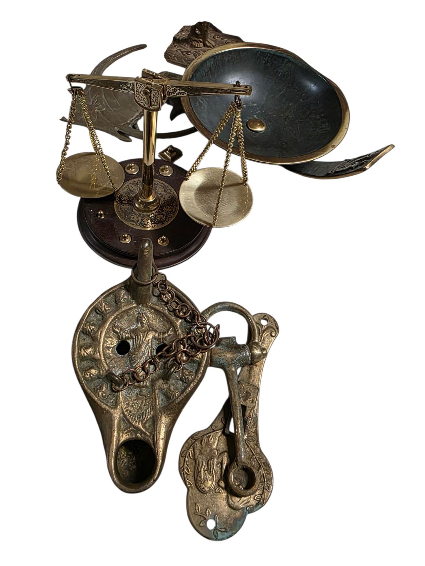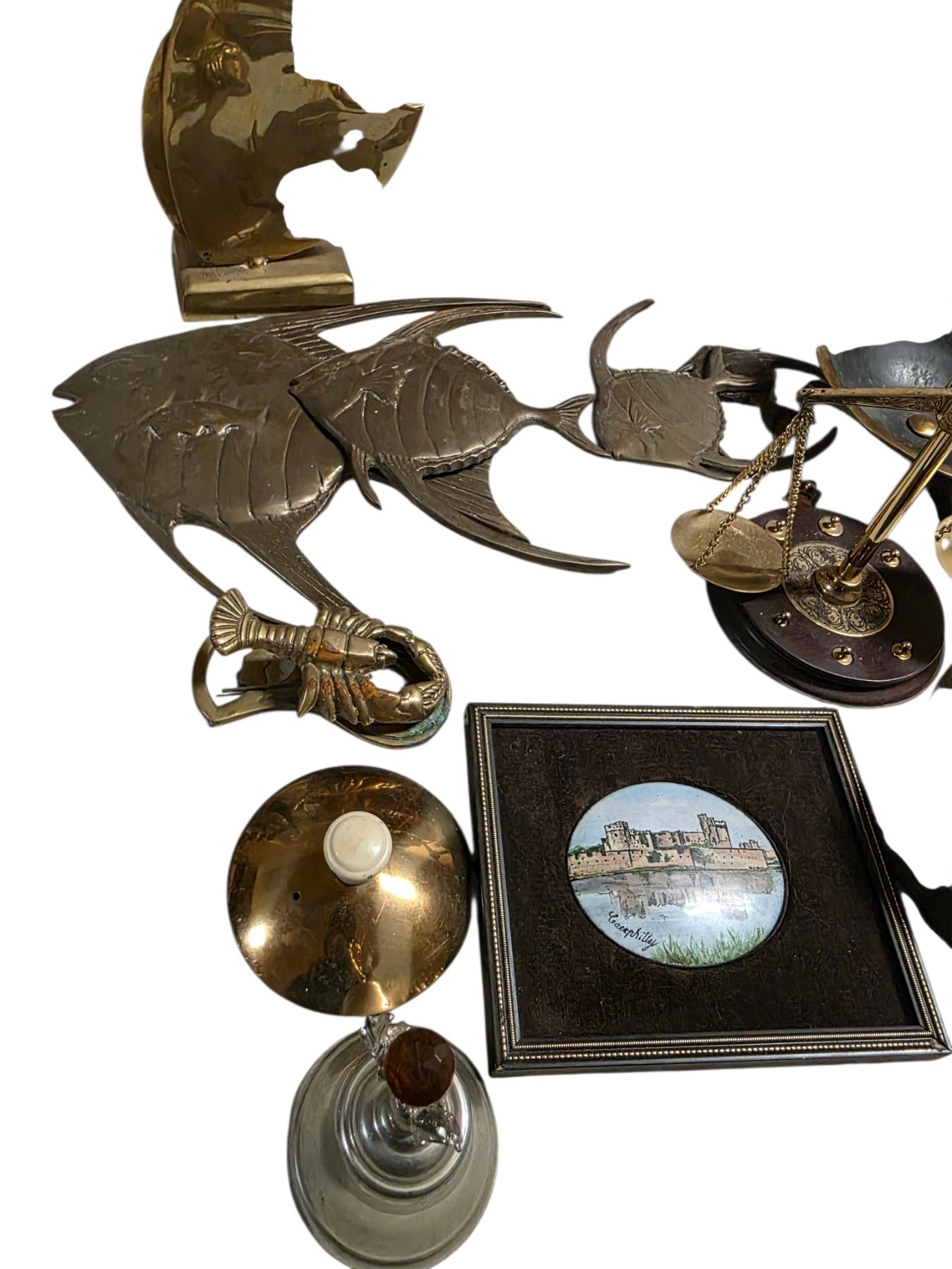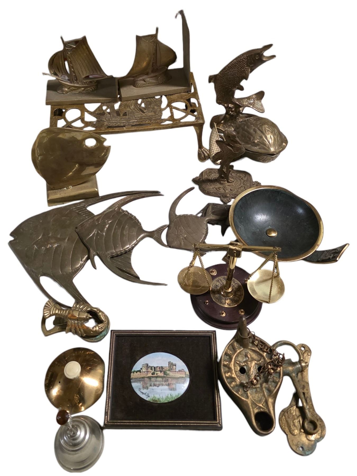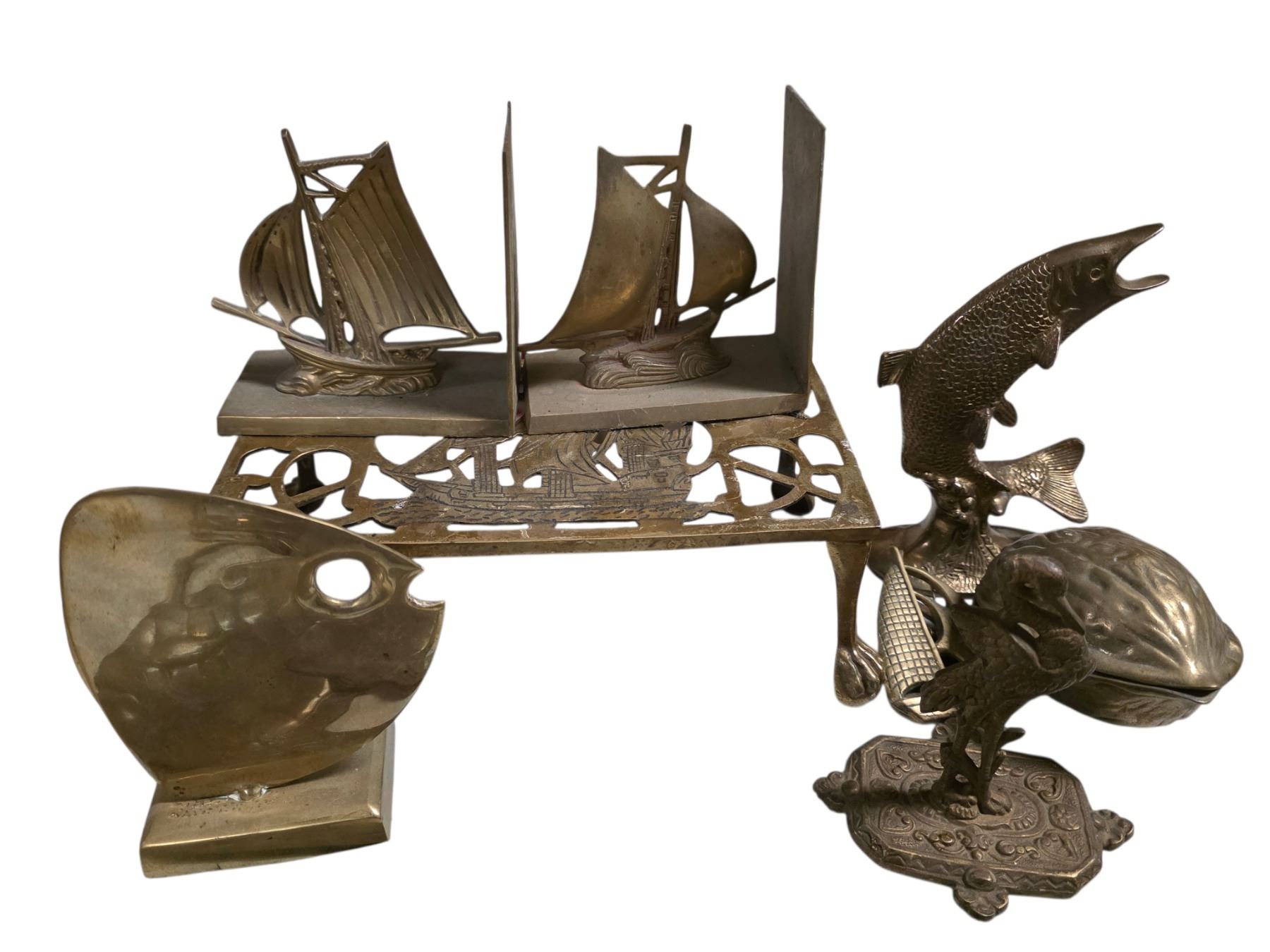 Mixed Brass Decor & Desk Items Including Bookends, Fish Figures, Scale & Assorted Metalware