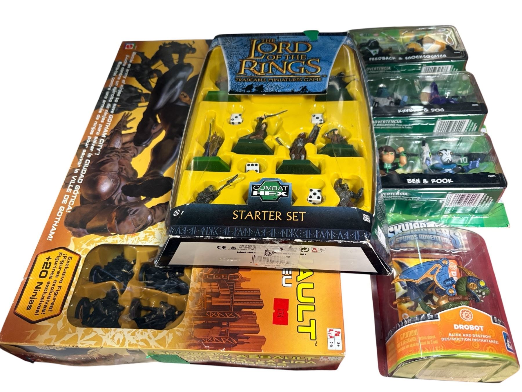 This collection includes action figures and toys from popular franchises. Features Lord of the Rings figures, Skylanders characters, and items related to the Shadow Assault game and Ben 10 series. Assorted designs and characters from multiple franchises, likely spanning various years of production.