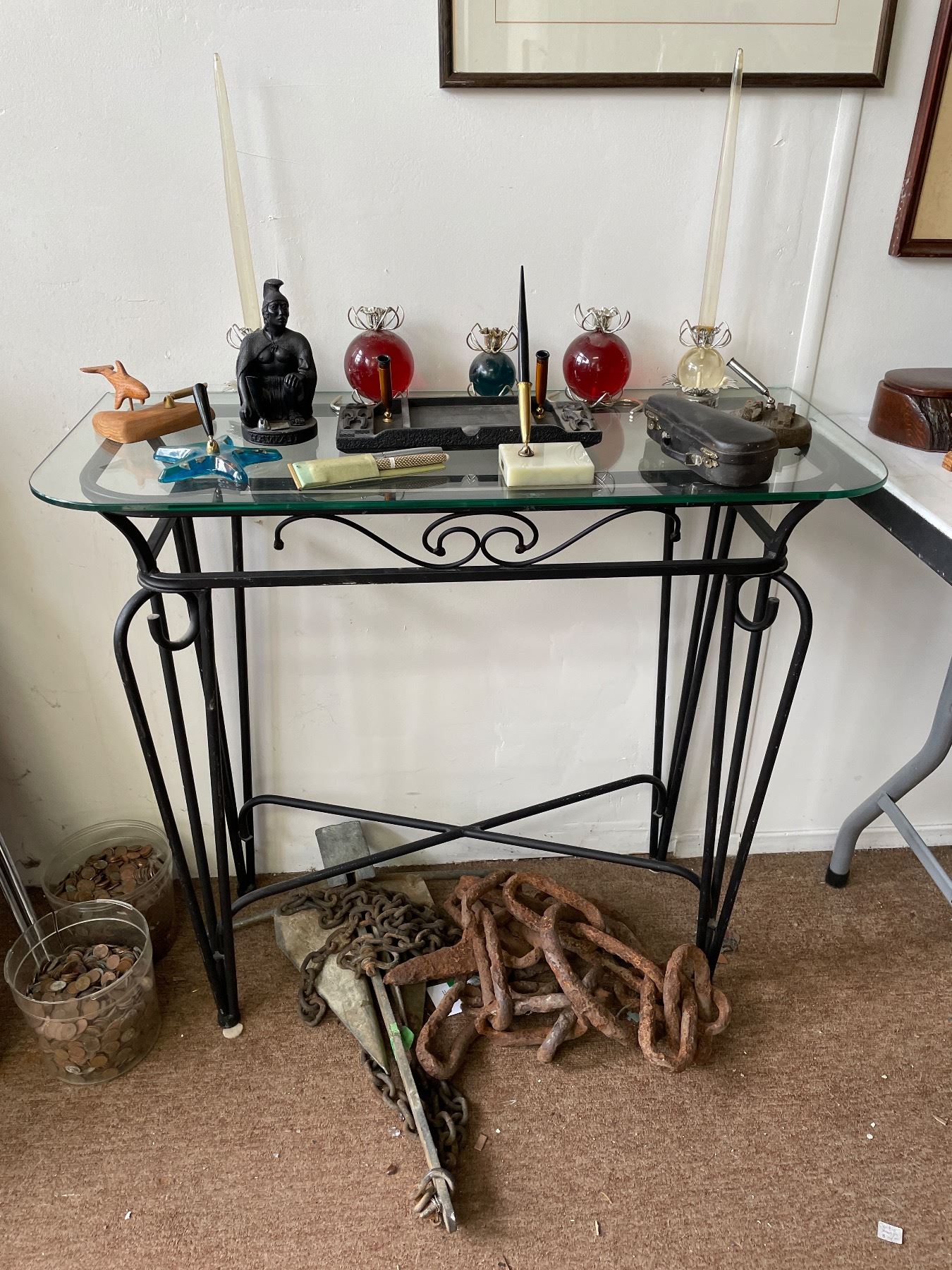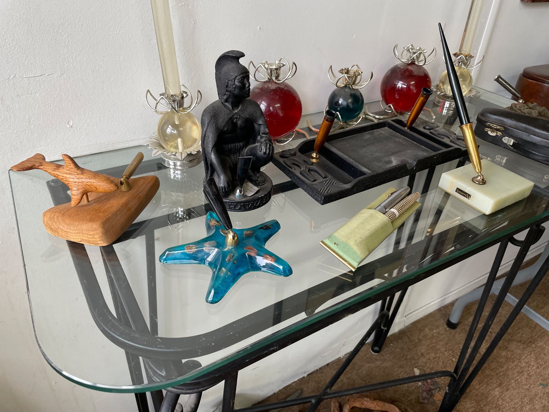 Mixed Decorative Desk & Glassware Lot incl. Art Glass Orbs, Candlesticks & Pen Set